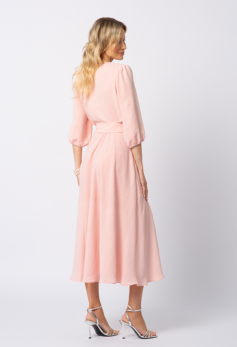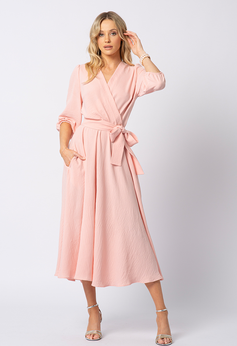 Jeśli lubisz ponadczasowe, uniwersalne fasony i kolory to ta sukienka jest właśnie dla Ciebie. Klasyczny krój, kopertowy dekolt, rozkloszowana spódnica, pięknie zachowująca się w ruchu. Wyjątkowym atutem tej sukienki są umieszone po bokach kieszenie, które przecież każda z nas uwielbia. W talii przewiązywana jest paskiem z tego samego materiału, dzięki czemu idealnie podkreślona zostaje kobieca sylwetka. Pasek można uformować w kokardę - bardzo elegancko, bądź tylko przewiązać.