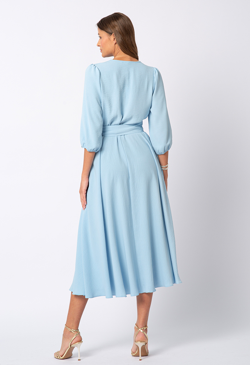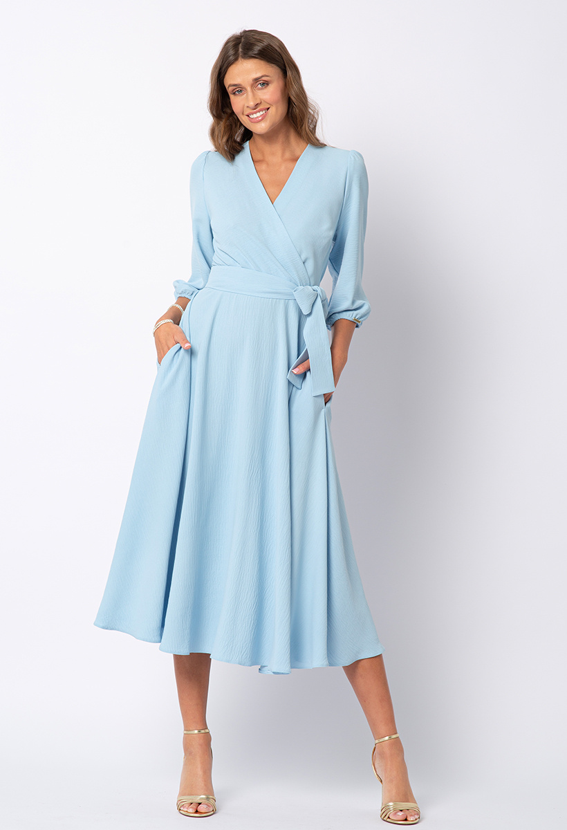 Jeśli lubisz ponadczasowe, uniwersalne fasony i kolory to ta sukienka jest właśnie dla Ciebie. Klasyczny krój, kopertowy dekolt, rozkloszowana spódnica, pięknie zachowująca się w ruchu. Wyjątkowym atutem tej sukienki są umieszone po bokach kieszenie, które przecież każda z nas uwielbia. W talii przewiązywana jest paskiem z tego samego materiału, dzięki czemu idealnie podkreślona zostaje kobieca sylwetka. Pasek można uformować w kokardę - bardzo elegancko, bądź tylko przewiązać.