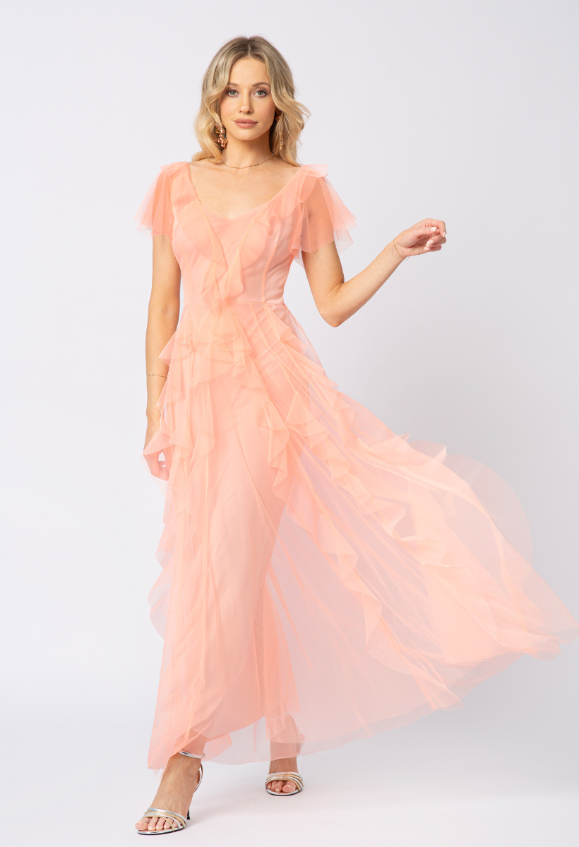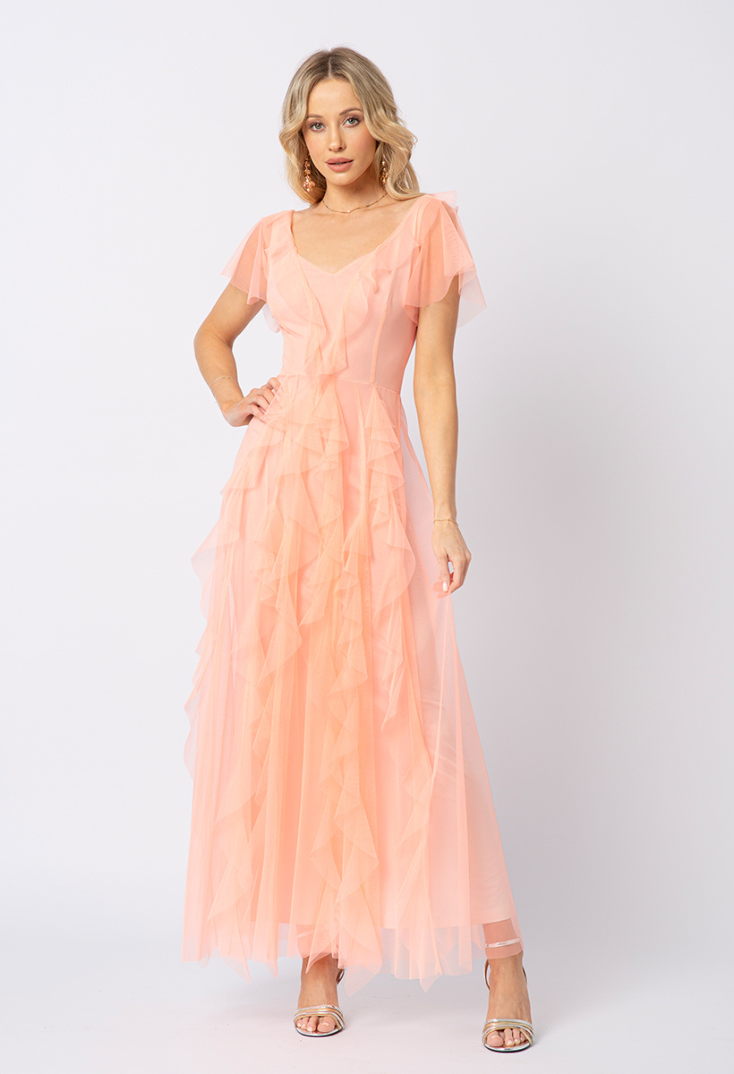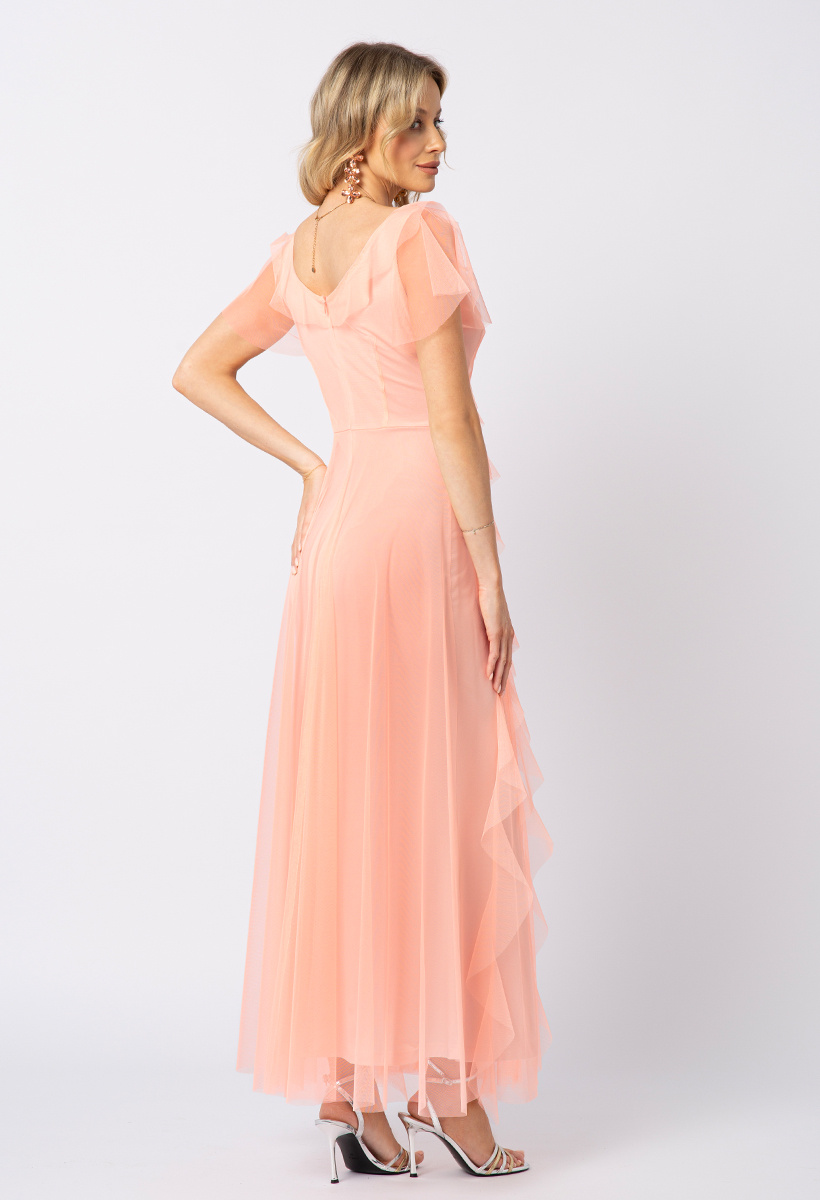 - Wykonana z delikatnego, zwiewnego materiału, tiulowa sukienka sprawi, że poczujesz się jak prawdziwa księżniczka. Charakteryzuje się długim, opadającym do ziemi fasonem, który nadaje jej szykowności i subtelnej romantyczności.