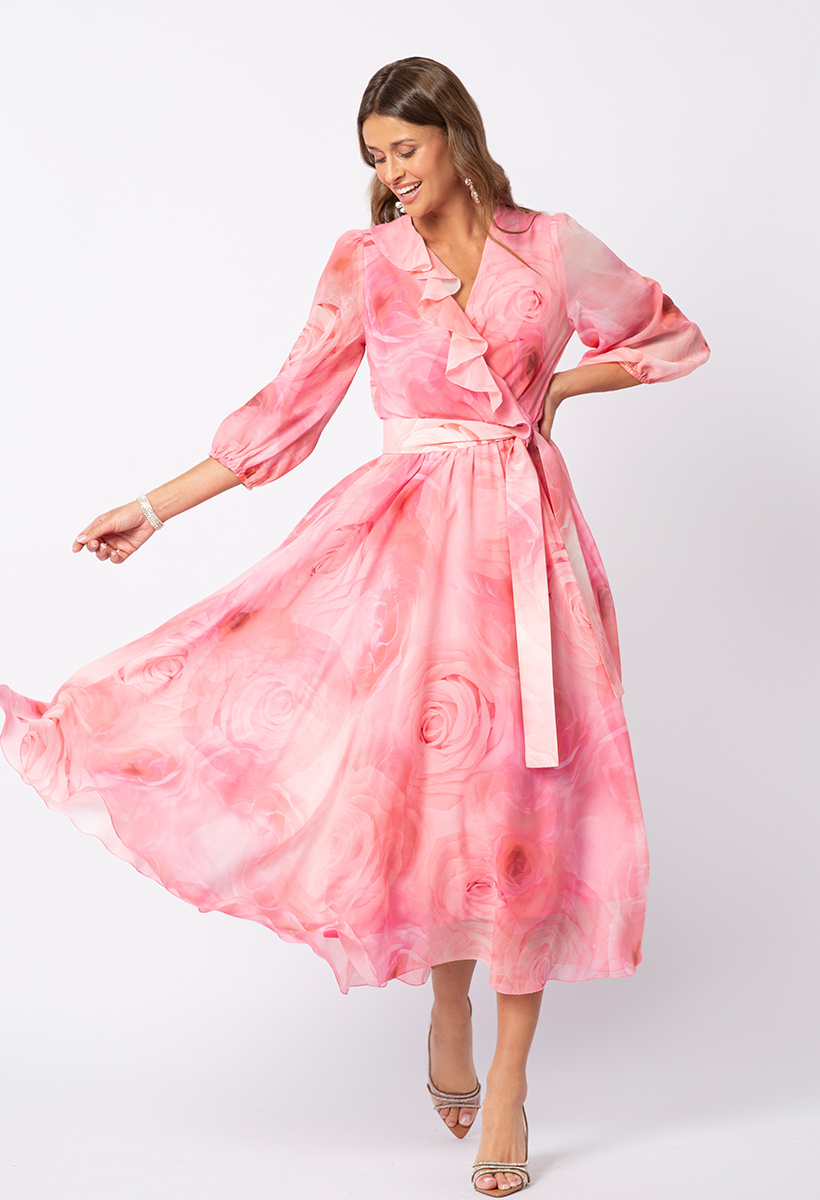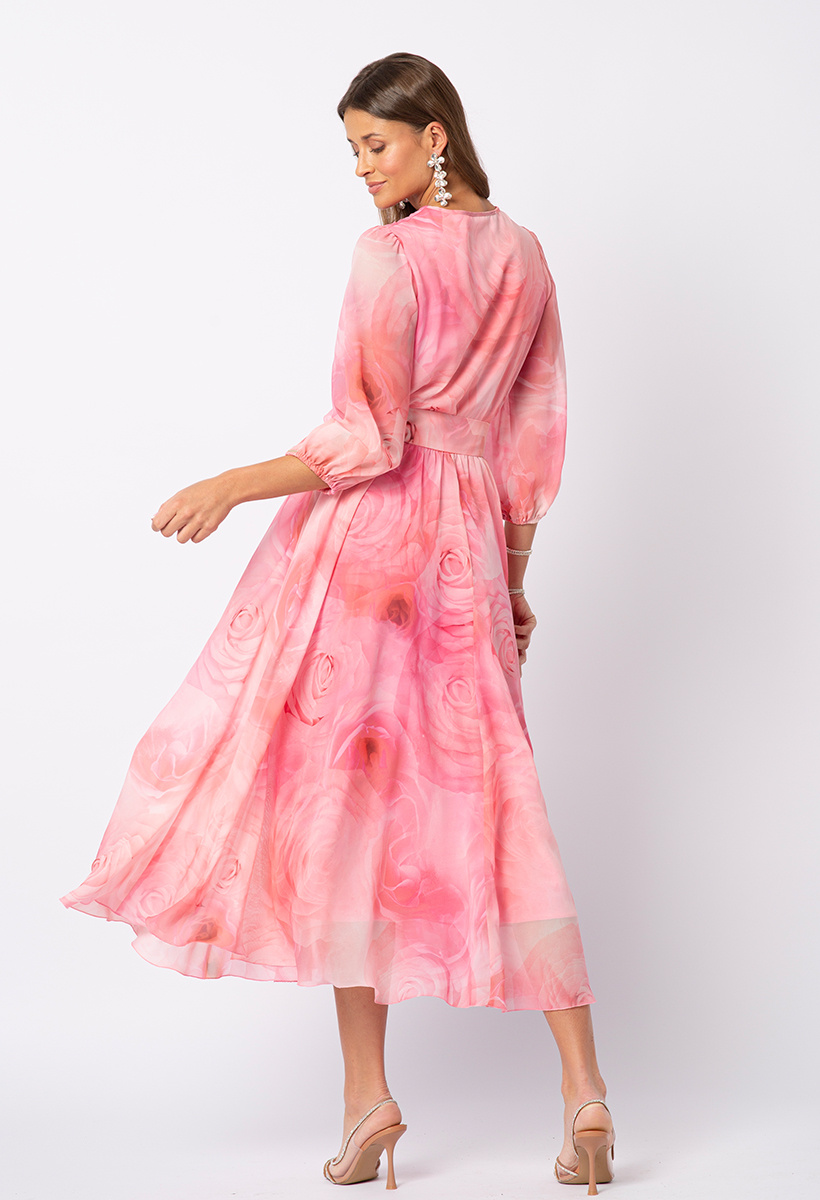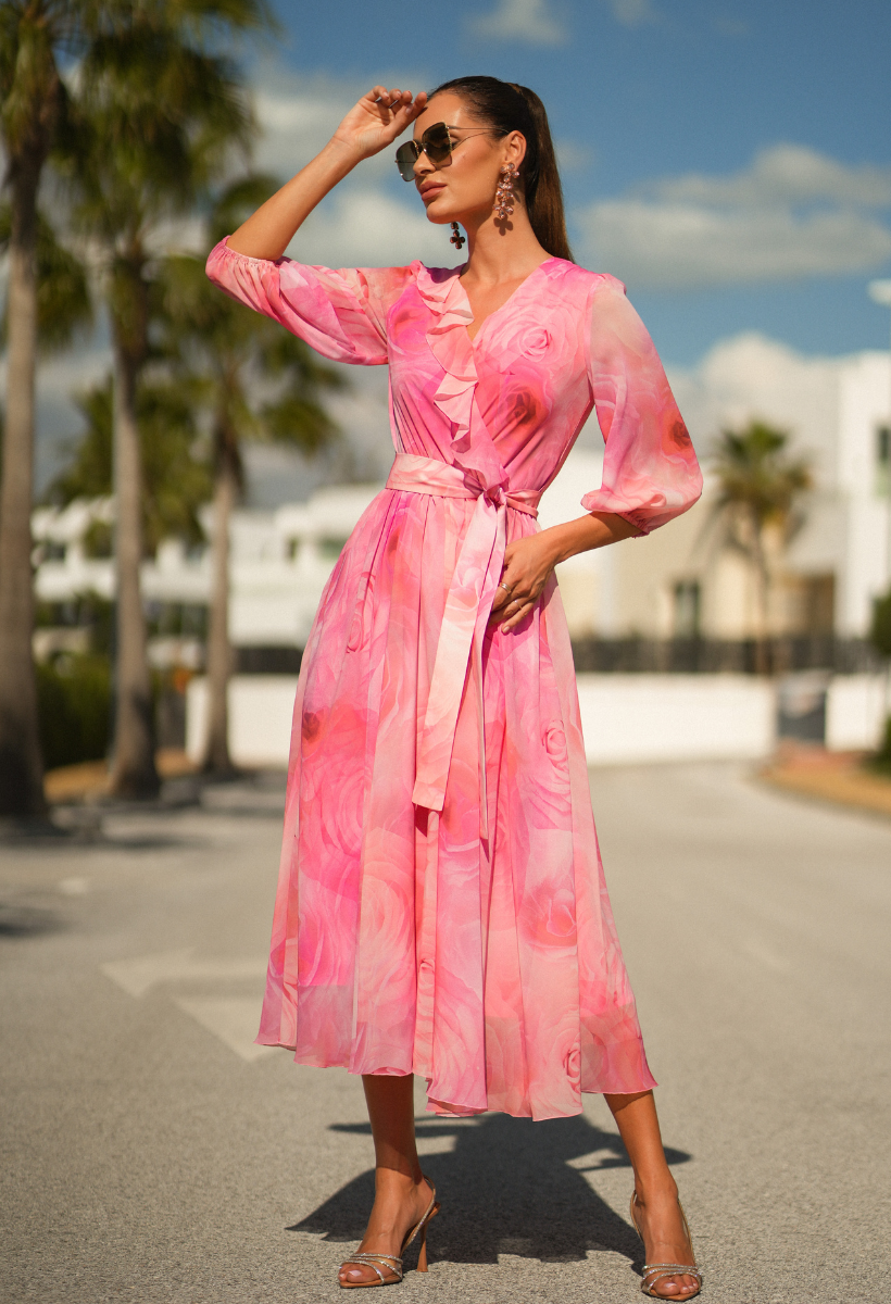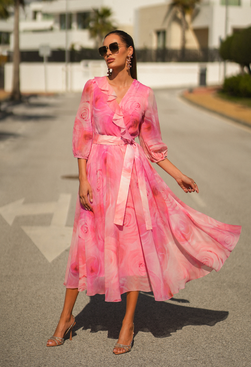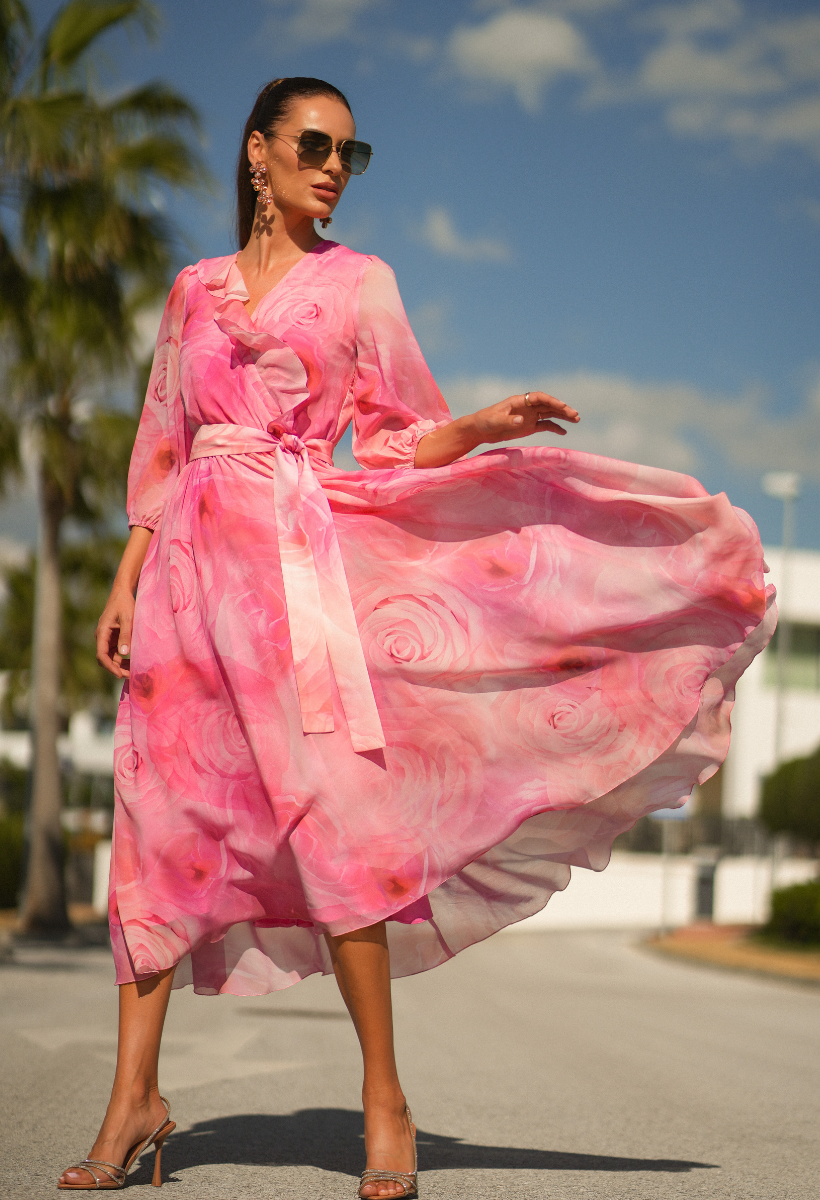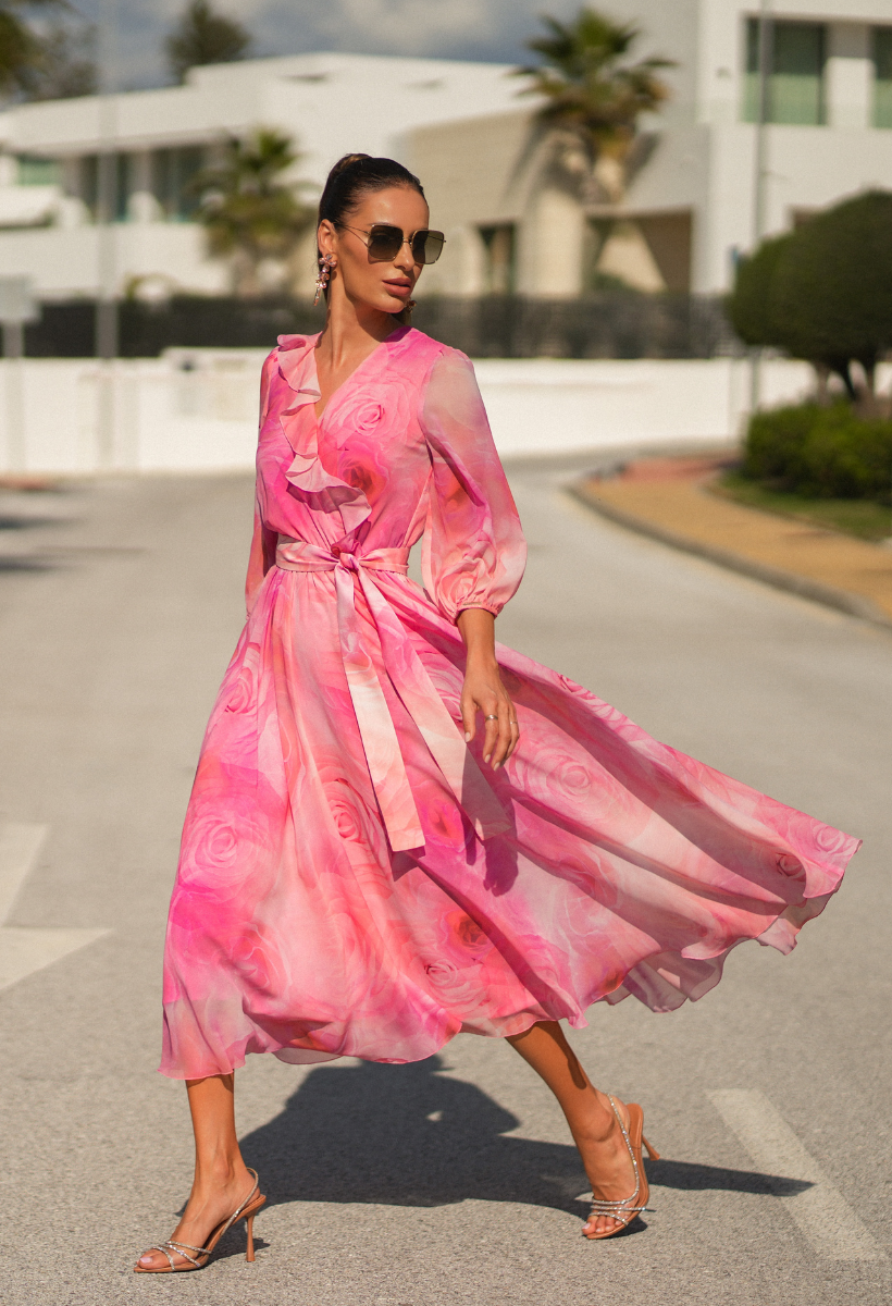 Lekkość, romantyzm i kwiatowa subtelność w jednym. Sukienka Fleur to esencja kobiecości – zwiewny, delikatny szyfon w różowe kwiaty otula sylwetkę, zapewniając wyjątkowy komfort noszenia. Długość midi i rozkloszowany dół pięknie układają się w ruchu, a idealnie dopasowana podszewka podkreśla głębię kolorów i gwarantuje wygodę. Kopertowy dekolt ozdobiony subtelną falbaną po jednej stronie, dodaje sukience finezji, a gumka w talii wraz z paskiem z tego samego materiału pozwalają na idealne dopasowanie do sylwetki. Delikatnie przezroczyste rękawy o długości 3/4 zakończone gumką dopełniają romantyczny charakter tej kreacji. Idealny wybór na wyjątkowe okazje, letnie przyjęcia czy romantyczne wyjścia.