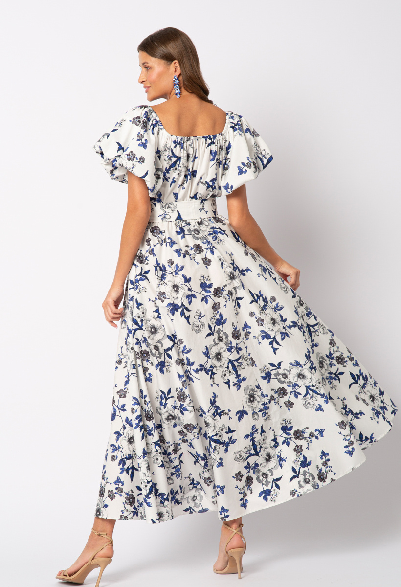 Biała sukienka z bawełny w granatowe kwiaty z bufiastym rękawkiem Marilla