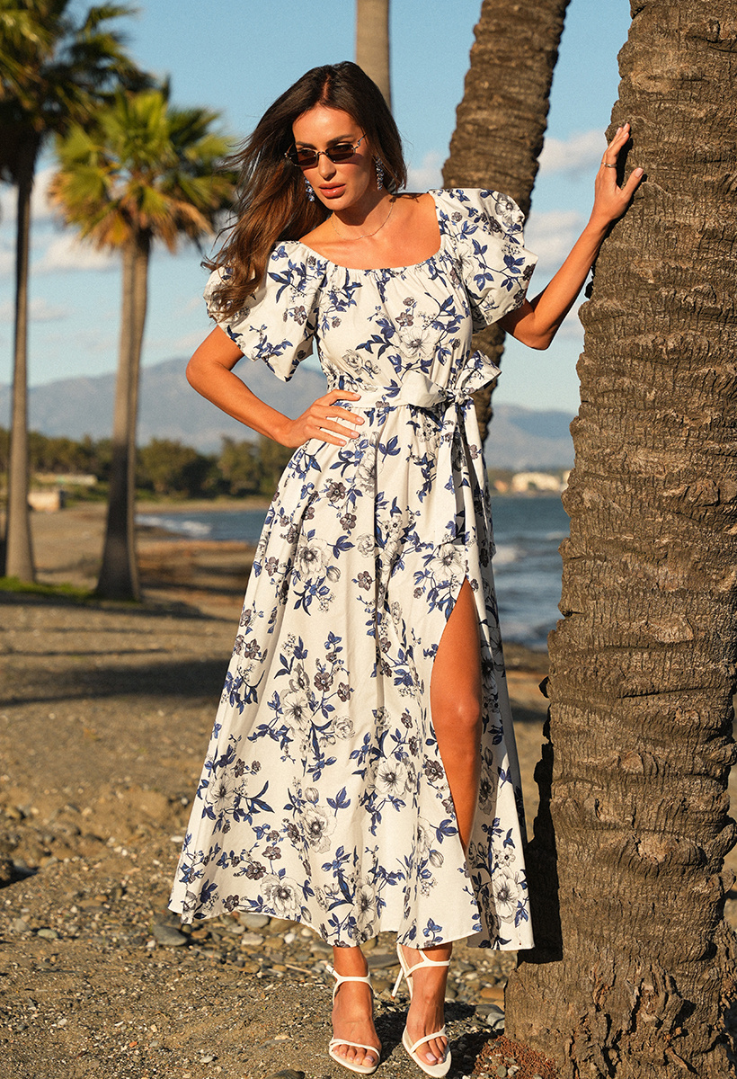 Romantyzm i kobiecość w doskonałej harmonii. Zwiewna, pełna wdzięku i niezwykle kobieca – sukienka Malia to kwintesencja romantycznego stylu. Długi, rozkloszowany dół z efektownym rozcięciem subtelnie eksponuje nogę, dodając sylwetce lekkości i powabu. Gumka w talii pięknie podkreśla figurę, a pasek z tego samego materiału możesz zawiązać na kokardę dla dziewczęcego akcentu lub na płasko dla bardziej minimalistycznego looku. Krótkie bufiaste rękawy dodają sukience uroku i można je nosić na dwa sposoby – zakrywając ramiona lub opuszczając niżej, by zmysłowo je odsłonić. Idealna na wyjątkowe okazje i letnie wieczory!