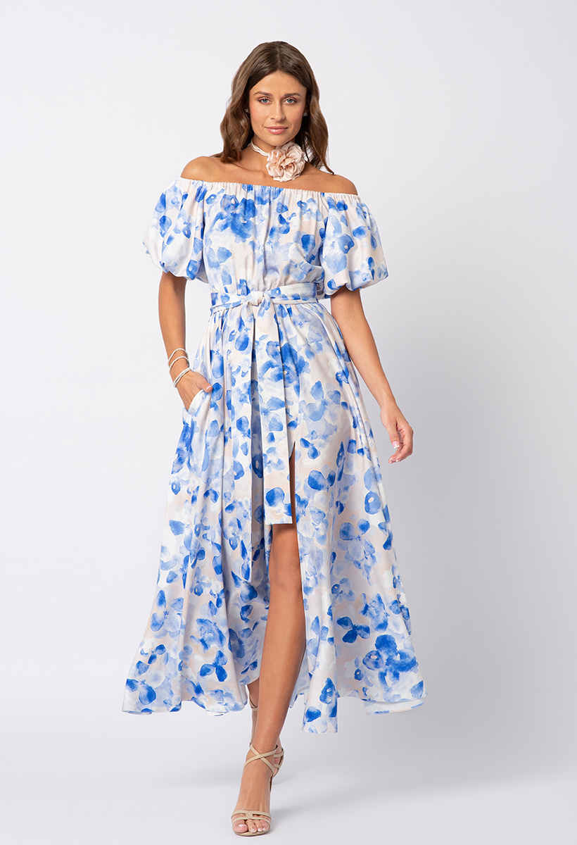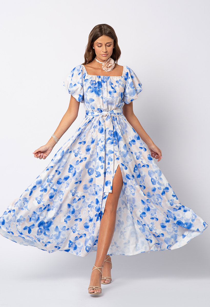 Sukienka w niebieskie kwiaty z bufiastym rękawkiem Malia
