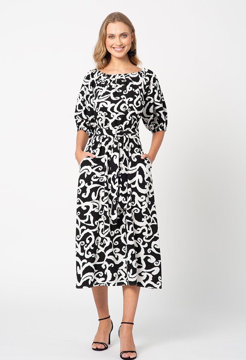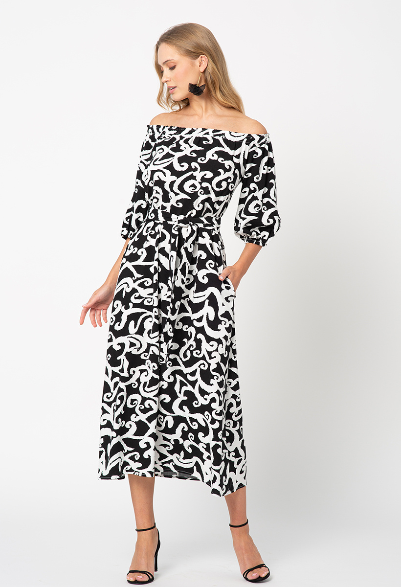- Zachwyca monochromatycznym, abstrakcyjnym wzorem. Dekolt w stylu carmen dodaje subtelnej zmysłowości, pozwalając na wybór między odsłonięciem lub zakryciem ramion, w zależności od preferencji i okazji. Pasek w talii pięknie akcentuje kobiecą sylwetkę.