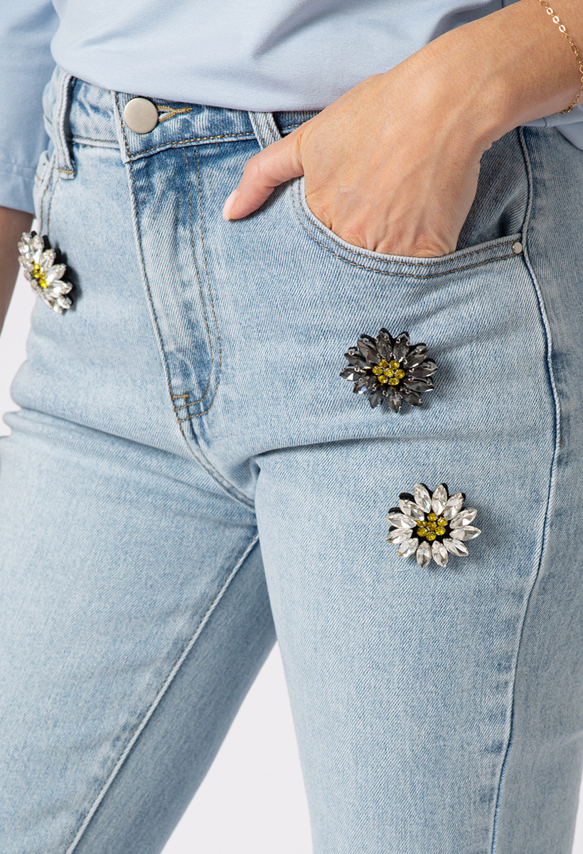 Zainspiruj się blaskiem i swobodą – jeansowe spodnie z ozdobnymi, kryształowymi broszkami to połączenie miejskiego stylu z nutą glamour. Wysoki stan podkreśla talię, a fason flare pięknie wydłuża nogi i dodaje sylwetce lekkości. Odpinane broszki przy kieszeniach pozwalają na zabawę modą – możesz je dowolnie przestawiać lub całkiem zdjąć, tworząc za każdym razem nową wersję spodni. Jasny denimowy odcień świetnie wpisuje się w wiosenno-letnie stylizacje.