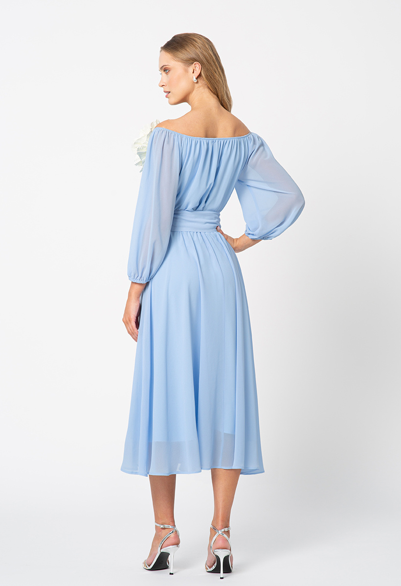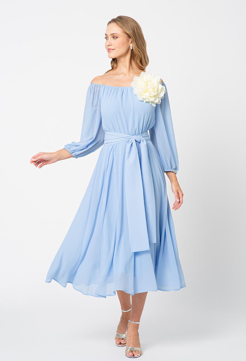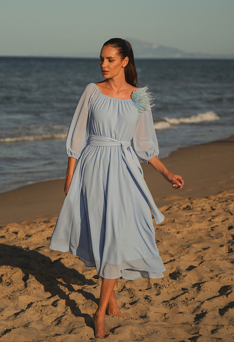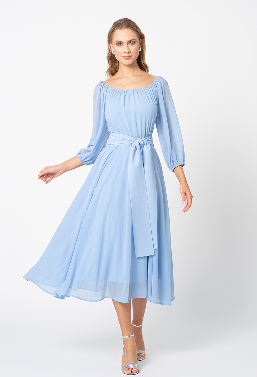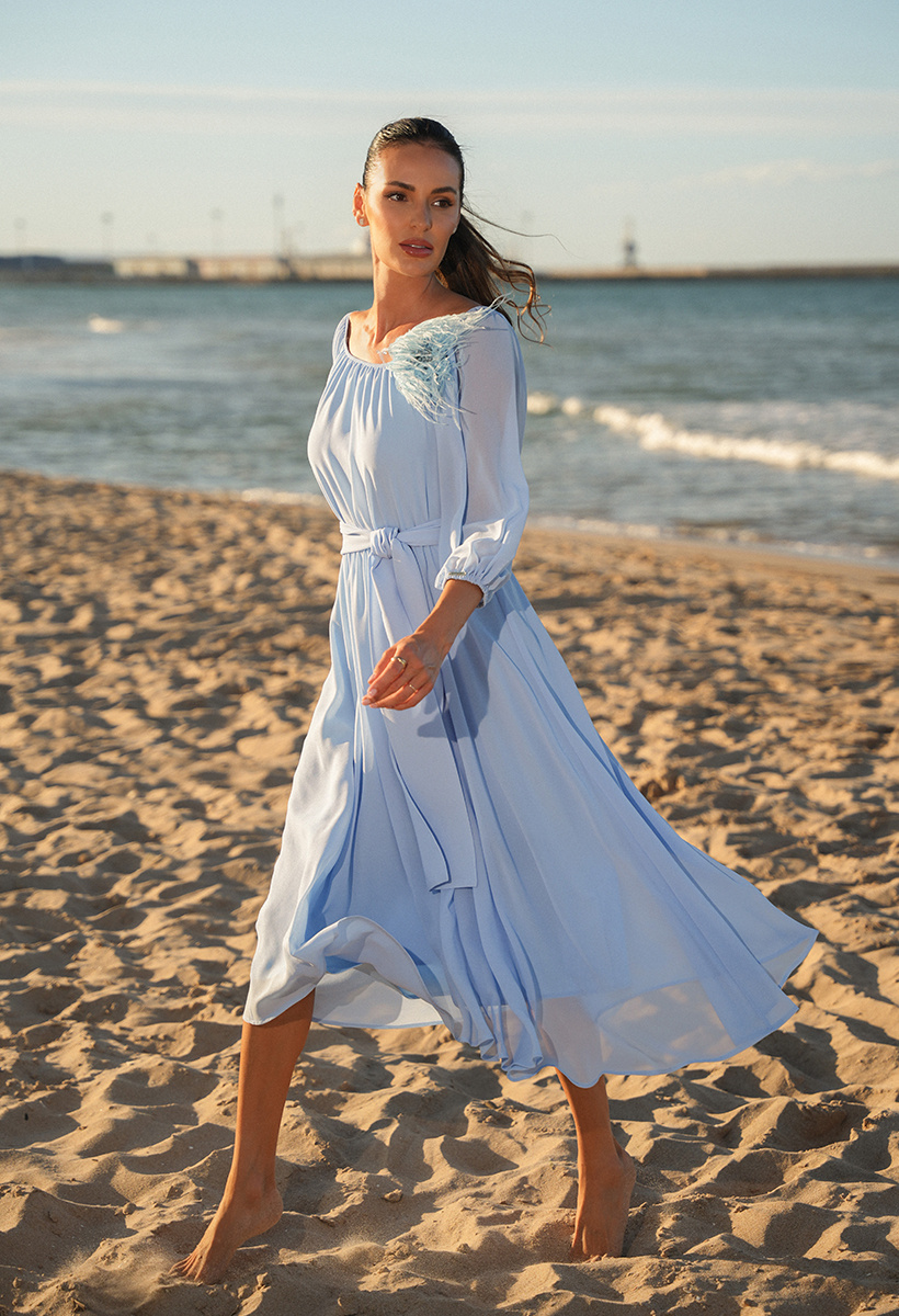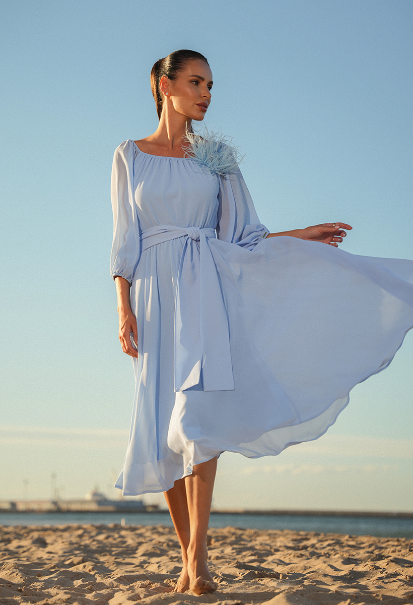 Sukienka z szyfonu w błękitnym odcieniu, prezentuje się niezwykle elegancko i wyrafinowanie. Jej gładka faktura nadaje jej klasycznego uroku, podczas gdy charakterystyczny szeroki pasek dodaje nuty nowoczesnego stylu i wyjątkowości. Rękawy o długości 3/4 zakończone delikatną gumką dodają lekkości i subtelności całej sukience. Ich bufiasty kształt nadaje dodatkowego uroku, podkreślając delikatność stylizacji. Dekolt o klasycznym, okrągłym kształcie delikatnie eksponuje obojczyki, dodając sukience wyjątkowego wdzięku i subtelności. Ta błękitna sukienka to idealny wybór dla kobiet poszukujących elegancji i wyrafinowania. Doskonale sprawdzi się na różnego rodzaju wyjątkowe okazje, podkreślając Twój indywidualny styl i wyjątkowy gust.