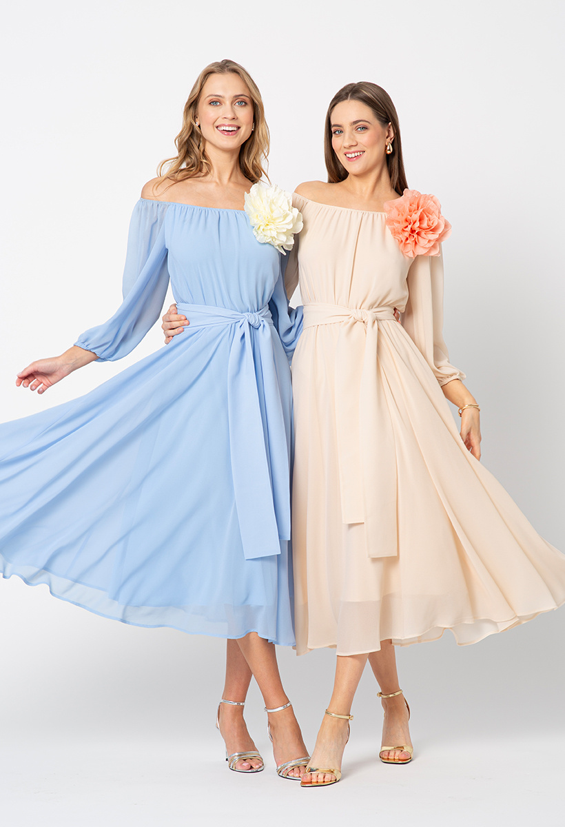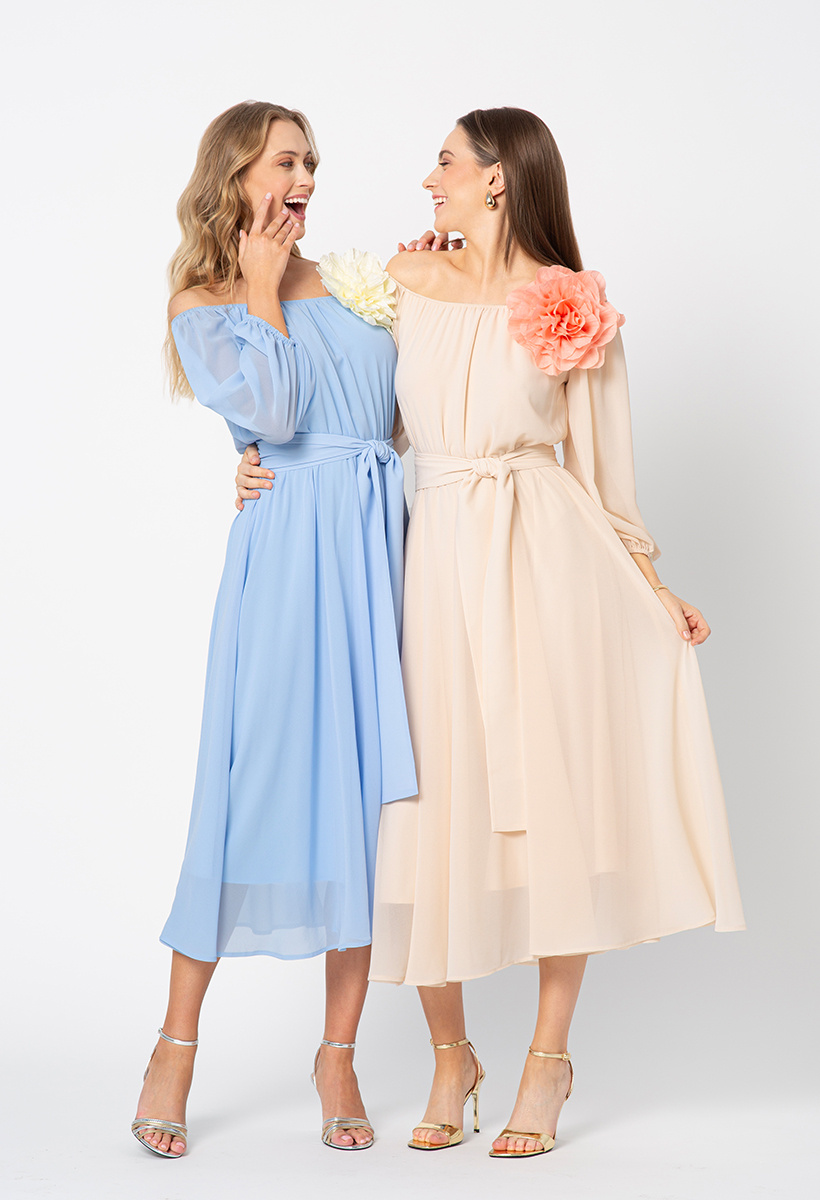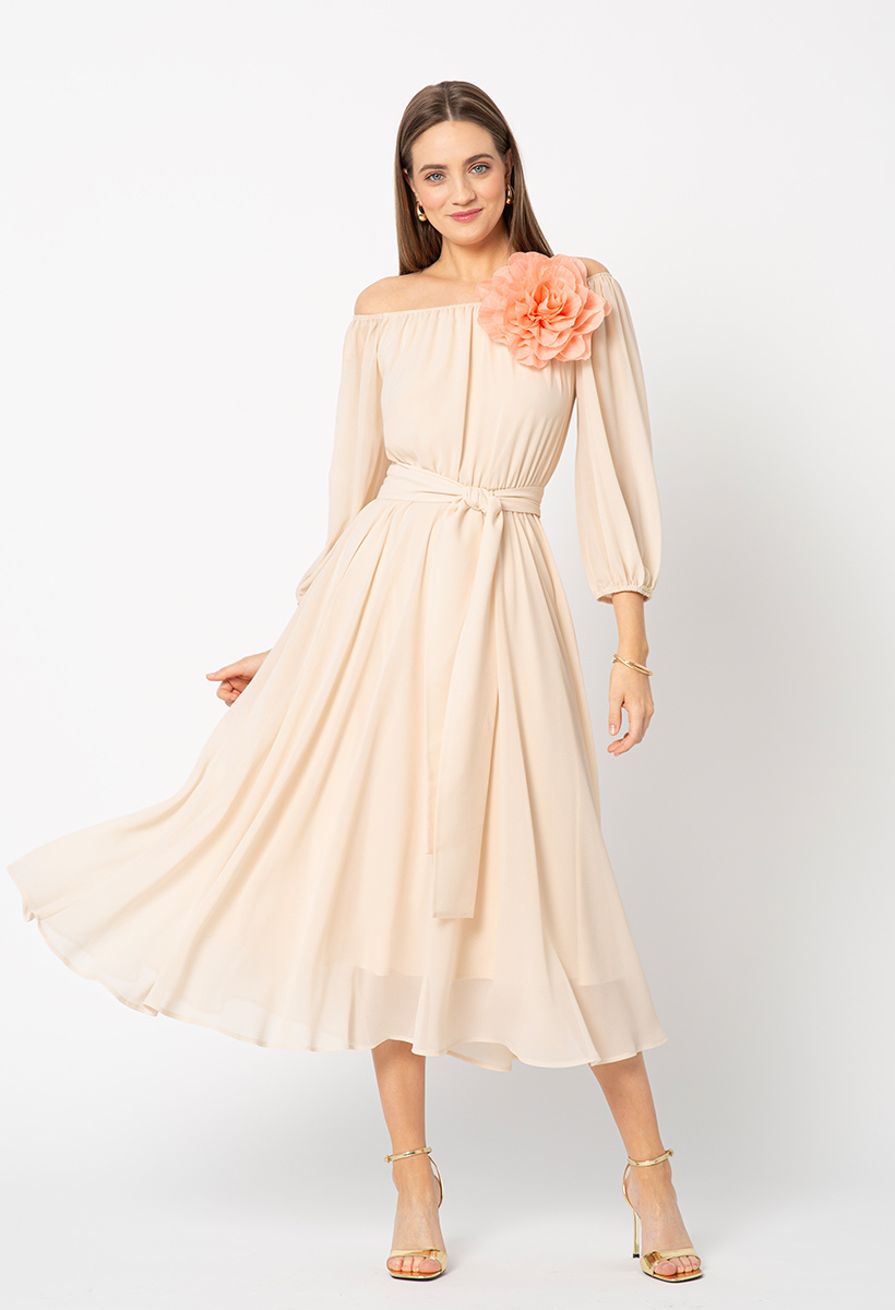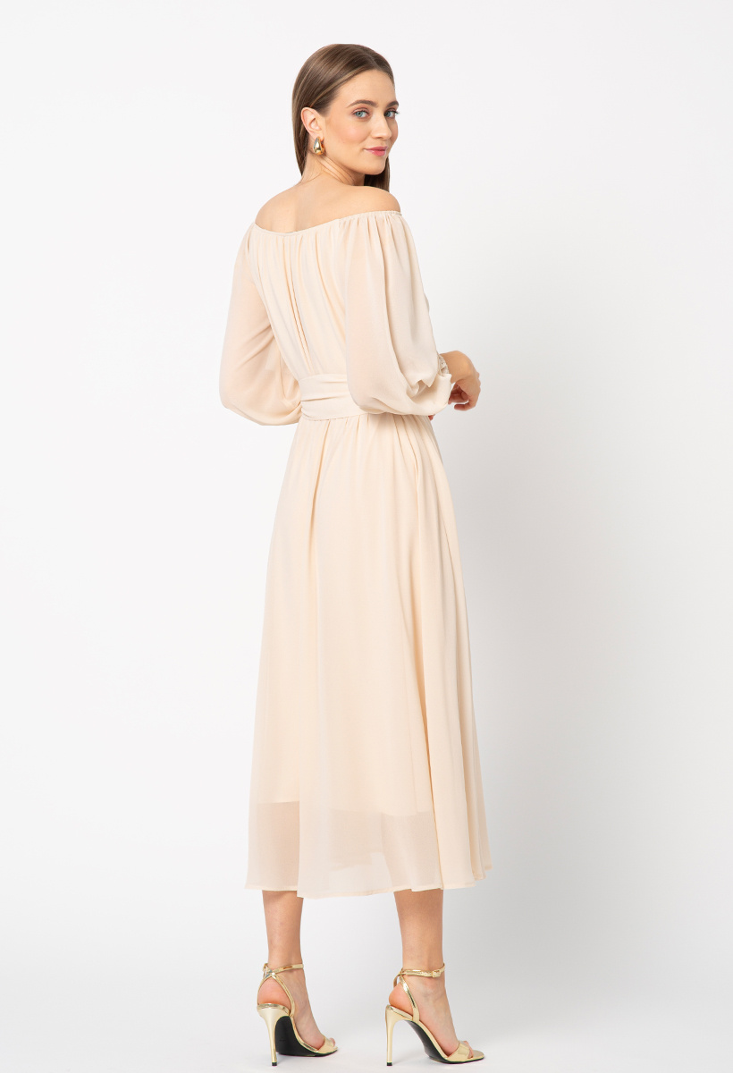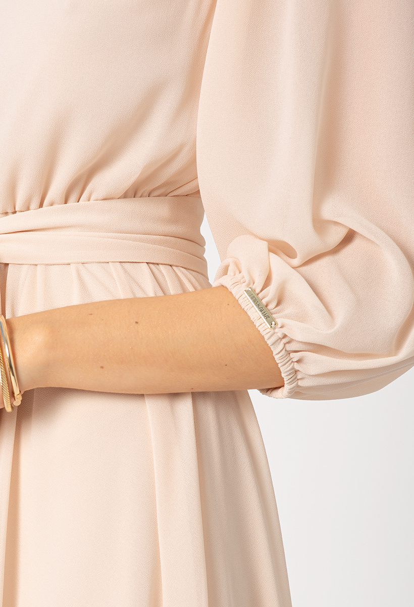 Sukienka z szyfonu w twarzowym beżowym odcieniu, prezentuje się niezwykle elegancko i wyrafinowanie. Jej gładka faktura nadaje jej klasycznego uroku, podczas gdy charakterystyczny szeroki pasek dodaje nuty nowoczesnego stylu i wyjątkowości. Rękawy o długości 3/4 zakończone delikatną gumką dodają lekkości i subtelności całej sukience. Ich bufiasty kształt nadaje dodatkowego uroku, podkreślając delikatność stylizacji. Dekolt o klasycznym, okrągłym kształcie delikatnie eksponuje obojczyki, dodając sukience wyjątkowego wdzięku i subtelności. Ta błękitna sukienka to idealny wybór dla kobiet poszukujących elegancji i wyrafinowania. Doskonale sprawdzi się na różnego rodzaju wyjątkowe okazje, podkreślając Twój indywidualny styl i wyjątkowy gust.