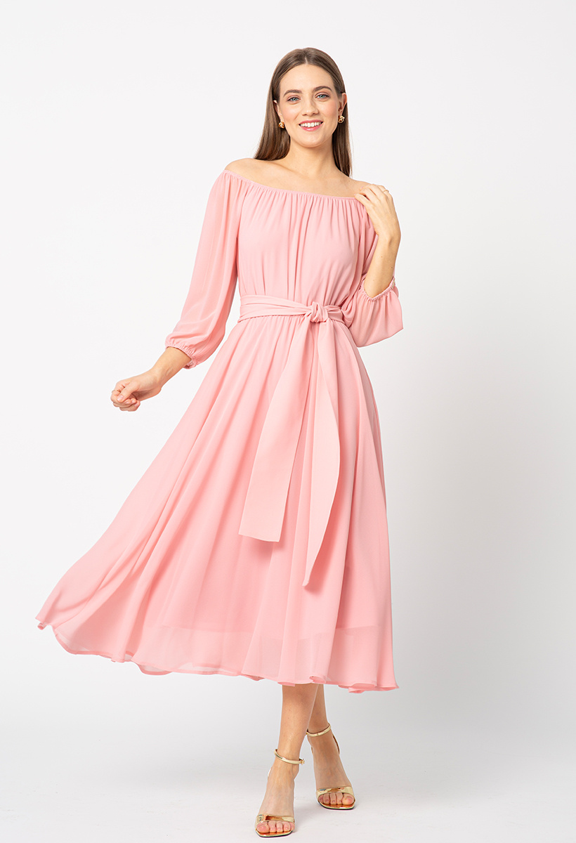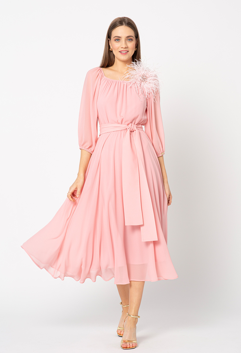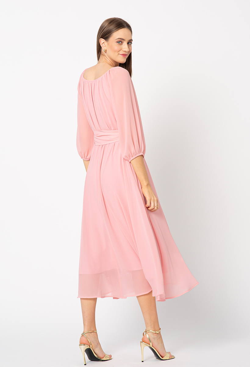 Sukienka z szyfonu w twarzowym pastelowo różowym odcieniu, prezentuje się niezwykle elegancko i wyrafinowanie. Jej gładka faktura nadaje jej klasycznego uroku, podczas gdy charakterystyczny szeroki pasek dodaje nuty nowoczesnego stylu i wyjątkowości. Rękawy o długości 3/4 zakończone delikatną gumką dodają lekkości i subtelności całej sukience. Ich bufiasty kształt nadaje dodatkowego uroku, podkreślając delikatność stylizacji. Dekolt o klasycznym, okrągłym kształcie delikatnie eksponuje obojczyki, dodając sukience wyjątkowego wdzięku i subtelności. Ta błękitna sukienka to idealny wybór dla kobiet poszukujących elegancji i wyrafinowania. Doskonale sprawdzi się na różnego rodzaju wyjątkowe okazje, podkreślając Twój indywidualny styl i wyjątkowy gust.