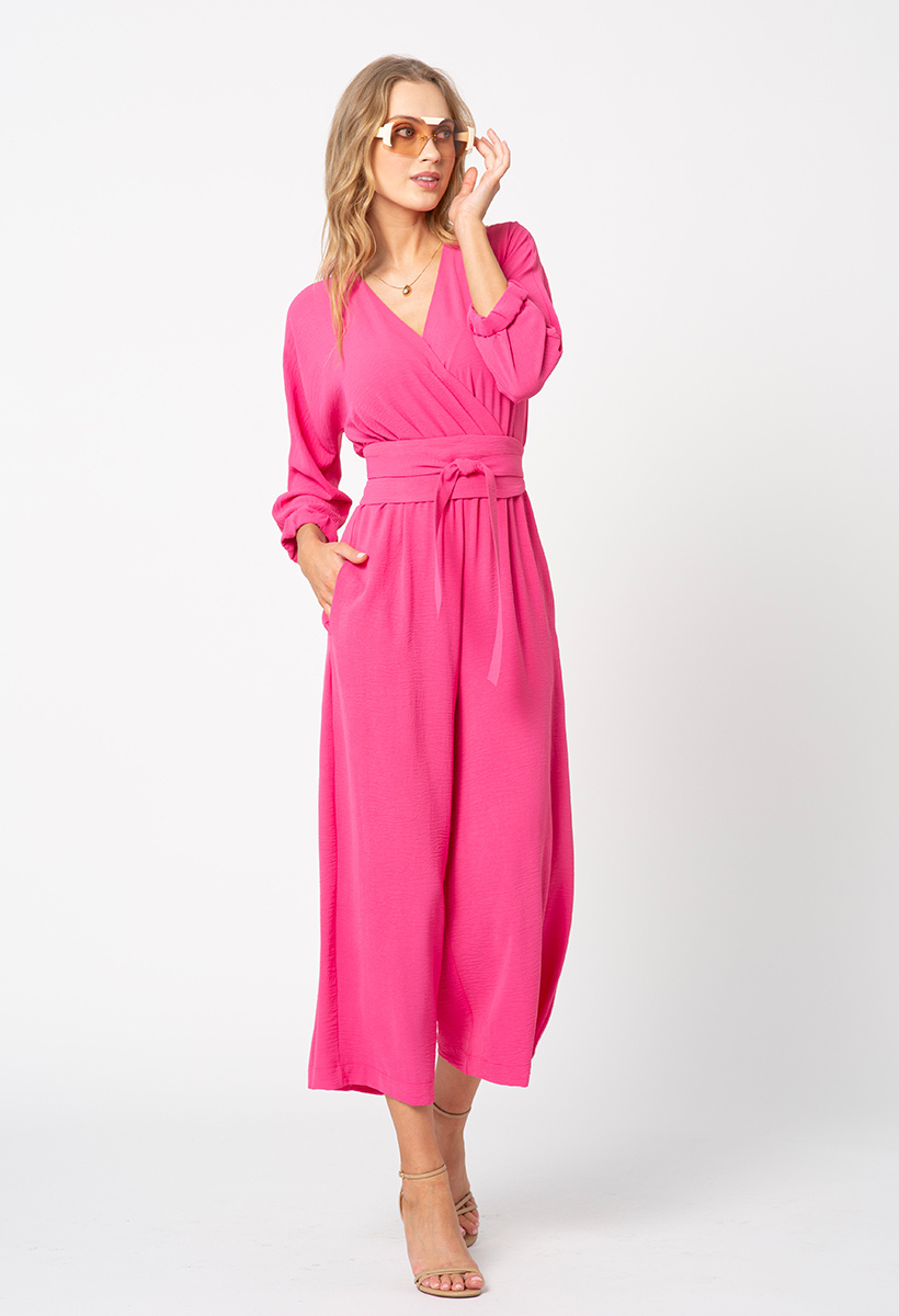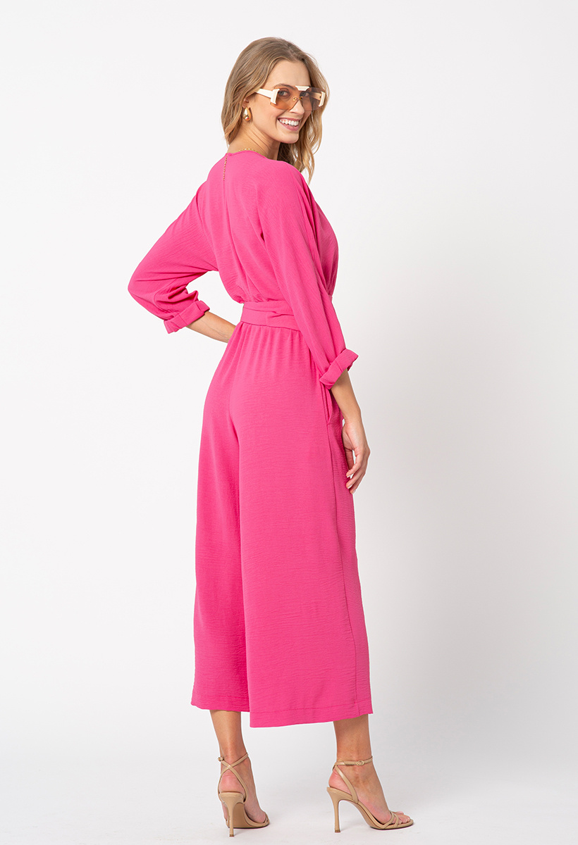 Kombinezon Emmy to propozycja, która łączy elegancję z nonszalancką wygodą. Uszyty z miękkiej, różowej tkaniny pięknie układającej się na sylwetce, zachwyca swoim dopracowanym krojem i nowoczesnym charakterem. Kopertowy dekolt dodaje mu kobiecego wdzięku, a szerokie nogawki nadają lekkości i zapewniają swobodę ruchów. Talia została podkreślona efektownym, szerokim paskiem typu japończyk – wiązanym z przodu – który pięknie modeluje sylwetkę i wprowadza niebanalny akcent. Rękawy 3/4 zakończone mankietami nadają całości klasy, a zapięcie na suwak z tyłu ułatwia zakładanie i zachowuje elegancką linię pleców. To idealny wybór na wyjątkowe wyjścia – od przyjęć po bardziej formalne okazje – kiedy chcesz wyglądać stylowo, ale czuć się swobodnie i komfortowo.