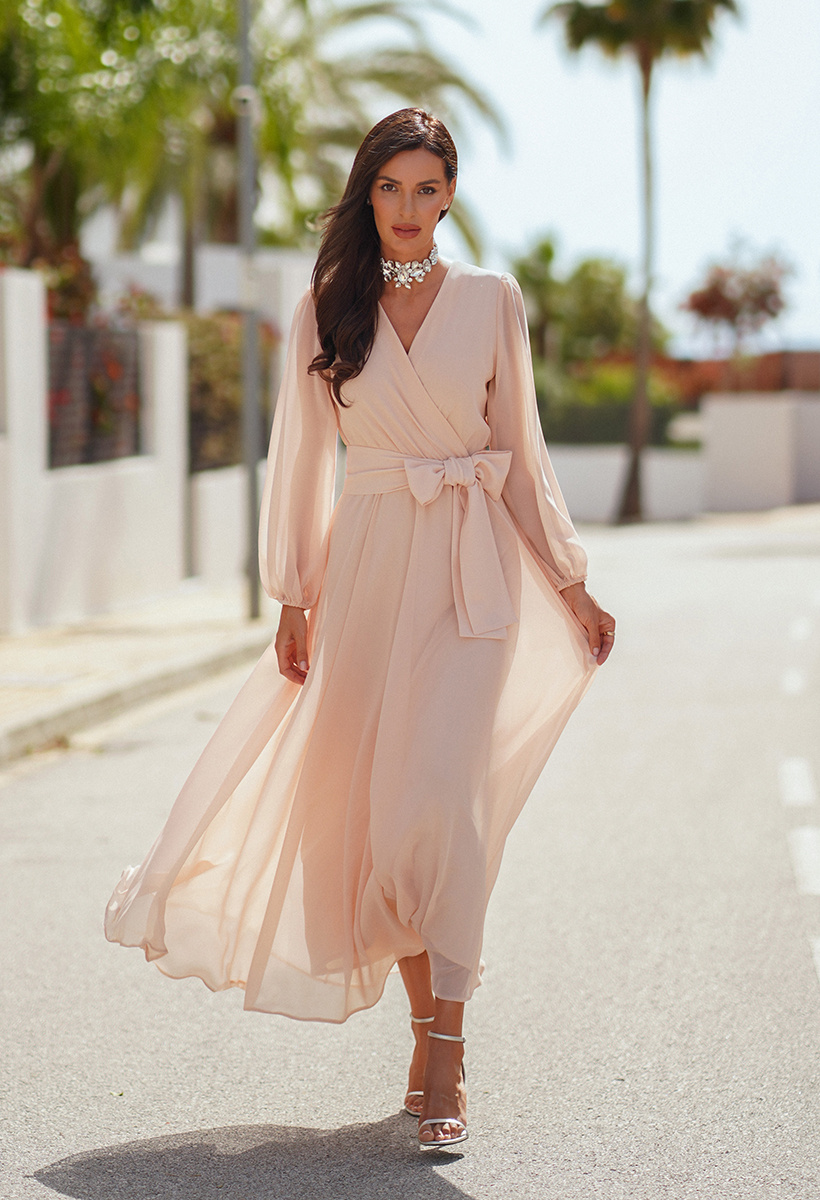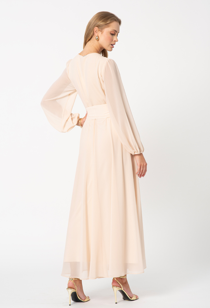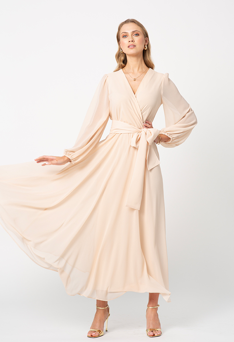 - Delikatny beż, lekkość i czysta elegancja. Długa, zwiewna, pełna subtelnego uroku. Zachwyca rozkloszowanym dołem, który pięknie faluje w ruchu, dodając sylwetce lekkości. To idealna sukienka na wesele, czy inną wyjątkową okazję.