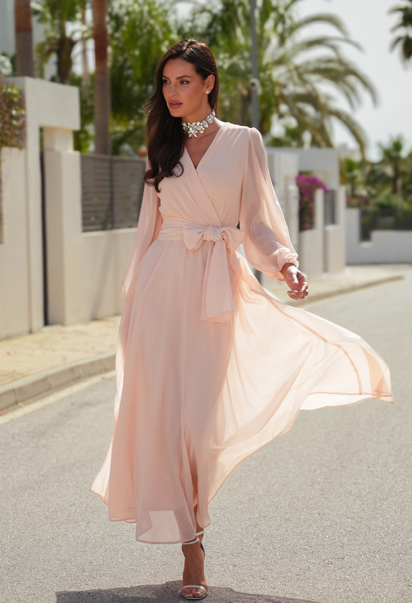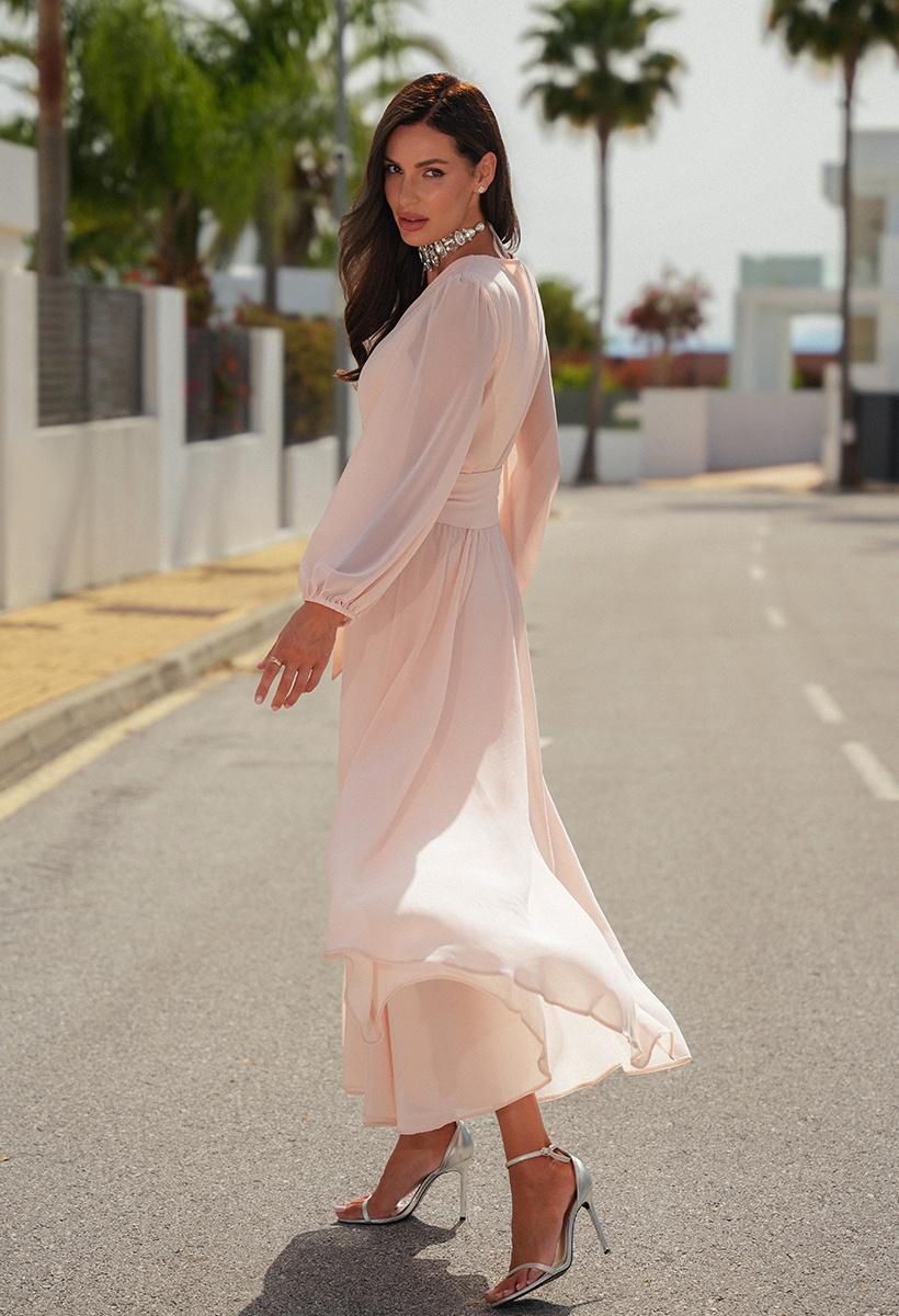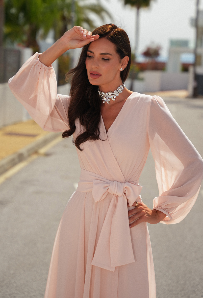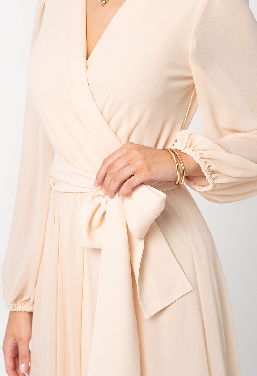 - Delikatny beż, lekkość i czysta elegancja. Długa, zwiewna, pełna subtelnego uroku. Zachwyca rozkloszowanym dołem, który pięknie faluje w ruchu, dodając sylwetce lekkości. To idealna sukienka na wesele, czy inną wyjątkową okazję.