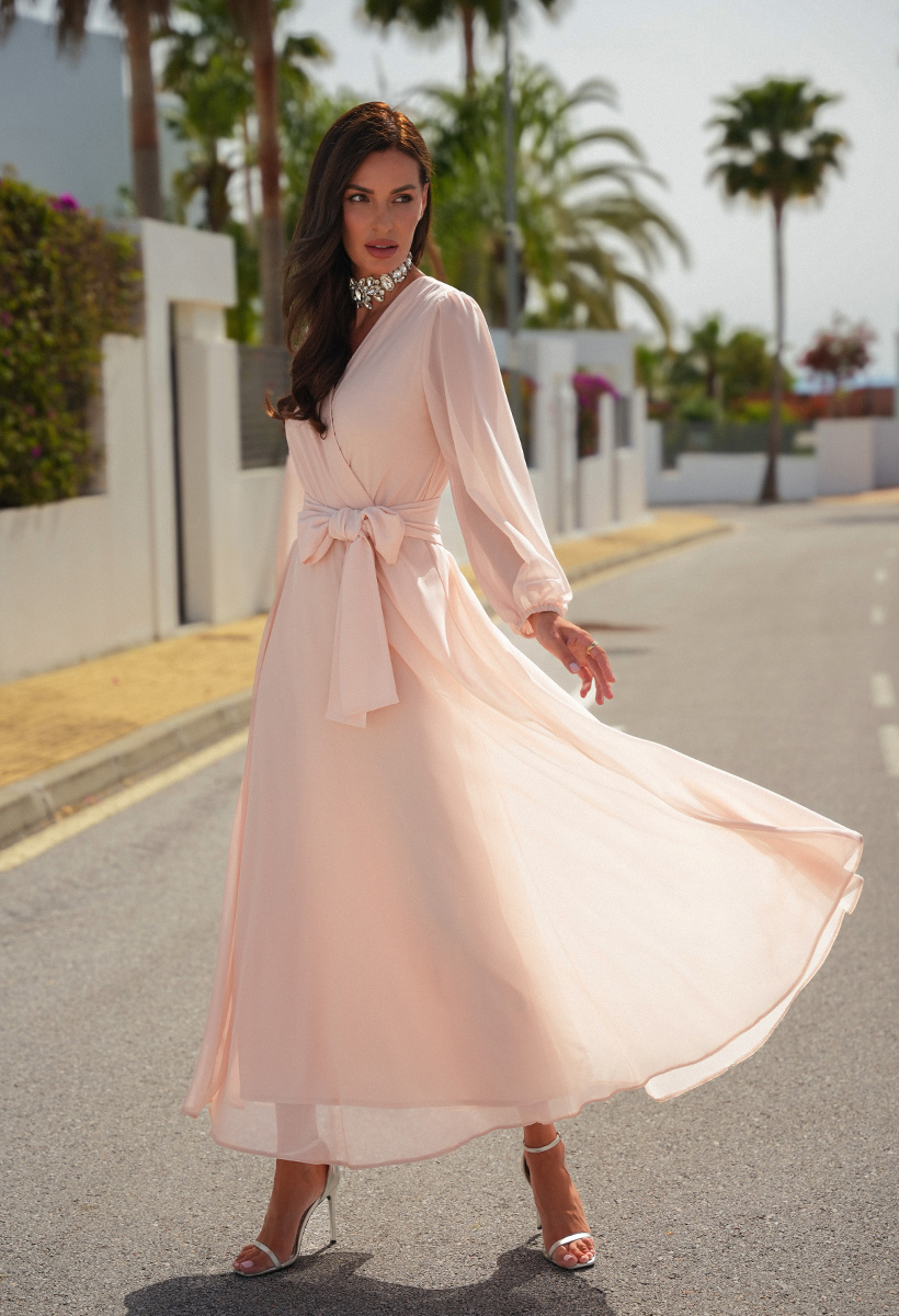 Kremowy, słodki beż niczym najpyszniejsze włoskie lody, lekkość i czysta elegancja. Długa, zwiewna, pełna subtelnego uroku. Ta maxi sukienka z delikatnego szyfonu zachwyca rozkloszowanym dołem, który pięknie faluje w ruchu, dodając sylwetce lekkości. Kopertowy dekolt subtelnie podkreśla linię szyi i dekoltu. Gumka w talii doskonale akcentuje kobiece kształty, szeroki pasek z tego samego materiału pozwala na zawiązanie efektownej kokardy. Długie, lekko bufiaste rękawy nadają romantycznego charakteru. Delikatny, przezroczysty szyfon nadaje całej sylwetce lekkości i wprowadza nutę zmysłowości. Perfekcyjnie dobrana podszewka gwarantuje maksymalny komfort, materiał jest niezwykle przyjemny dla skóry. Sydney to idealna sukienka na wesele, letnie przyjęcie czy każdą inną wyjątkową okazję w sezonie wiosna-lato 2025.