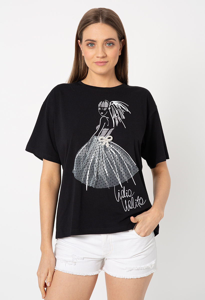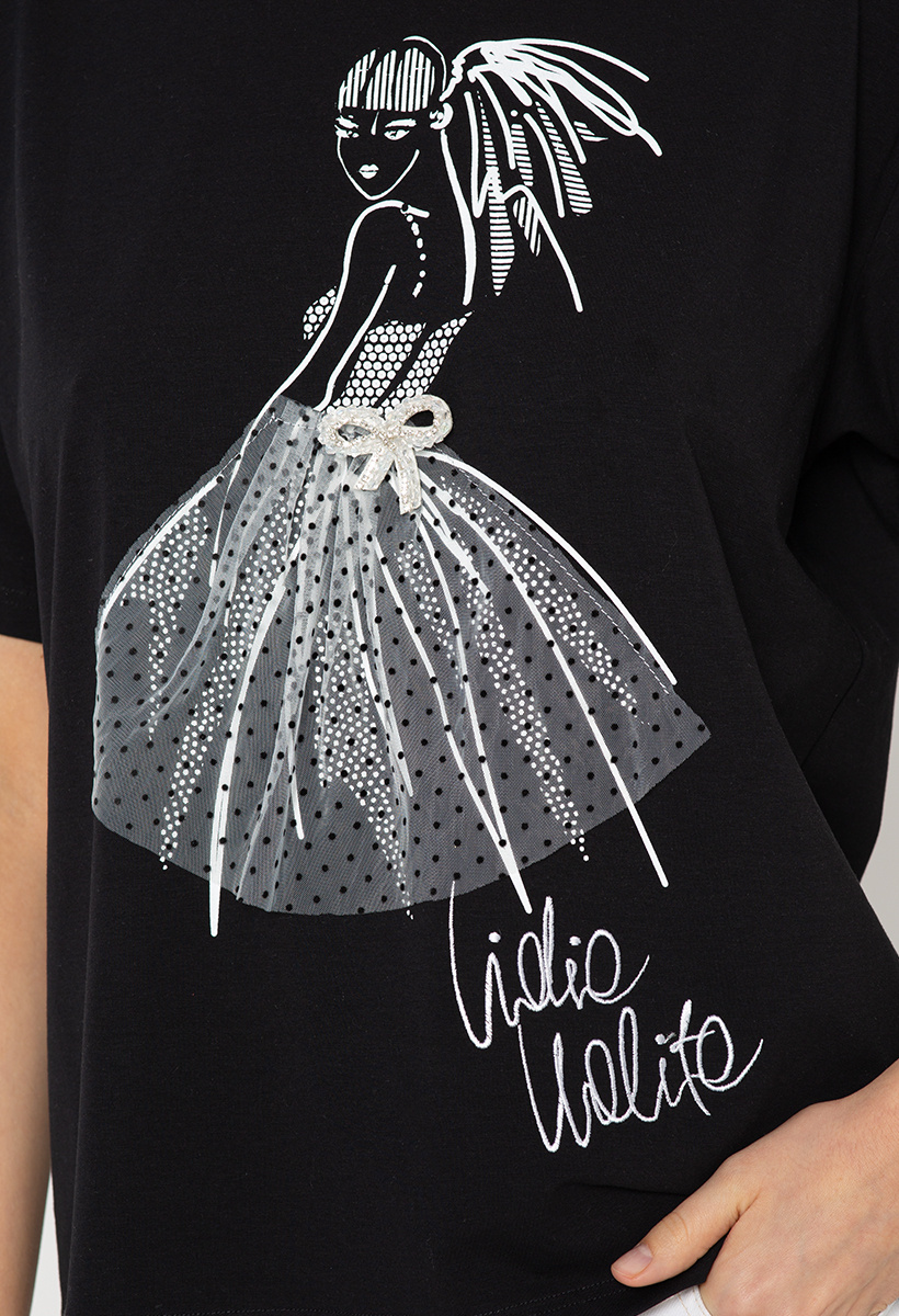 • „Lidia, zaprojektuj T-shirt, jakiego jeszcze nie było.” Jeden detal, który robi całą różnicę — autorski rysunek Lidii Kality z trójwymiarową aplikacją. Spódnica postaci została uszyta z lekkiego tiulu, dzięki czemu obraz ożywa i przyciąga spojrzenia.