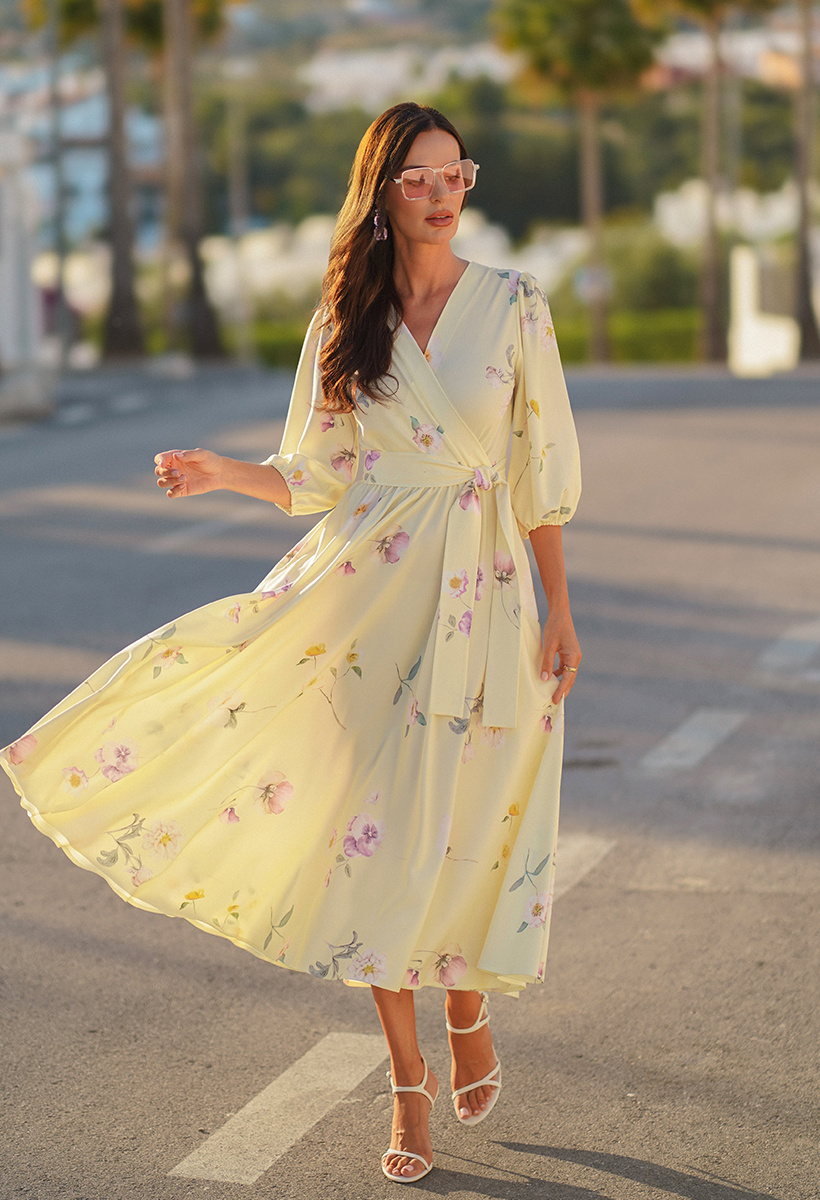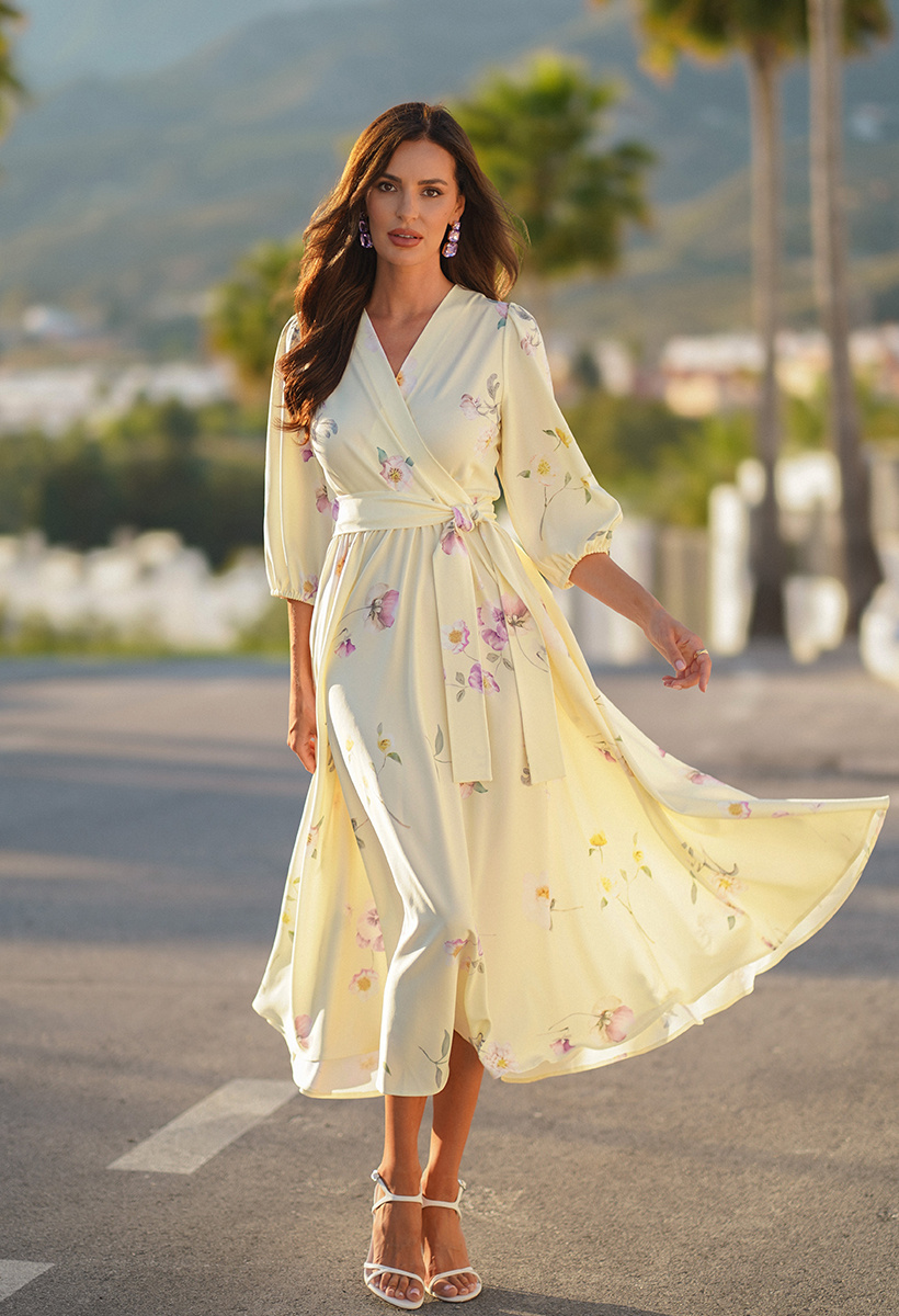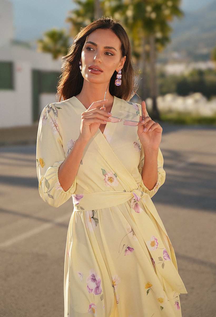 Czułość zamknięta w masełkowym odcieniu żółci. Sukienka Celine otula sylwetkę niczym promień słońca – w kolorze butter yellow, jednym z najmodniejszych odcieni sezonu. Delikatny kwiatowy print w różowe bratki dodaje jej romantycznego charakteru i subtelnej lekkości, która porusza wyobraźnię.
