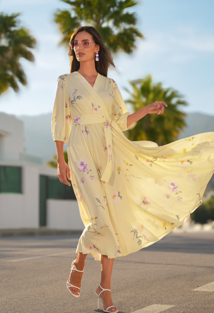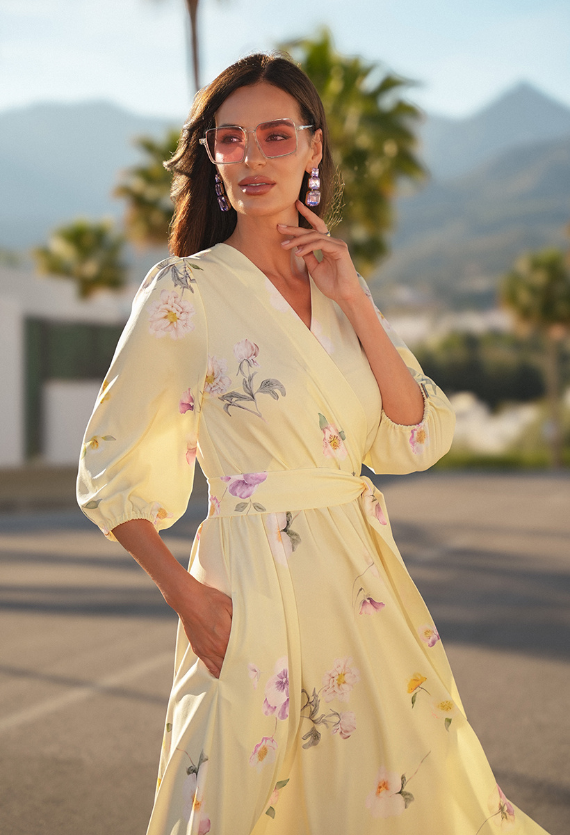 Żółta sukienka w różowe kwiatki Celine