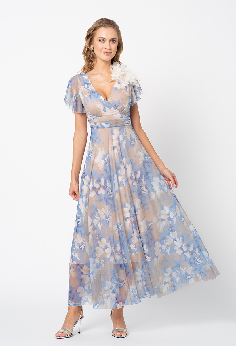 Zjawiskowa i subtelna – ta sukienka to kwintesencja kobiecości. Długi, rozkloszowany fason lekko unosi się przy każdym ruchu, a kwiatowy wzór sprawia wrażenie jakby został namalowany akwarelą – delikatny, romantyczny, wyjątkowy. Kopertowy dekolt podkreśla linię szyi i dodaje lekkości górze sylwetki, a krótkie rękawy miękko opadają na ramiona.