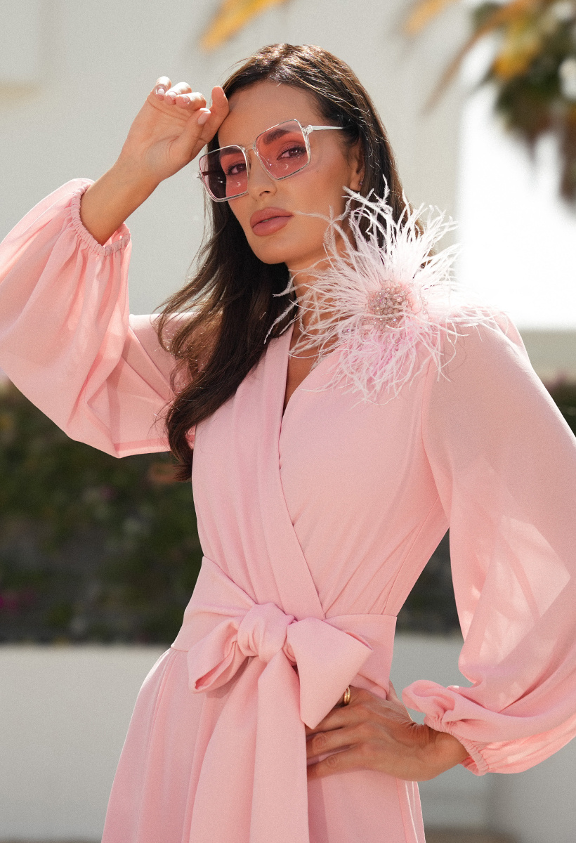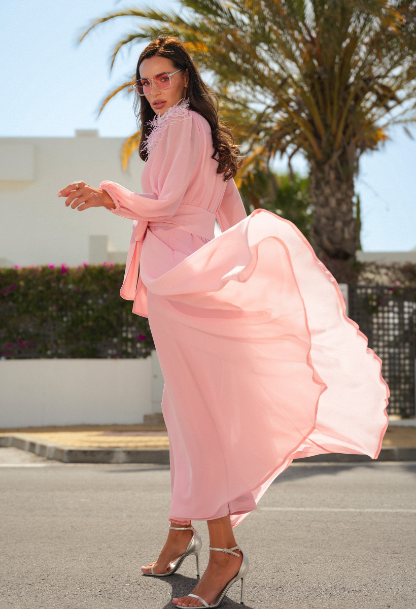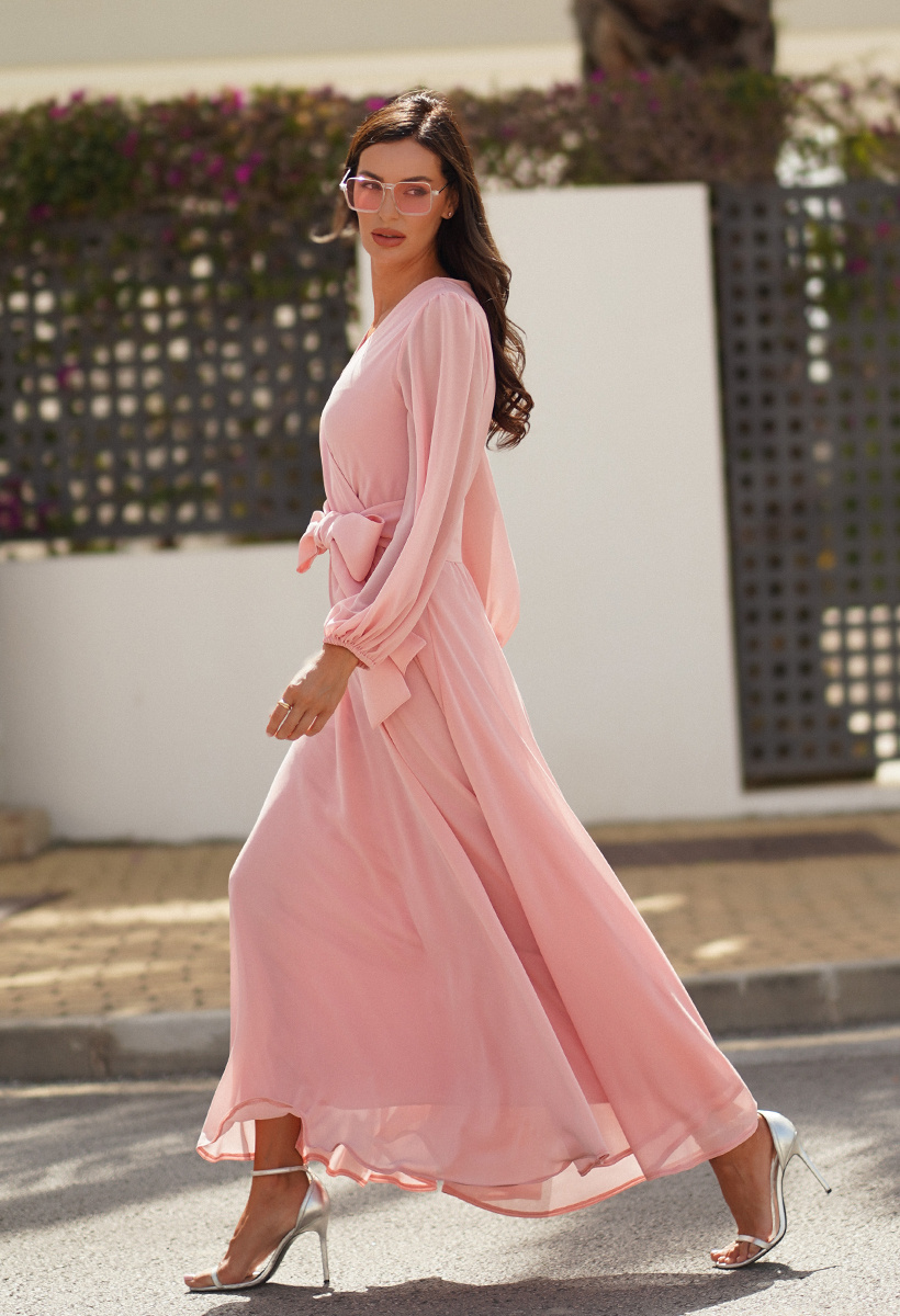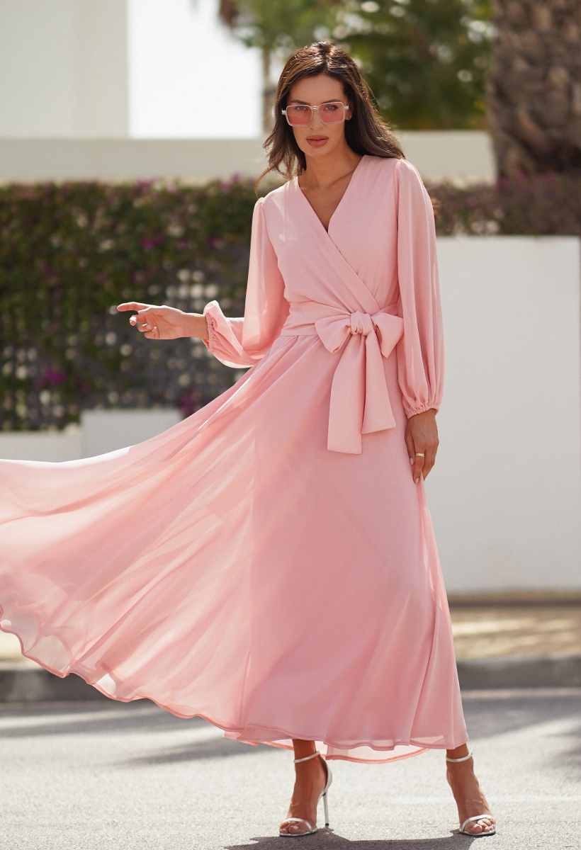 Subtelna, romantyczna, po prostu stworzona na wyjątkowe chwile. Pudrowy, delikatny róż, lekkość i czysta elegancja. Długa, zwiewna, pełna uroku. Ta maxi sukienka z delikatnego szyfonu zachwyca rozkloszowanym dołem, który pięknie faluje w ruchu, dodając sylwetce lekkości. Kopertowy dekolt subtelnie podkreśla linię szyi i dekoltu. Gumka w talii doskonale akcentuje kobiece kształty, szeroki pasek z tego samego materiału pozwala na zawiązanie efektownej kokardy. Długie, lekko bufiaste rękawy nadają romantycznego charakteru. Delikatny, przezroczysty szyfon nadaje całej sylwetce lekkości i wprowadza nutę zmysłowości. Perfekcyjnie dobrana podszewka gwarantuje maksymalny komfort, materiał jest niezwykle przyjemny dla skóry. Sydney to idealna sukienka na wesele, letnie przyjęcie czy każdą inną wyjątkową okazję w sezonie wiosna-lato 2025.