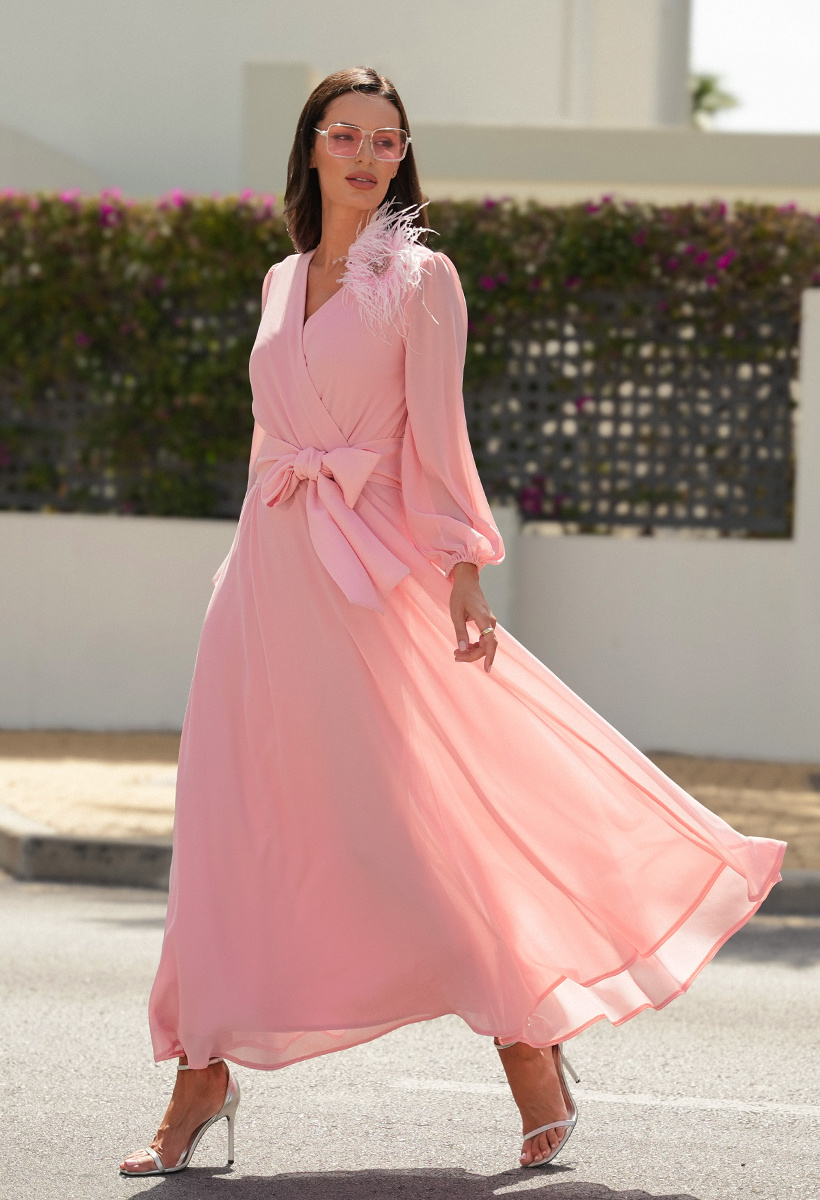 - Pudrowy róż, lekkość i czysta elegancja. Długa, zwiewna, pełna subtelnego uroku. Zachwyca rozkloszowanym dołem, który pięknie faluje w ruchu, dodając sylwetce lekkości. To idealna sukienka na wesele, czy inną wyjątkową okazję.