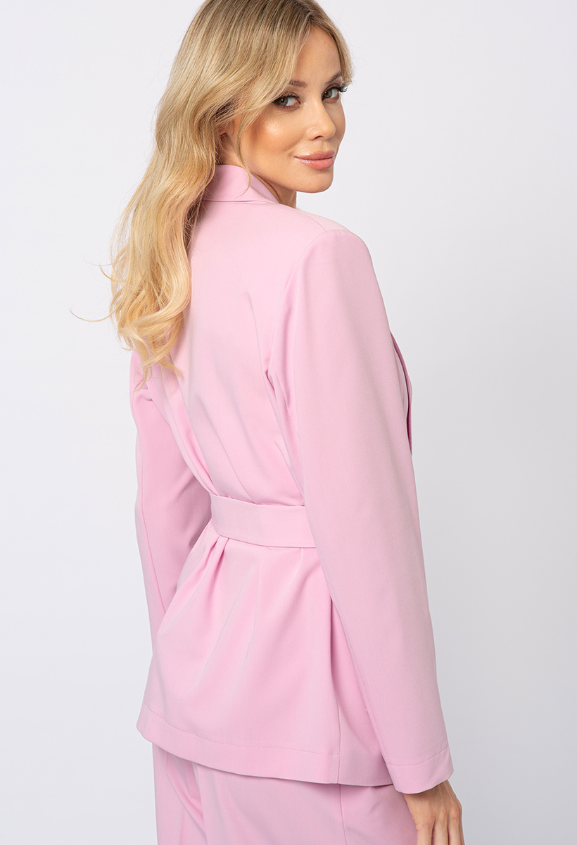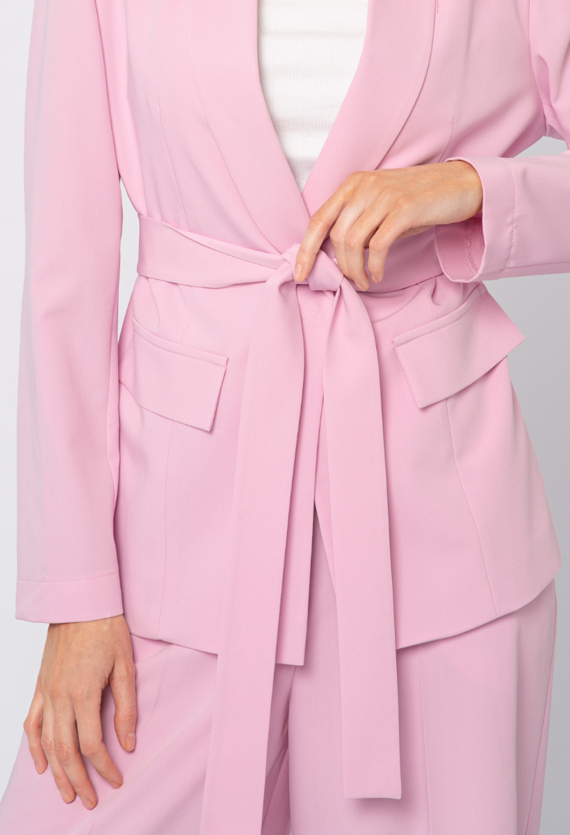 Nowoczesna klasyka w pudrowym wydaniu. Marynarka Sally w różowym odcieniu przyciąga spojrzenia swoim minimalistycznym krojem i detalem w postaci wiązania w talii. Pasek wykonany z tego samego materiału akcentuje kobiecą sylwetkę. Delikatne poduszki w ramionach nadają formie charakter i subtelnie modelują sylwetkę, a klasyczny kołnierz i prosty krój sprawiają, że marynarka wpisuje się w estetykę nowoczesnej elegancji.