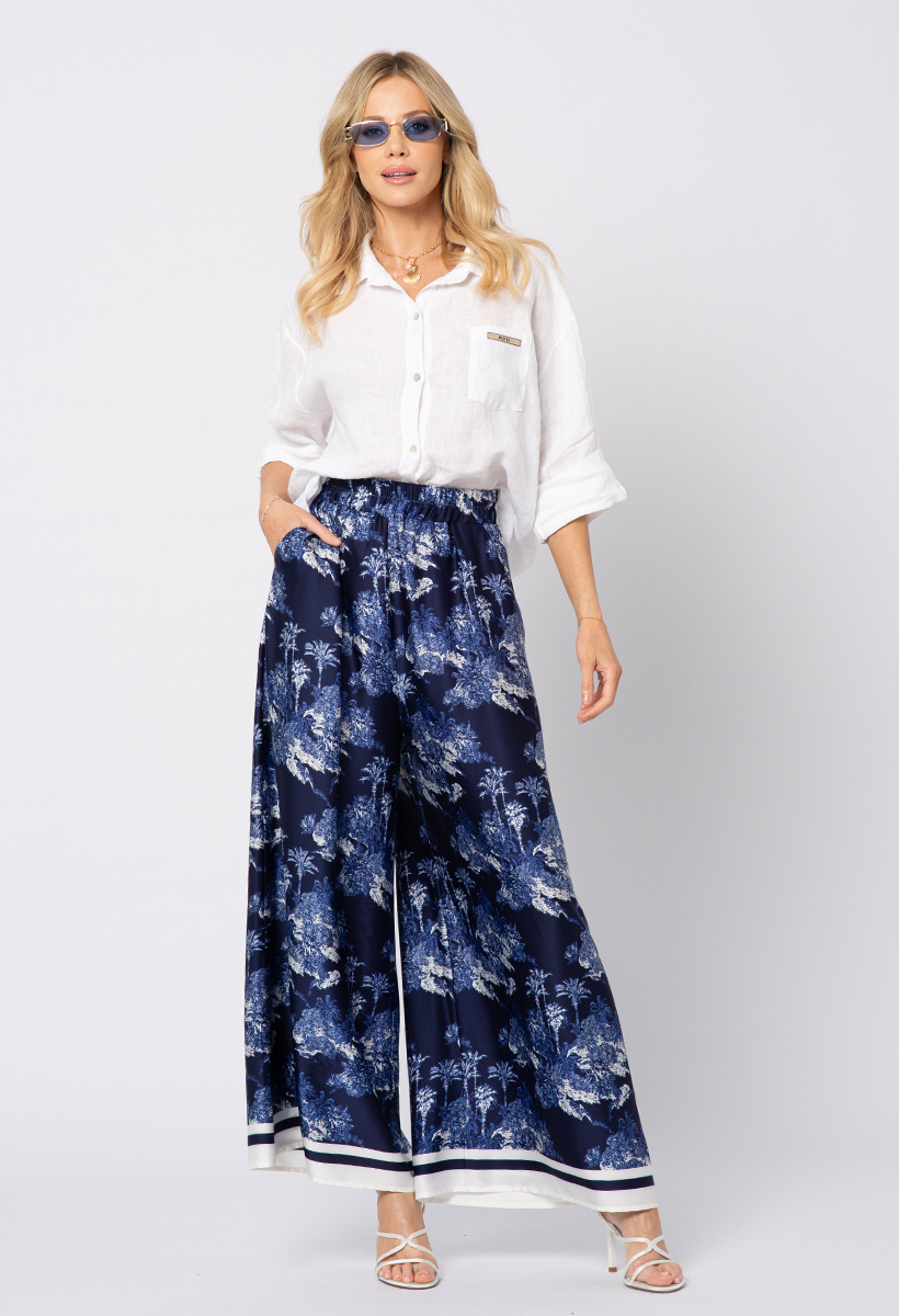 • Zachwycają lekkością, urzekają wzorem. Esencja letniego luzu i kobiecej swobody. Uszyte z połyskującej satyny w niebieski wakacyjny print przywołują wspomnienia śródziemnomorskich podróży. Szerokie nogawki pięknie układają się w ruchu.