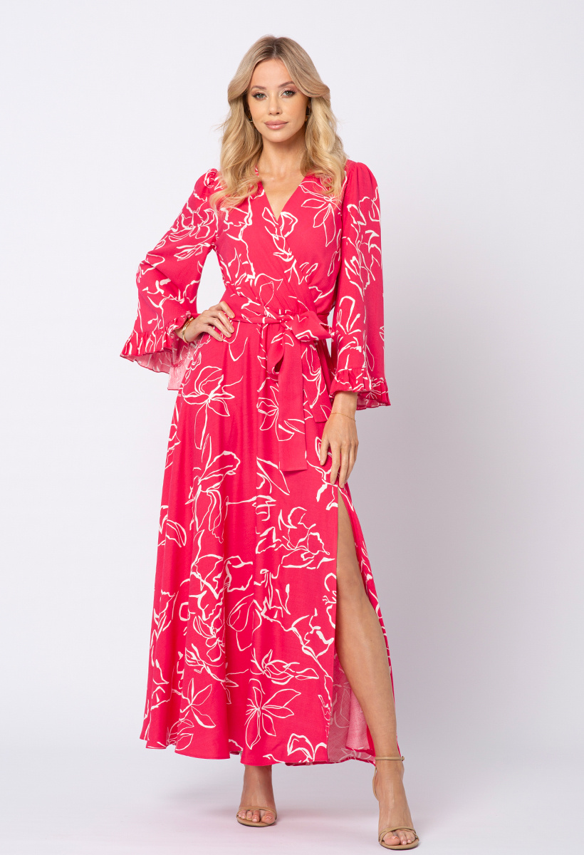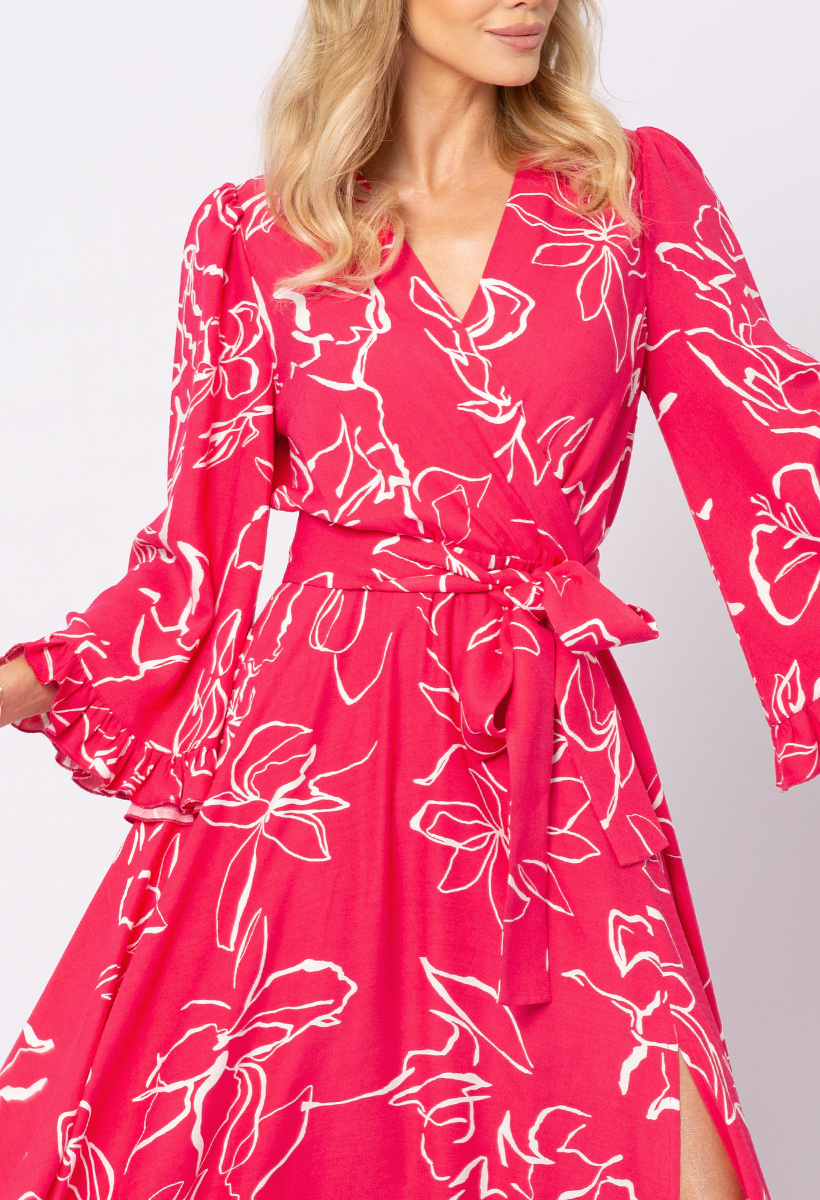 Czujesz, jak rozkwitasz. To sukienka, która natychmiast przyciąga spojrzenia – kobieca, wyrazista, pełna letniego magnetyzmu. Jej intensywny odcień czerwieni przełamany subtelnym, jasnym kwiatowym wzorem to połączenie zmysłowości z romantyzmem. Gdy tylko ją założysz, zrozumiesz, że to coś więcej niż sukienka – to Twoja pewność siebie zapisana w tkaninie. Została uszyta z lekkiej, przewiewnej wiskozy – materiału, który oddycha razem z Tobą, jest przyjemny w dotyku i idealnie sprawdza się w upalne dni. Kopertowy dekolt pięknie podkreśla linię szyi, a delikatna gumka w talii i pasek z tej samej tkaniny pozwalają dopasować ją do sylwetki i podkreślić kobiece kształty. Dół sukienki jest lekko rozkloszowany, a zmysłowe rozcięcie eksponuje nogę przy każdym ruchu. Rękawy długości 3/4, zakończone falbaną, dodają stylizacji lekkości i teatralnego uroku. To idealny wybór na romantyczne wieczory, letnie przyjęcia, spacery o zachodzie słońca czy wyjątkowe okazje, w których chcesz wyglądać i czuć się naprawdę wyjątkowo.