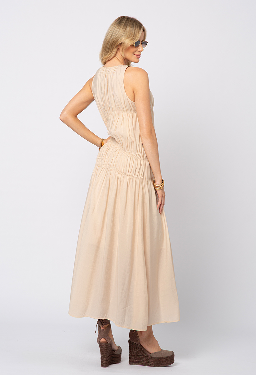 Beżowa sukienka na ramiączka z ozdobnymi marszczeniami