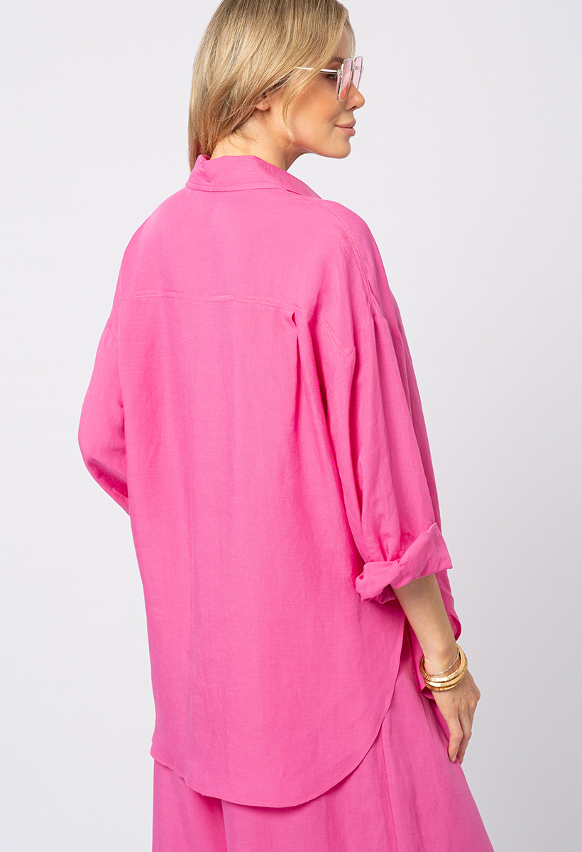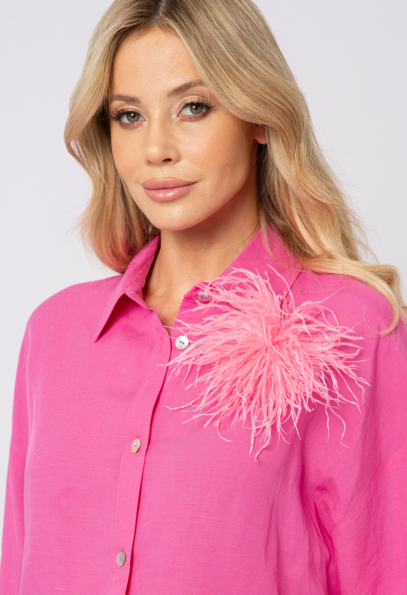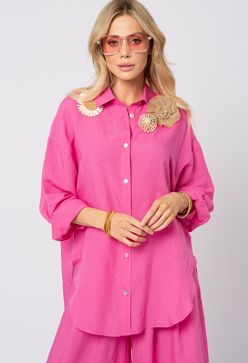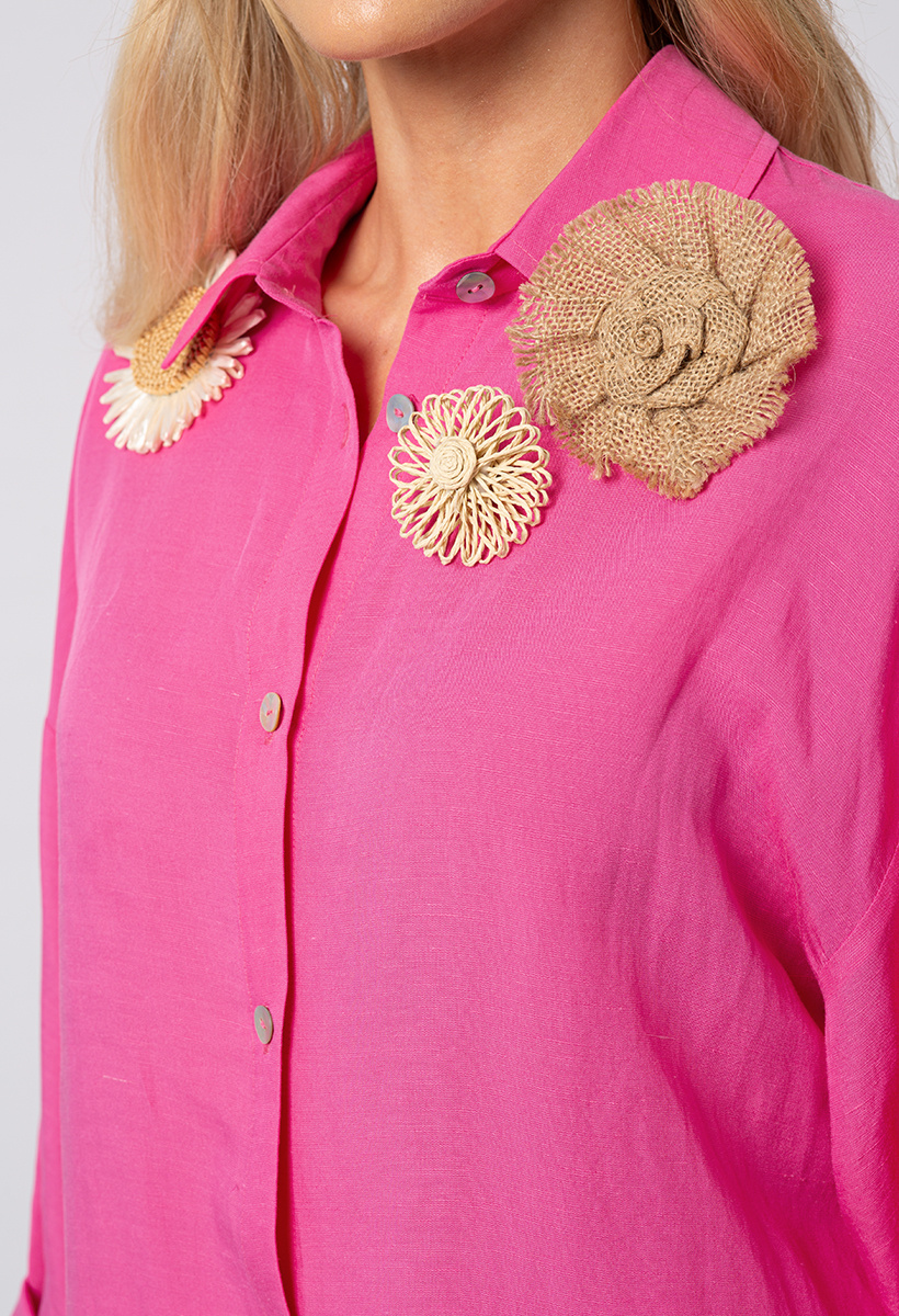 Różowa koszula wiskoza z lnem z ozdobnymi broszkami z rafii Mona