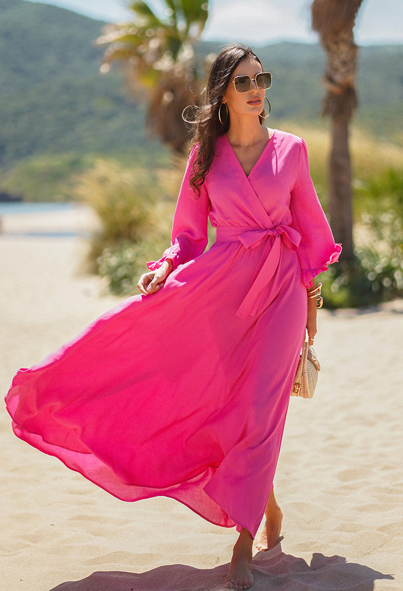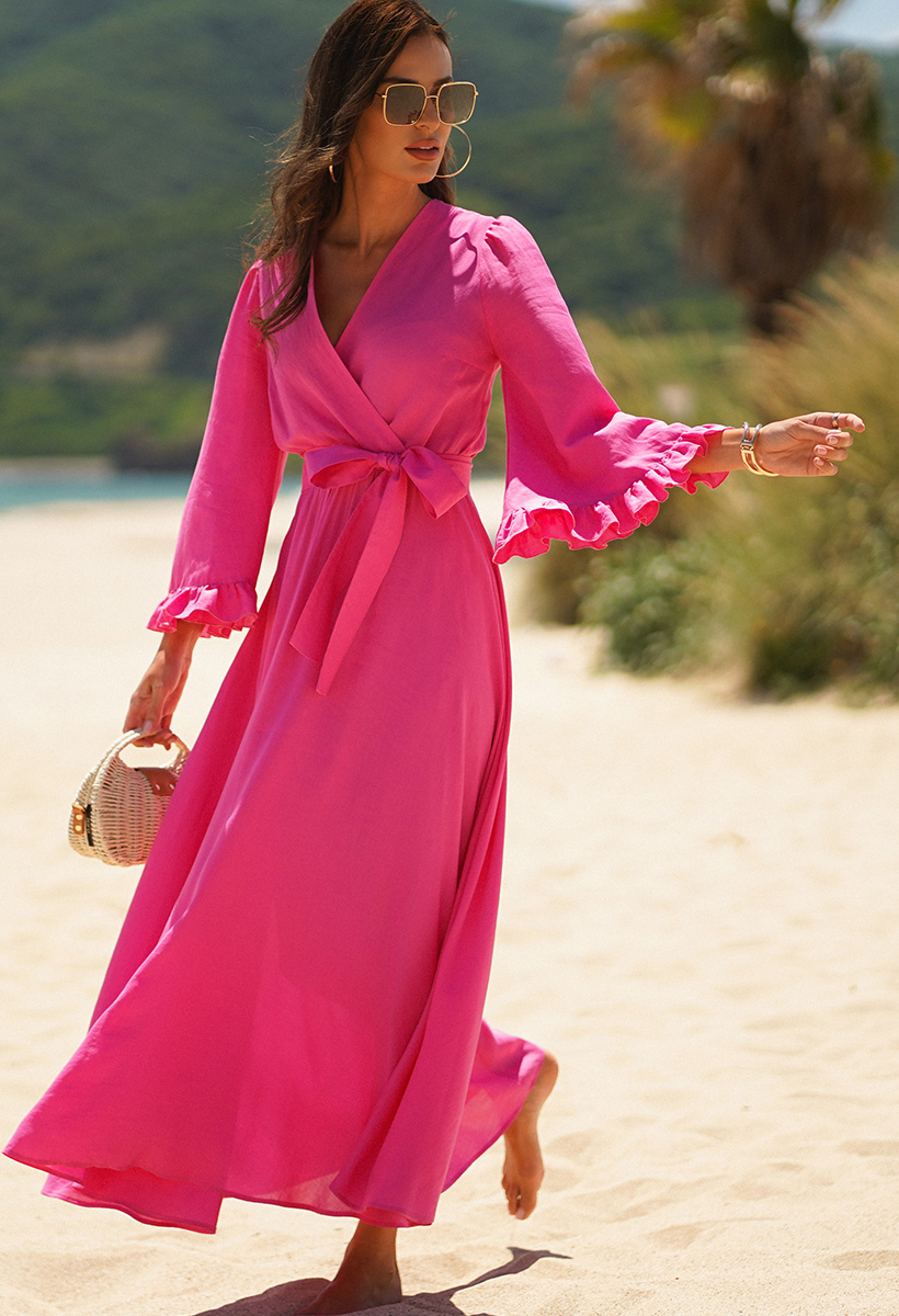 Gdy ją założysz, świat wokół zwalnia, a Ty czujesz się jak ucieleśnienie letniego marzenia. Głęboki różowy odcień – wpadający w fuksję – przyciąga spojrzenia i rozświetla skórę, a każdy ruch sprawia, że lekki materiał zmysłowo faluje wokół ciała. Len w połączeniu z wiskozą to idealny duet na letnie dni. Kopertowy dekolt subtelnie eksponuje szyję, a elastyczna talia z materiałowym paskiem pięknie podkreśla kobiece kształty. Długi, trapezowy dół tańczy przy każdym kroku, z lekkością i finezją. Rozkloszowane, kimonowe rękawy, zakończone romantyczną falbaną, dodają lekkości i artystycznego sznytu.