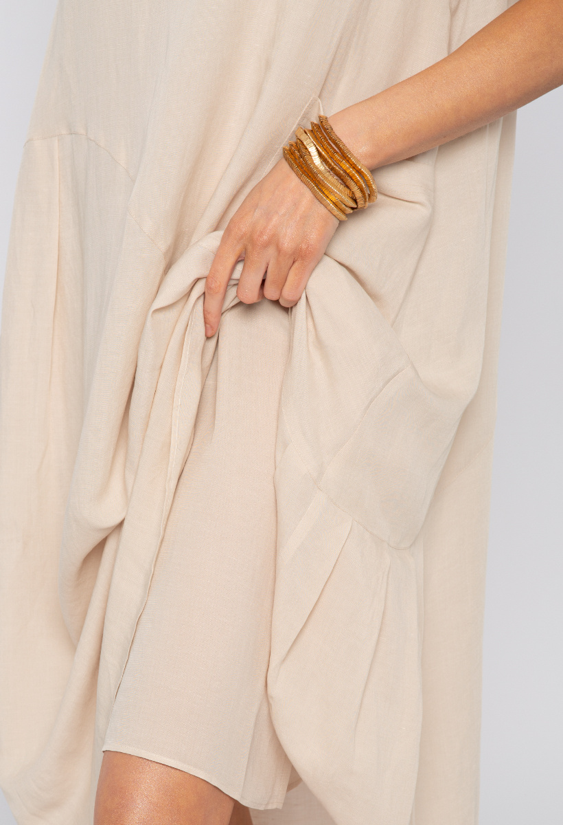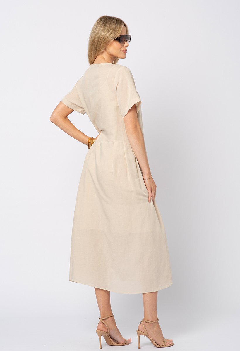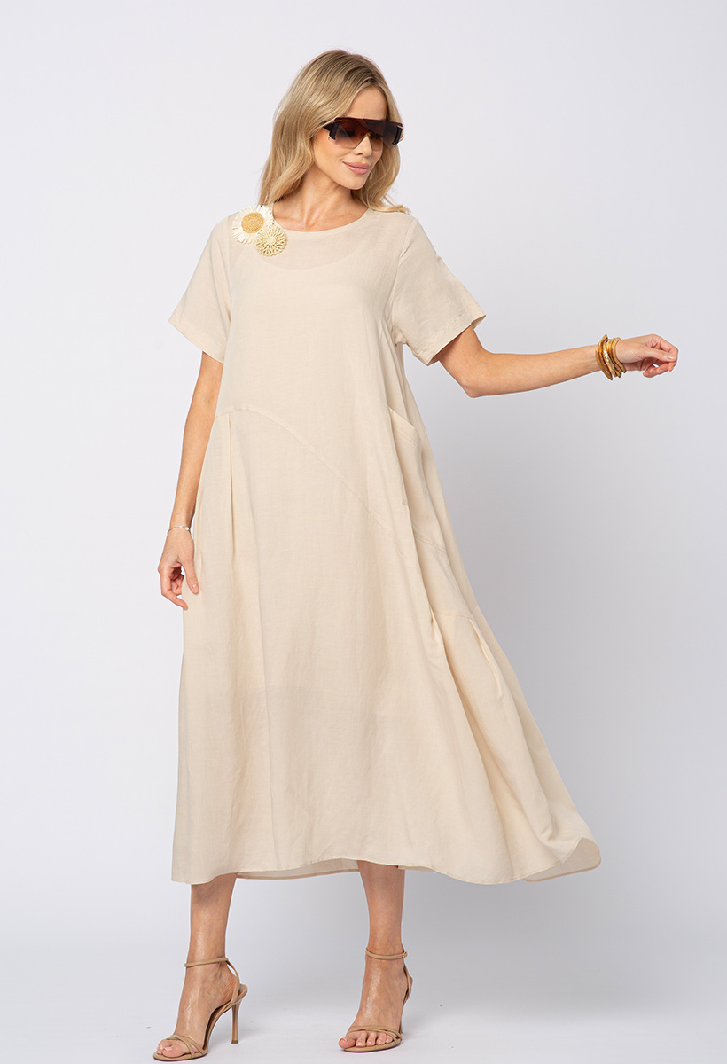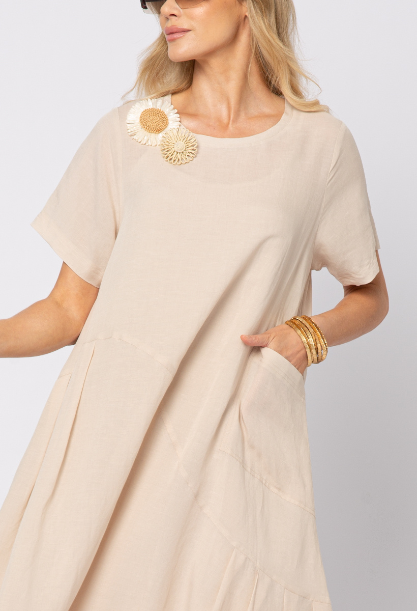Beżowa sukienka wiskoza z lnem z ozdobnymi broszkami z rafii