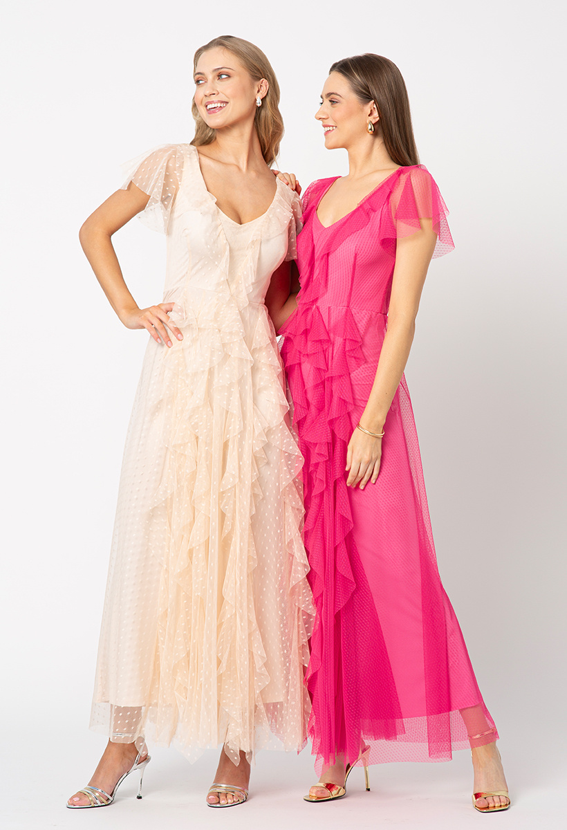 Delikatność, która przyciąga spojrzenia... Beżowa tiulowa sukienka w subtelne groszki to połączenie romantyzmu, lekkości i wieczorowej elegancji. To kreacja, w której każda kobieta może poczuć się wyjątkowo – jak z baśni, ale w nowoczesnym wydaniu. Długość maxi, wyrafinowany krój i delikatnie transparentna warstwa tiulu w formie falban tworzą zjawiskowy efekt przy każdym ruchu. Dodaje sylwetce kobiecości i finezji. Dopasowana kolorystycznie podszewka zapewnia odpowiednie pokrycie ciała, jednocześnie pozwalając tiulowi na swobodne unoszenie się.