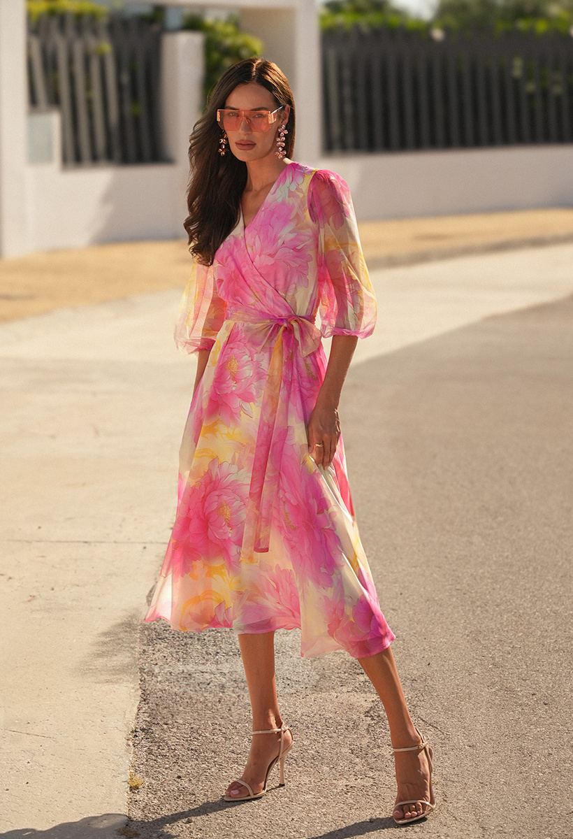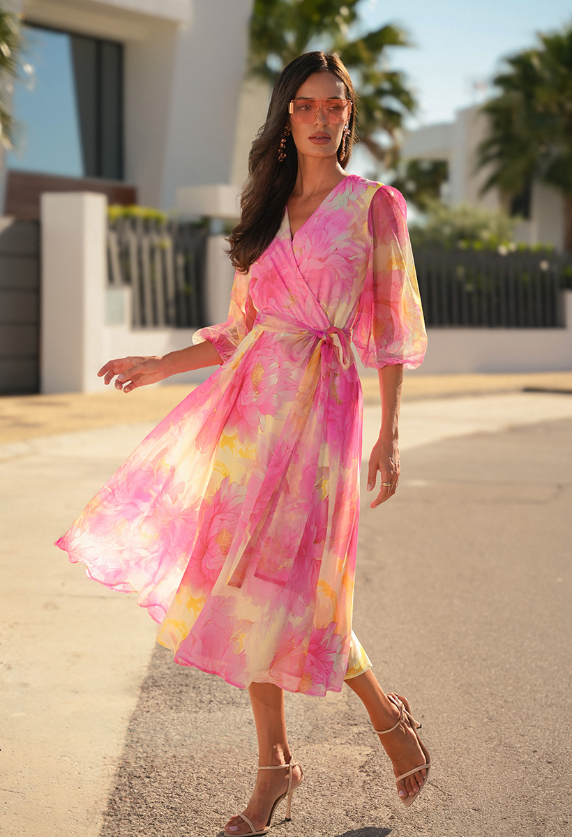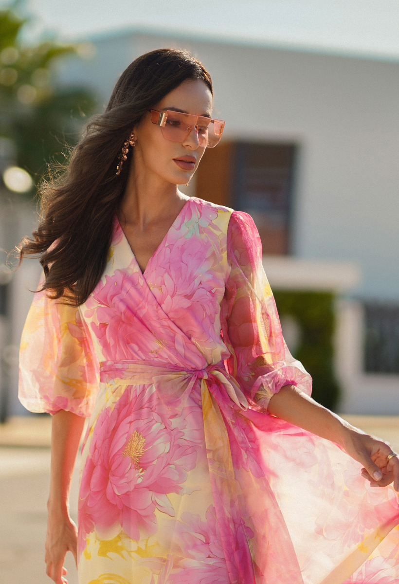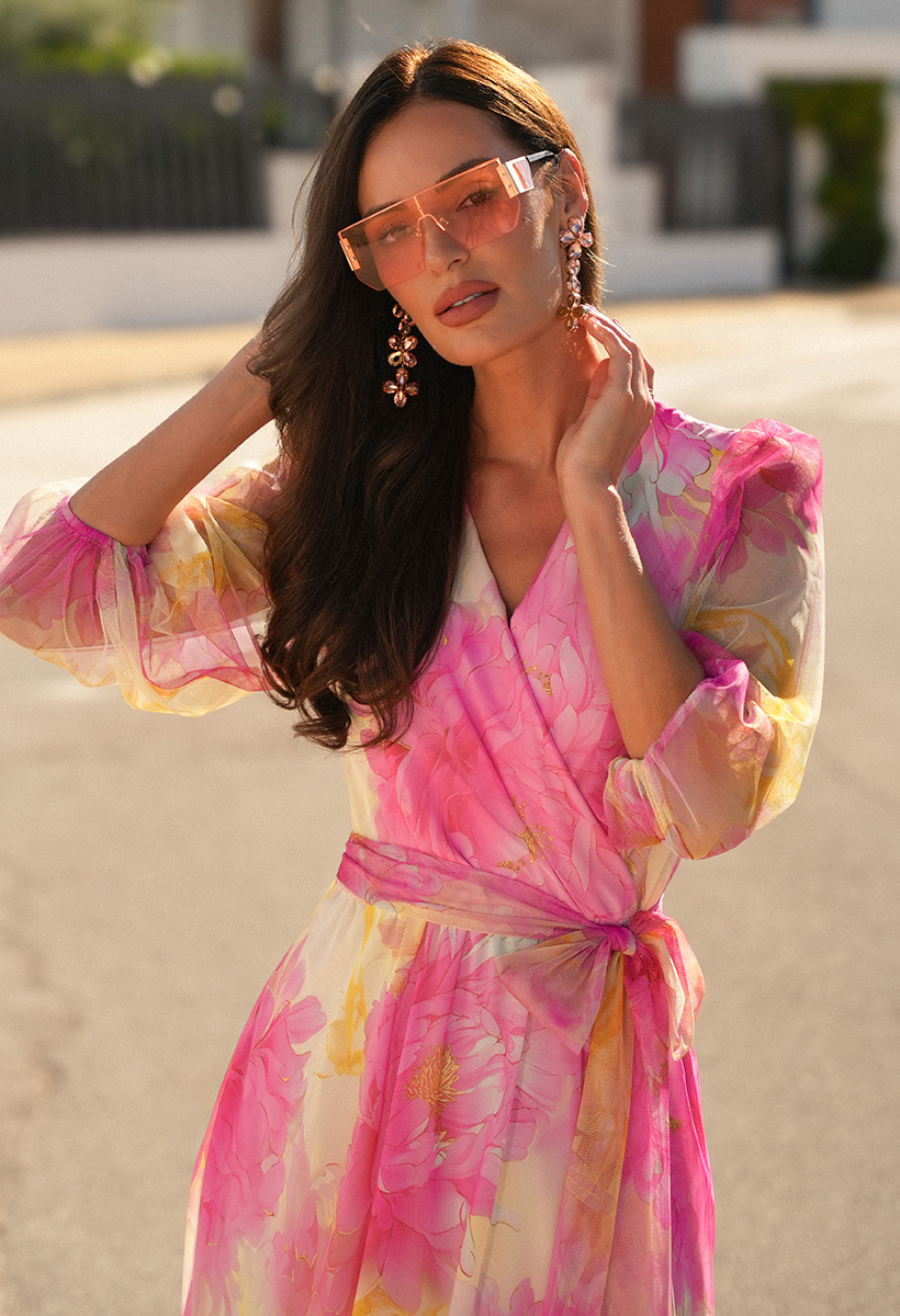 Zjawiskowa lekkość w kwiatowym wydaniu. Sukienka Lyssa zachwyca romantycznym printem w odcieniach różu i żółci oraz subtelną grą przezroczystości. Tiulowe rękawy dodają jej eteryczności, a kopertowy dekolt i elastyczna talia z wiązanym paskiem pięknie podkreślają sylwetkę. Zwiewny, szyfonowy dół o długości za kolano miękko porusza się przy każdym kroku, tworząc zmysłową i pełną wdzięku całość. Doskonale dobrana podszewka zapewnia komfort noszenia oraz pięknie podbija kolory sukienki.