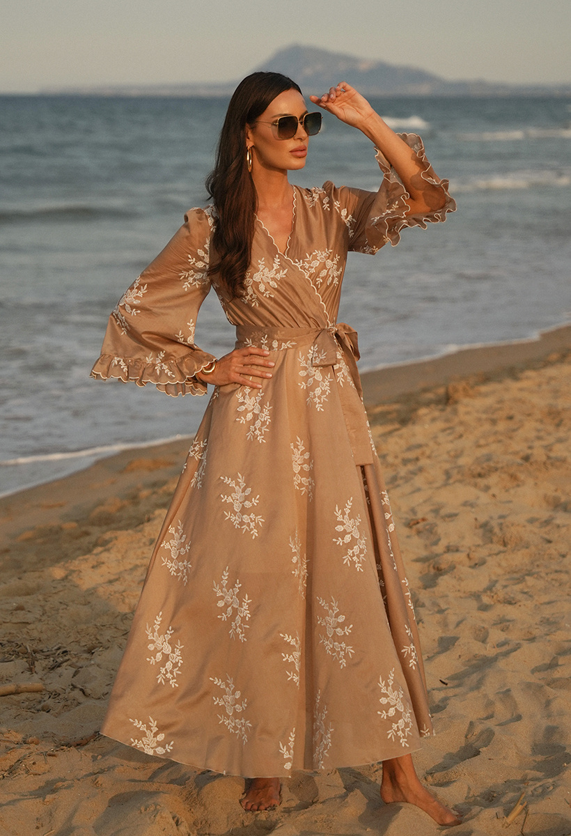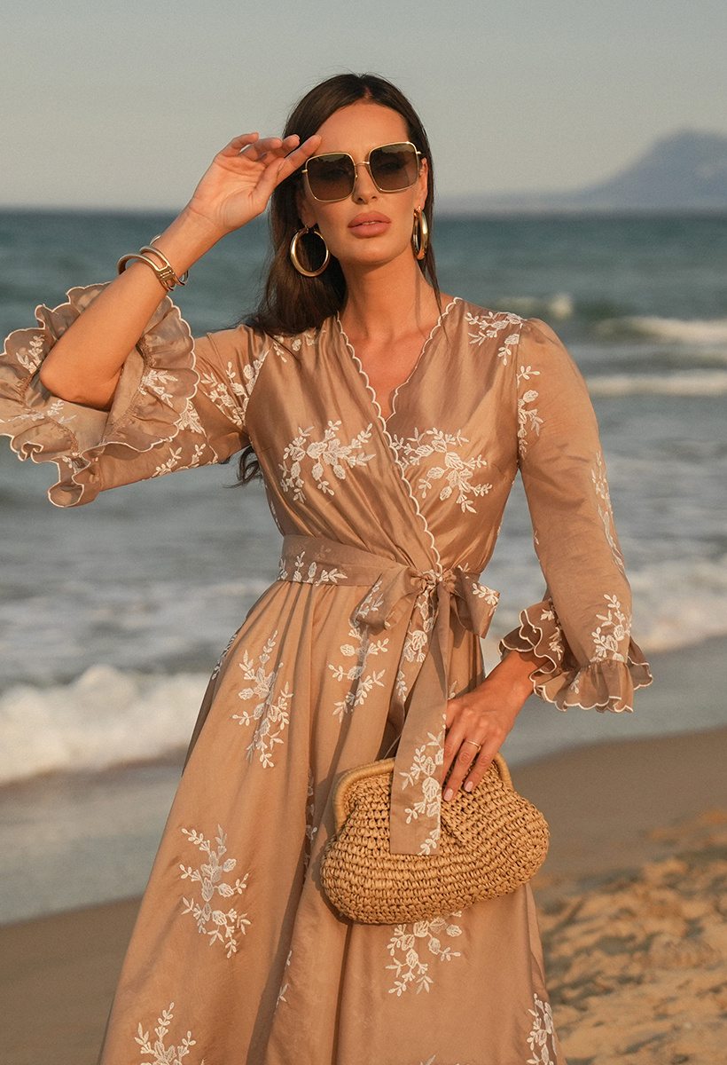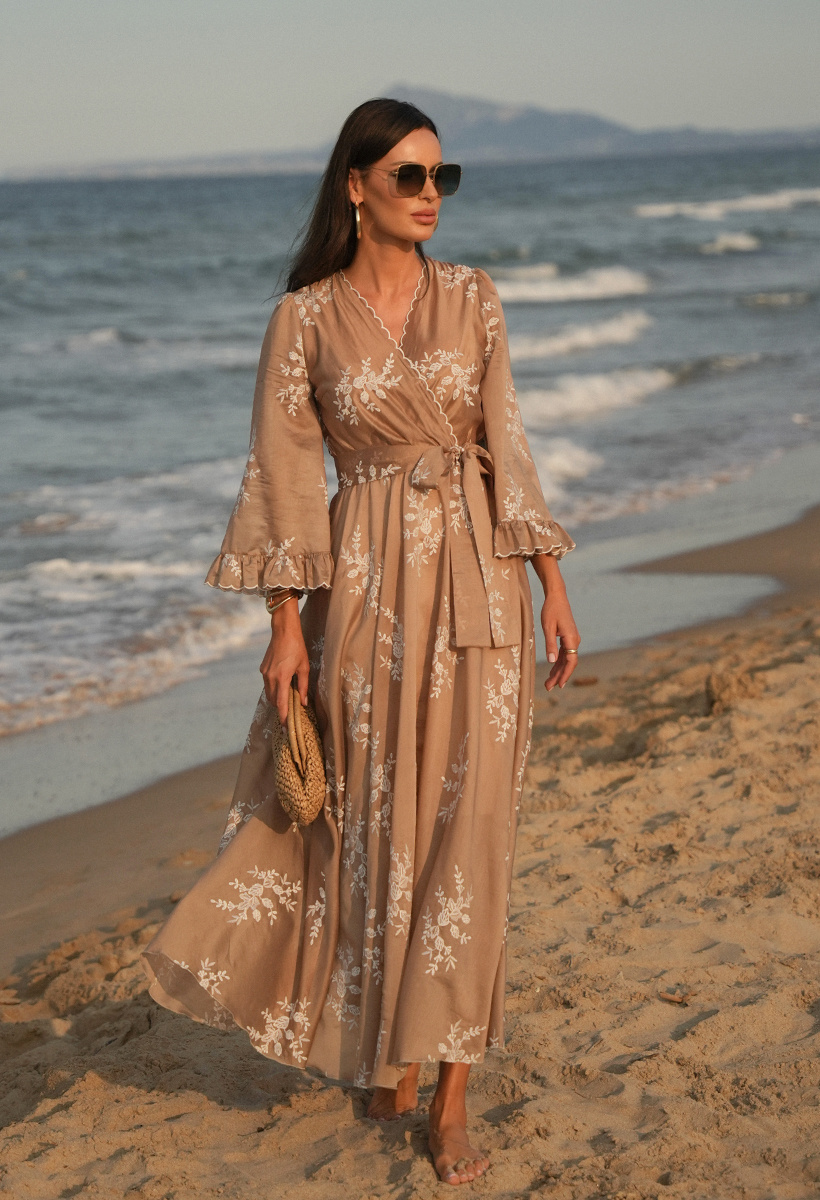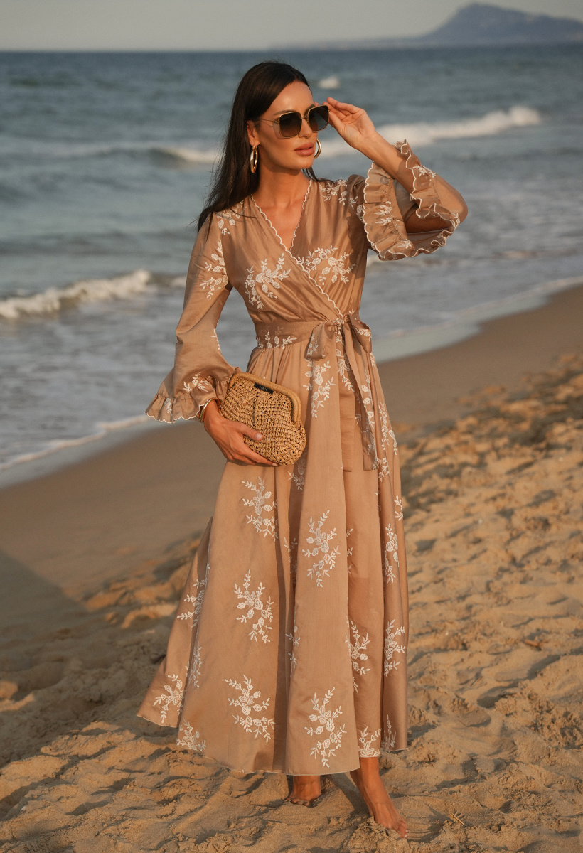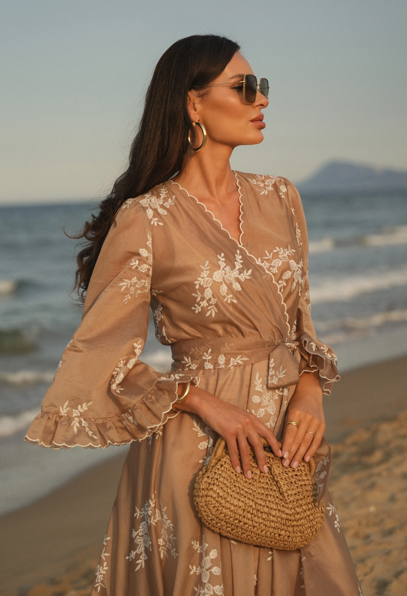 Beżowa sukienka z tencelu w haftowane kwiaty Aphrodite