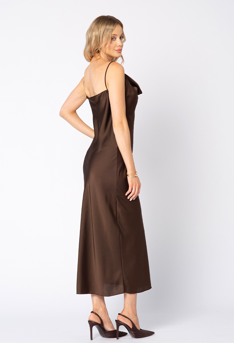 Czekoladowa satynowa sukienka ze skosu