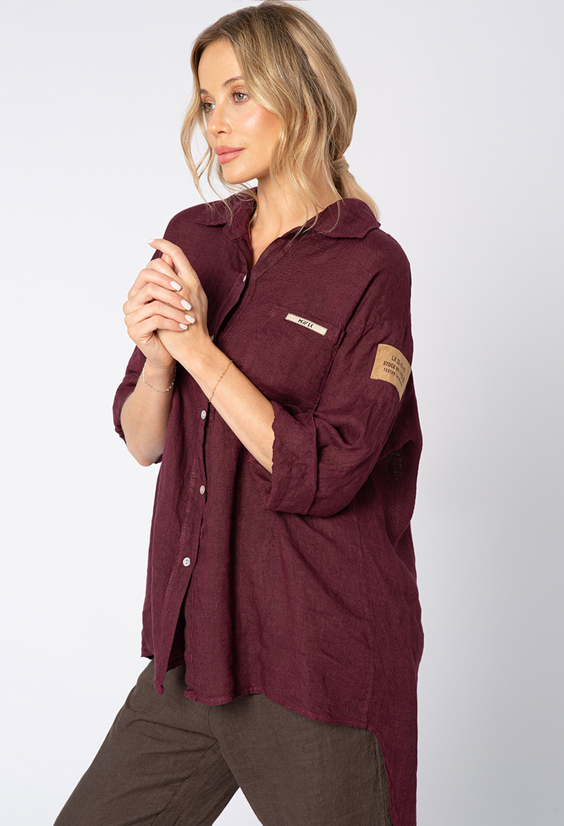 Naturalna prostota z nutą charakteru. Lniana koszula w bordowym odcieniu to ponadczasowy klasyk – lekka, przewiewna i przyjemna dla skóry. Ma luźny, komfortowy krój typu oversize, który pasuje na sylwetki od S do XL. Podwijane rękawy i klasyczne zapięcie na guziki dodają jej codziennej funkcjonalności, a kieszonka z przodu ozdobiona unikatową naszywką wprowadza modowy twist i wyróżnia ją spośród innych. Miejski styl, wygoda i nonszalancja – wszystko w jednej koszuli.