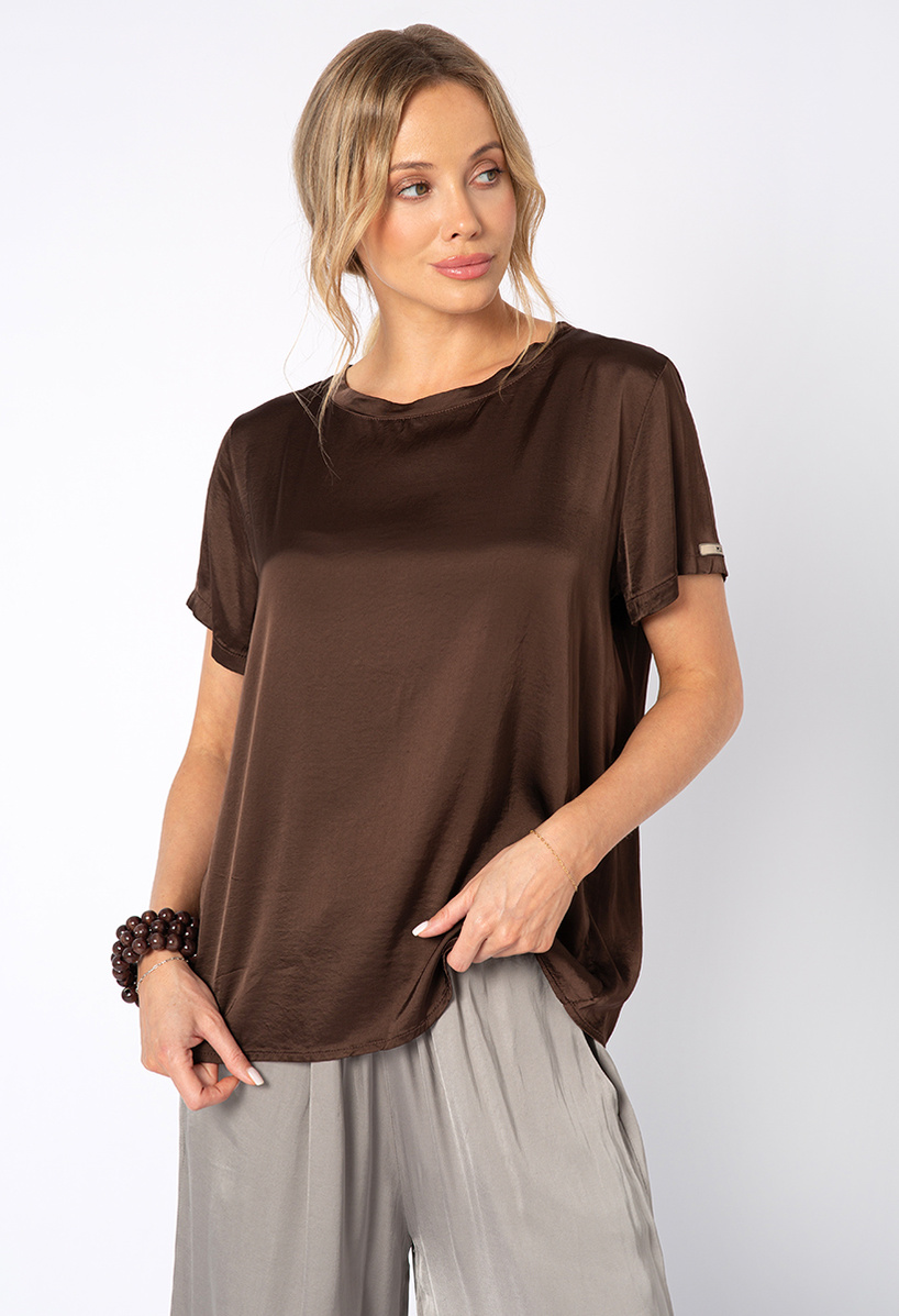• Minimalizm, który robi wrażenie. Gładka, świetlista, miękko opływa sylwetkę niczym jedwab. To elegancka wersja klasycznego T-shirtu, która doda szyku nawet najprostszej stylizacji. To ten element garderoby, który pasuje zawsze.