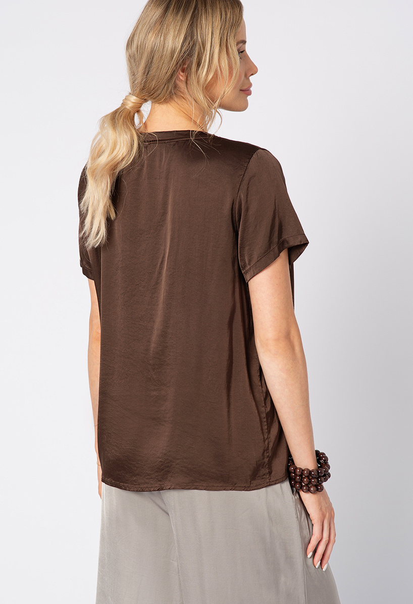 Minimalizm, który robi wrażenie. Bluzka z satynowej wiskozy – gładka, świetlista, miękko opływa sylwetkę niczym jedwab. To elegancka wersja klasycznego T-shirtu, która doda szyku nawet najprostszej stylizacji. Okrągły dekolt, krótki rękaw i prosty krój sprawiają, że nosi się ją z lekkością – do jeansów, pod marynarkę czy do ulubionej spódnicy. To ten element garderoby, który pasuje zawsze, a jednocześnie sprawia, że wyglądasz naprawdę dobrze.