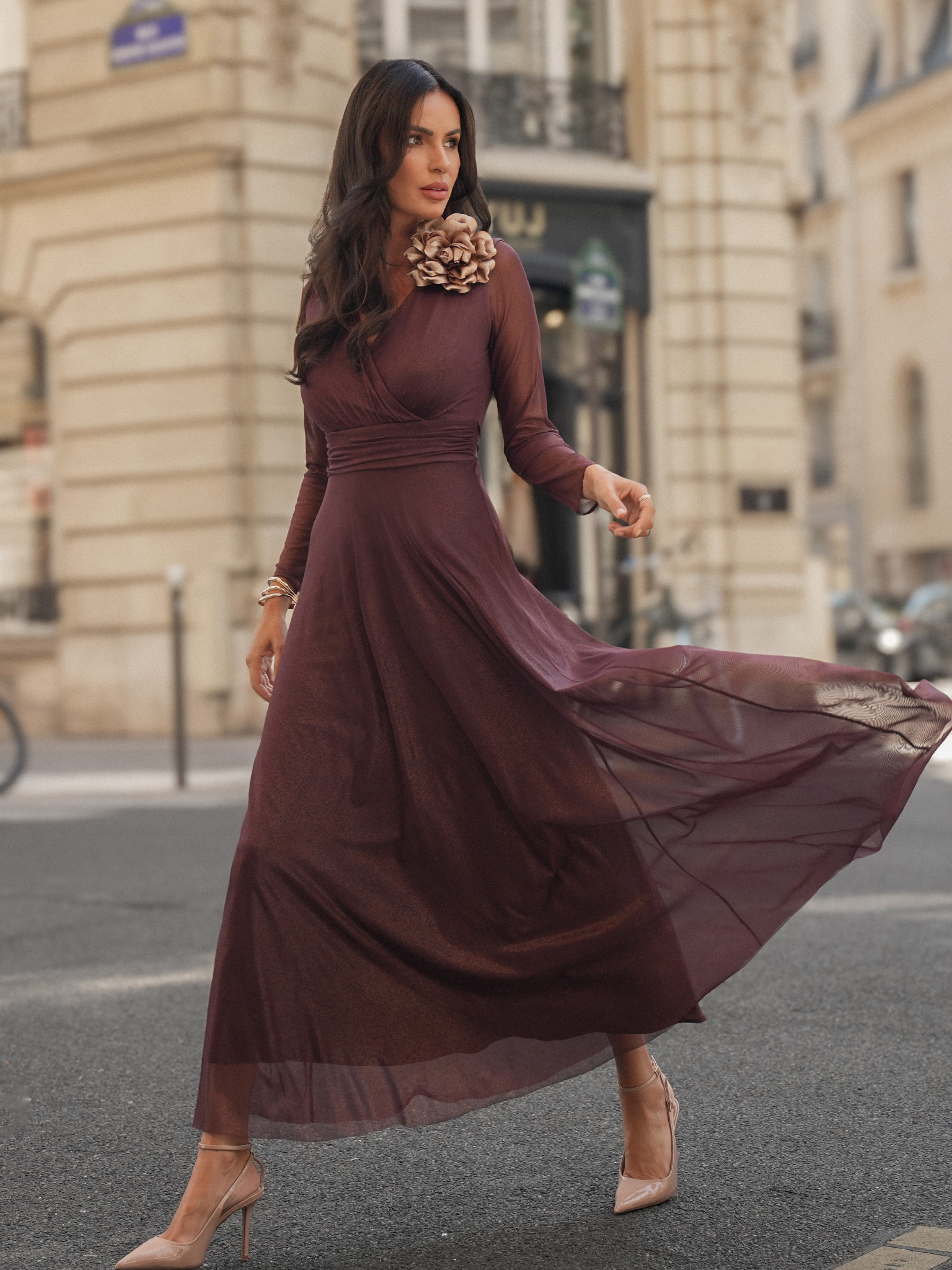 Poczujesz się pewna siebie i stylowa. Czekoladowy materiał z delikatnym złotym połyskiem emanuje wyrafinowaniem, a ponadczasowy, klasyczny krój z rozkloszowanym dołem dodaje jej lekkości i kobiecości. Kopertowy dekolt subtelnie podkreśla biust, tworząc efekt eleganckiej zmysłowości. Dopasowane, lekko przezroczyste rękawy nadają sukience delikatnego charakteru, a wiązanie z tyłu pięknie akcentuje talię, modelując sylwetkę. Perfekcyjnie dopasowana podszewka nie tylko zapewnia komfort noszenia, ale również podkreśla intensywny czekoladowy kolor sukienki, tworząc harmonijną całość.