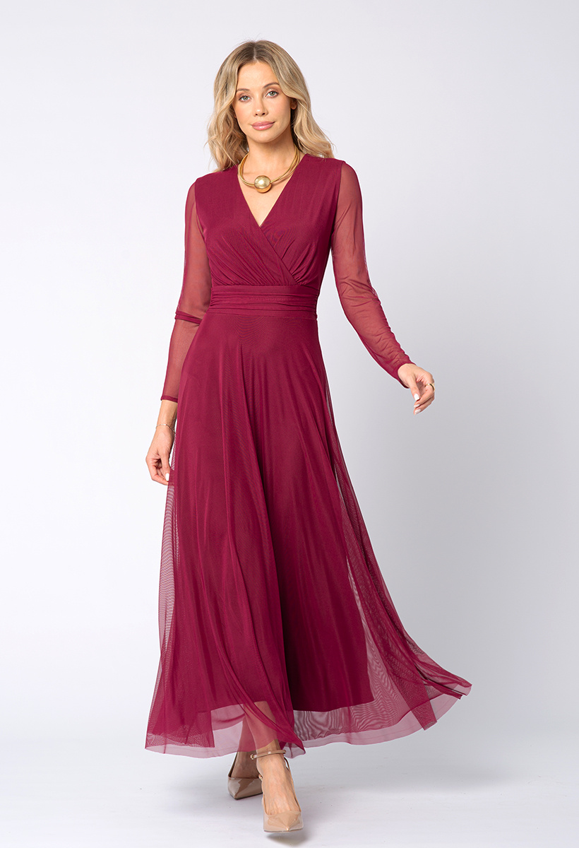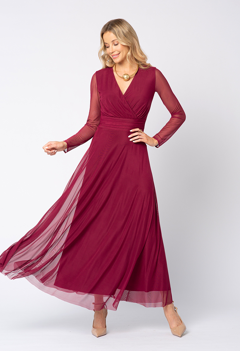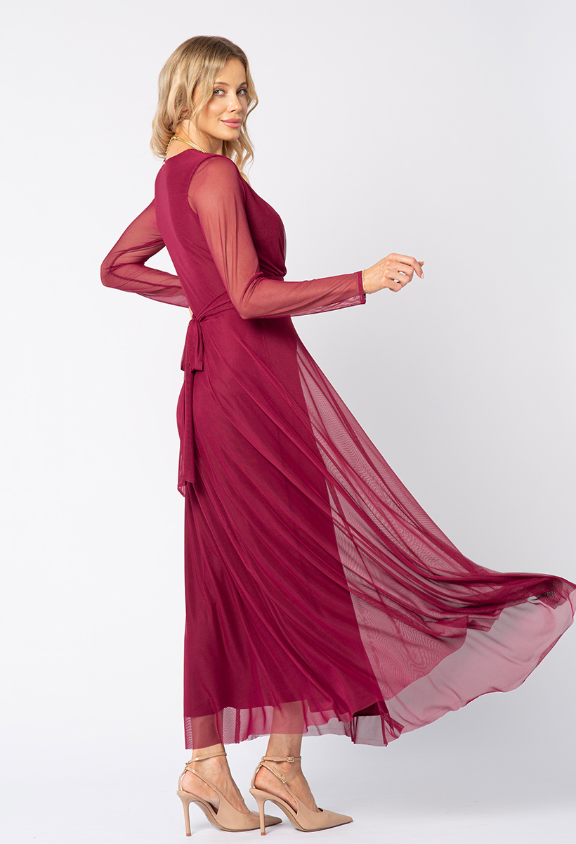 Poczujesz się pewna siebie i stylowa. Delikatna siatka w odcieniu czerwonego wina emanuje wyrafinowaniem, a ponadczasowy, klasyczny krój z rozkloszowanym dołem dodaje jej lekkości i kobiecości. Kopertowy dekolt subtelnie podkreśla biust, tworząc efekt eleganckiej zmysłowości. Dopasowane, lekko przezroczyste rękawy nadają sukience delikatnego charakteru, a wiązanie z tyłu pięknie akcentuje talię, modelując sylwetkę. Perfekcyjnie dopasowana podszewka nie tylko zapewnia komfort noszenia, ale również podkreśla intensywny kolor sukienki, tworząc harmonijną całość.