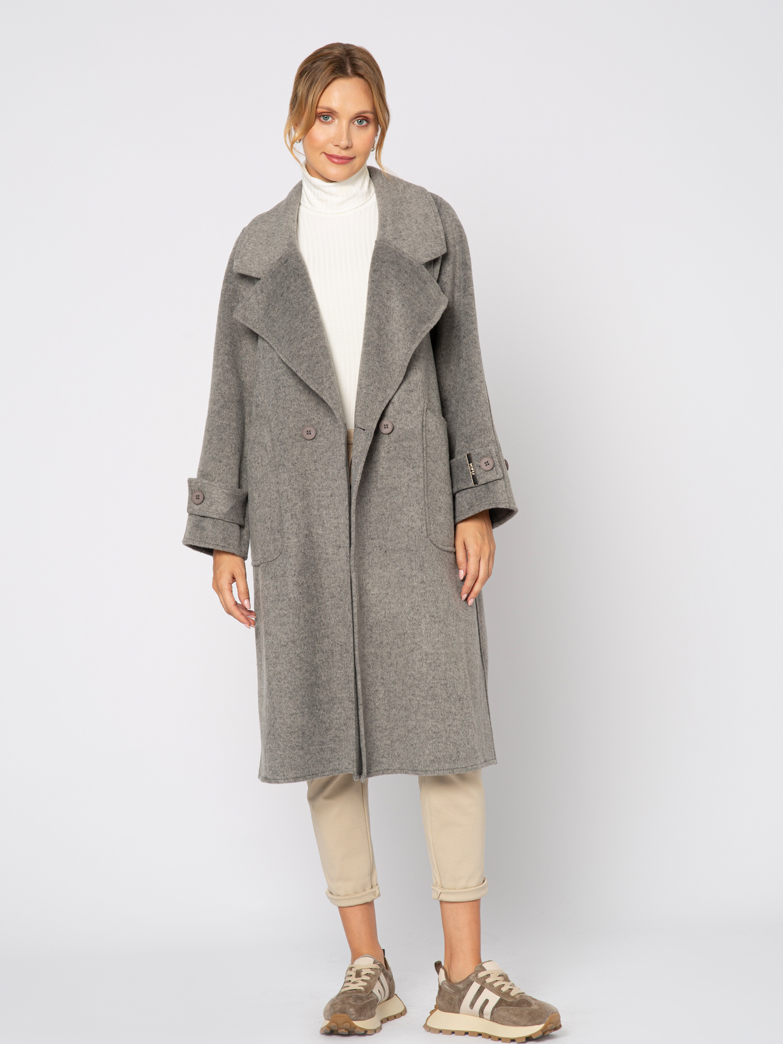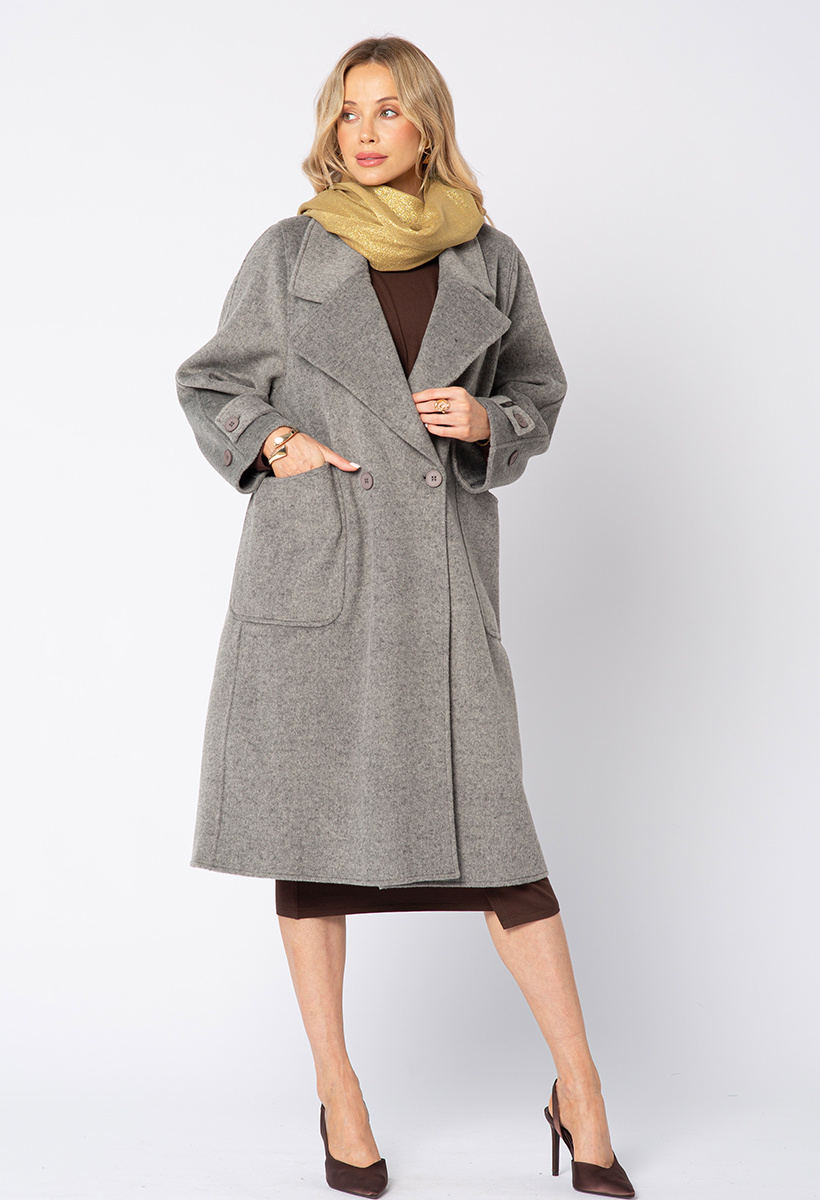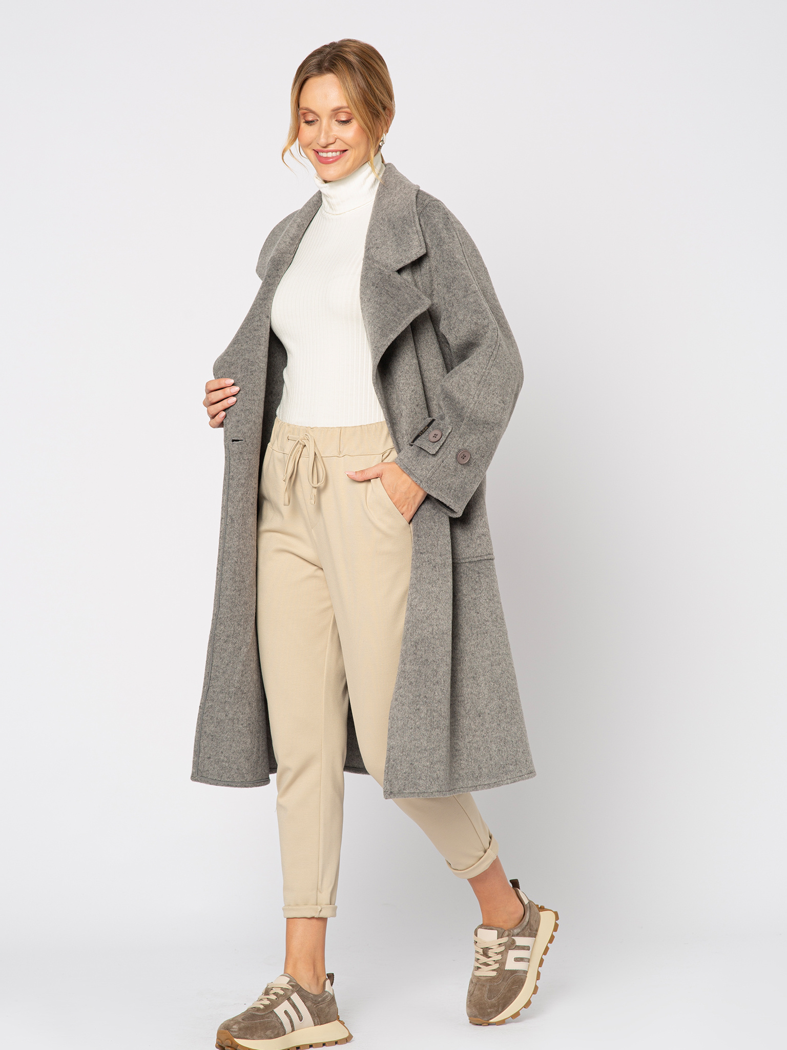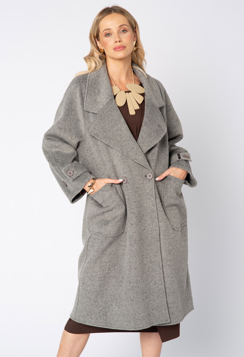 Szary wełniany płaszcz z dużymi kieszeniami bez podszewki