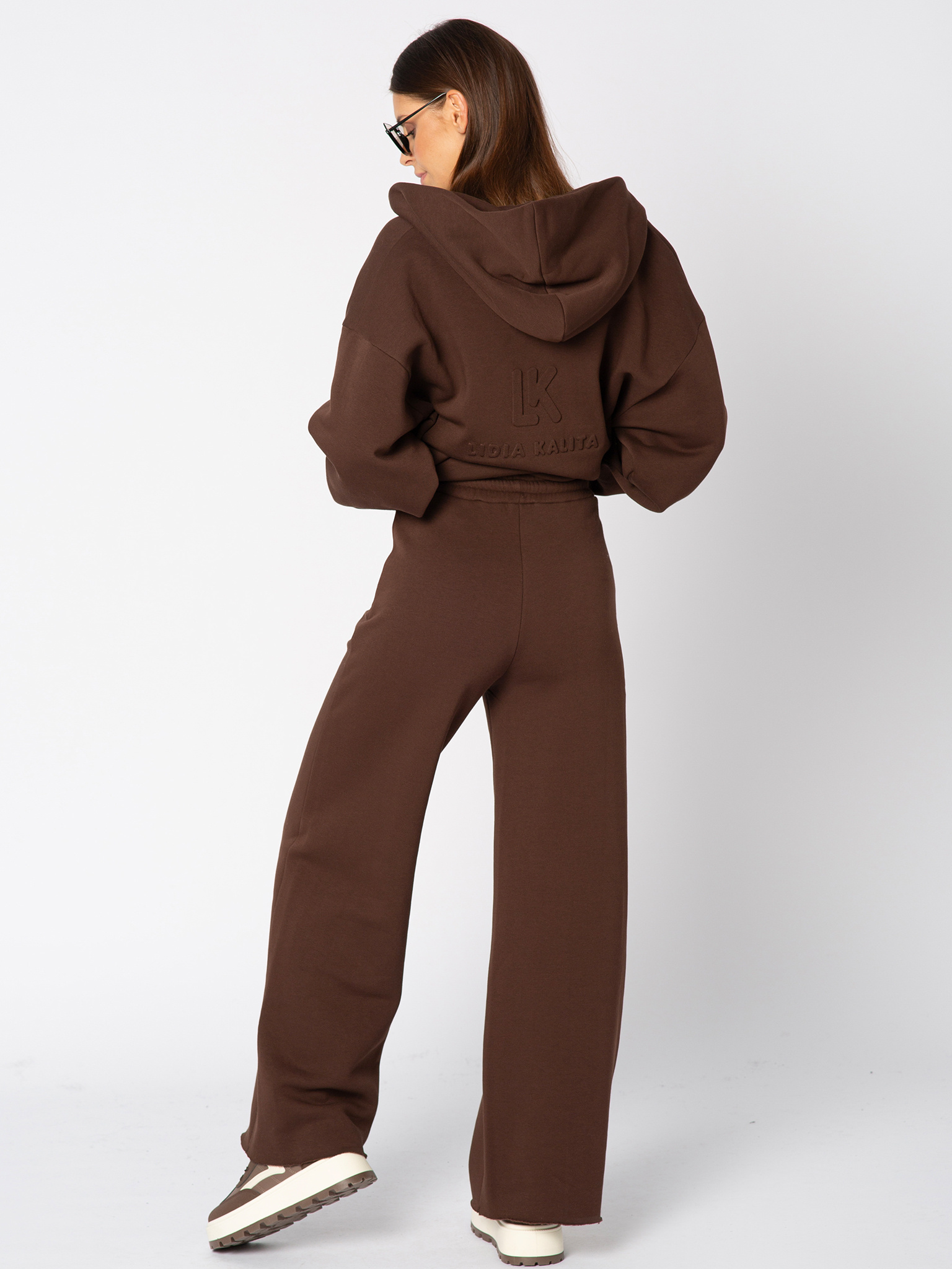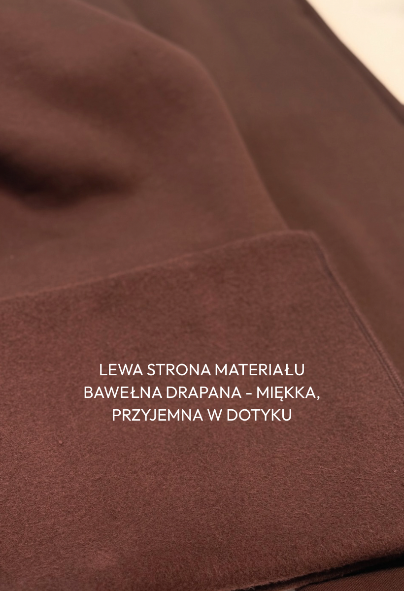 Słodkie jak ulubiona filiżanka gorącej czekolady — szerokie spodnie dresowe Choco otulają miękkością i sprawiają, że każdy dzień nabiera przyjemnego rytmu. Wykonane z drapanej od wewnątrz bawełny z certyfikatem OEKO-TEX Standard 100, są wyjątkowo komfortowe i miłe w dotyku. Szeroka nogawka nadaje im nowoczesnej elegancji, a elastyczna talia i kieszenie po bokach czynią je praktycznym wyborem na co dzień. To spodnie, które łączą wygodę z wyrafinowaniem. Idealne do stworzenia słodkiego monolooku z bluzą Choco z kapturem i tłoczonym logo LK z przodu lub bluzą Choco rozpinaną z kapturem i tłoczonym logo LK z tyłu.