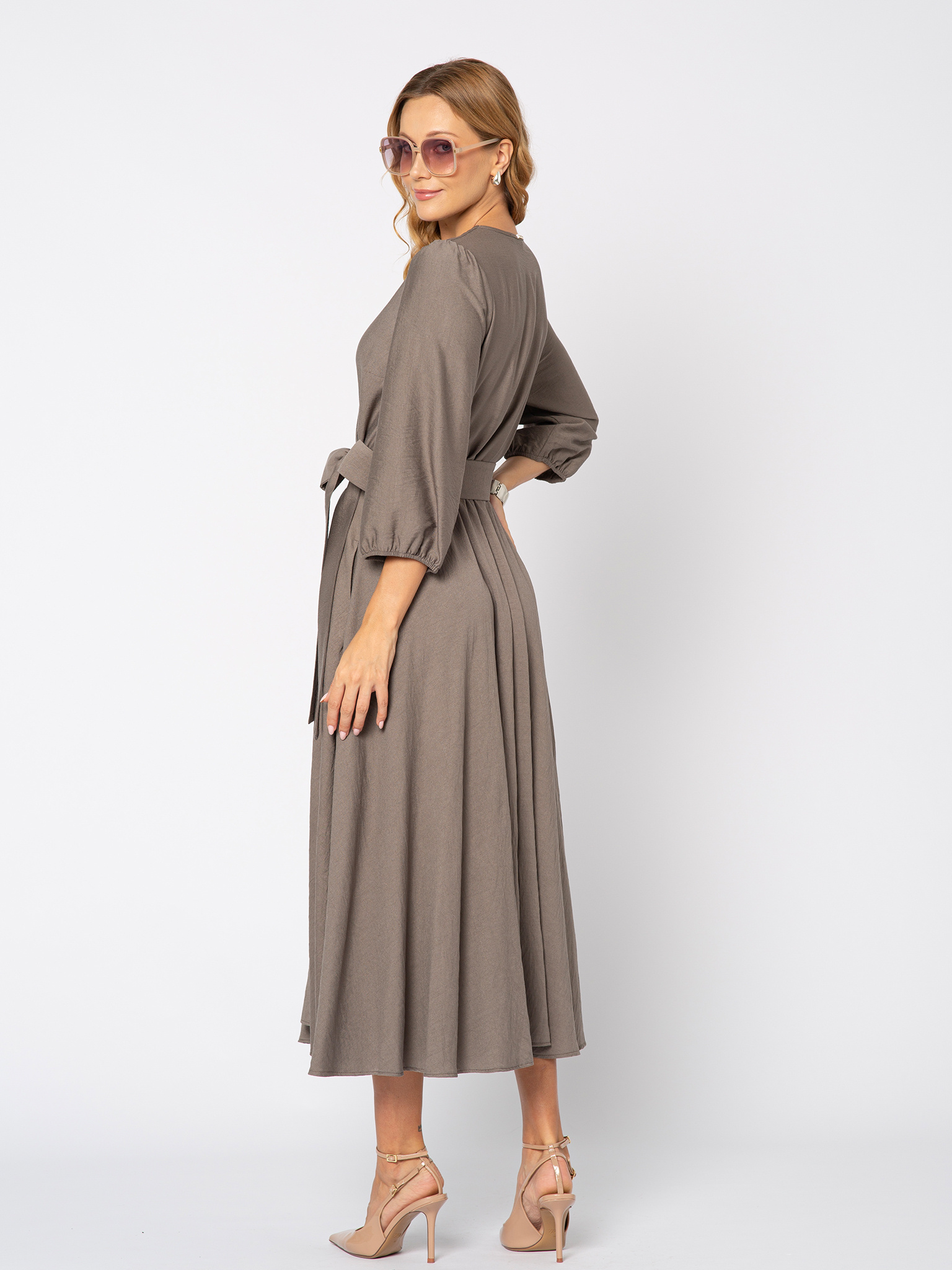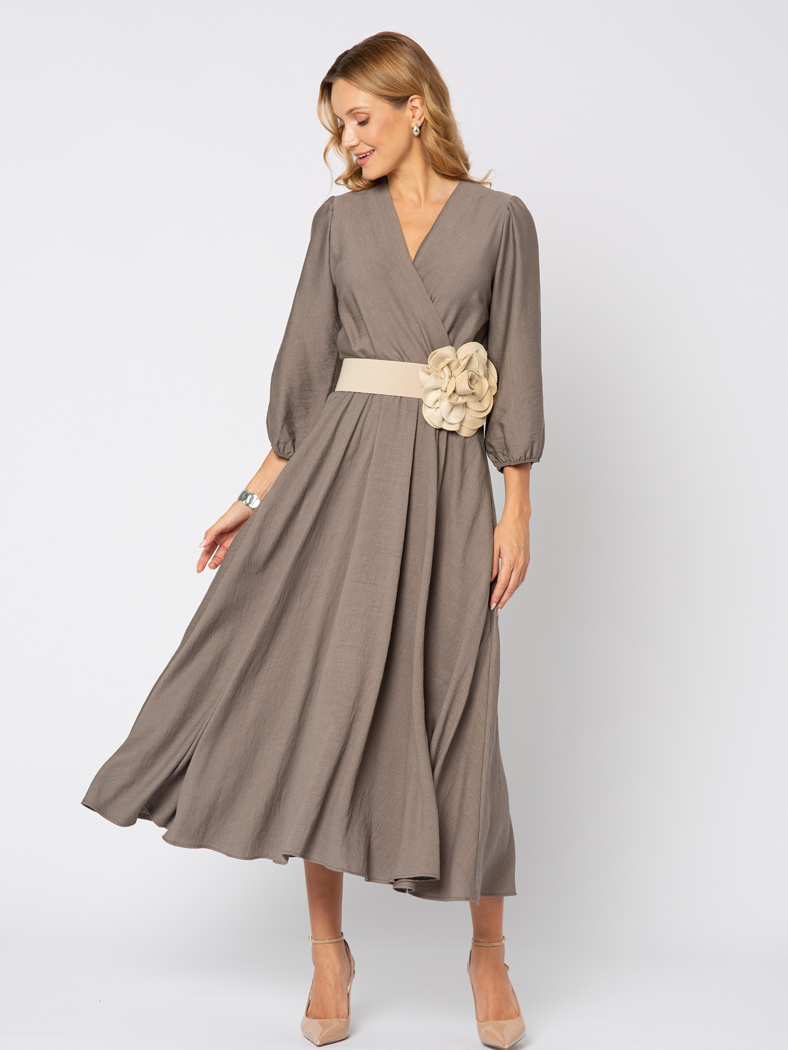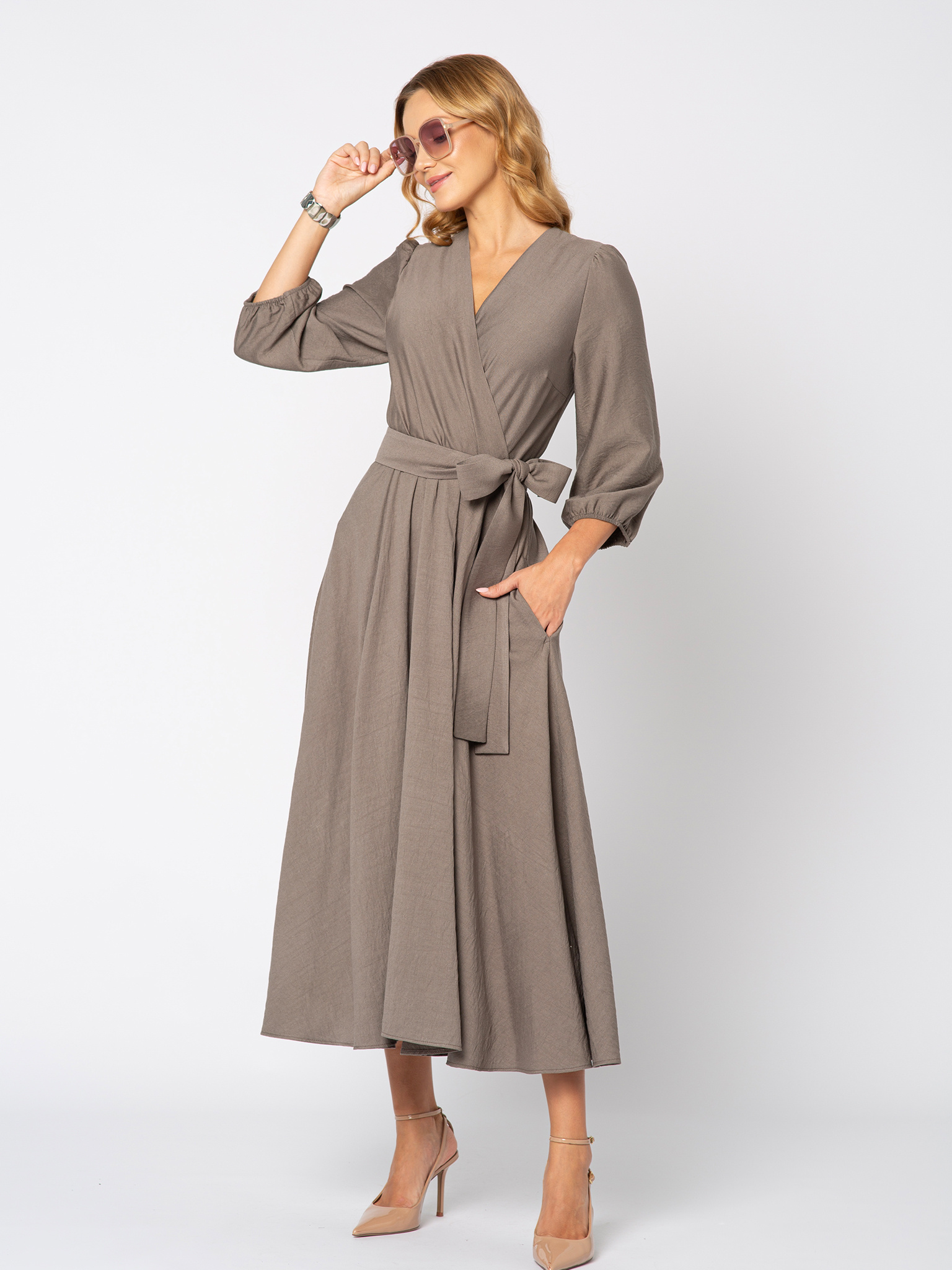 Kwintesencja stylu i ponadprzeciętnej elegancji. Jeśli lubisz ponadczasowe, uniwersalne fasony i kolory to ta sukienka jest właśnie dla Ciebie. Klasyczny krój, kopertowy dekolt, rozkloszowana spódnica, pięknie zachowująca się w ruchu. Wyjątkowym atutem tej sukienki są umieszone po bokach kieszenie, które każda z nas uwielbia. W talii przewiązywana jest paskiem z tego samego materiału, dzięki czemu idealnie podkreślona zostaje kobieca sylwetka. Pasek można uformować w kokardę, bądź tylko przewiązać. Wykonana z bardzo przyjemnego dla ciała materiału, 85% wiskoza, 15% nylon, wręcz wydaje się płynąć w ruch, dodatkowo pięknie odbija światło.  Amelie to sukienka baza, która uzupełniona o odpowiednie dodatki zapewni Ci kreację zarówno na wieczór, ale do pracy, czy na spotkanie z przyjaciółmi.