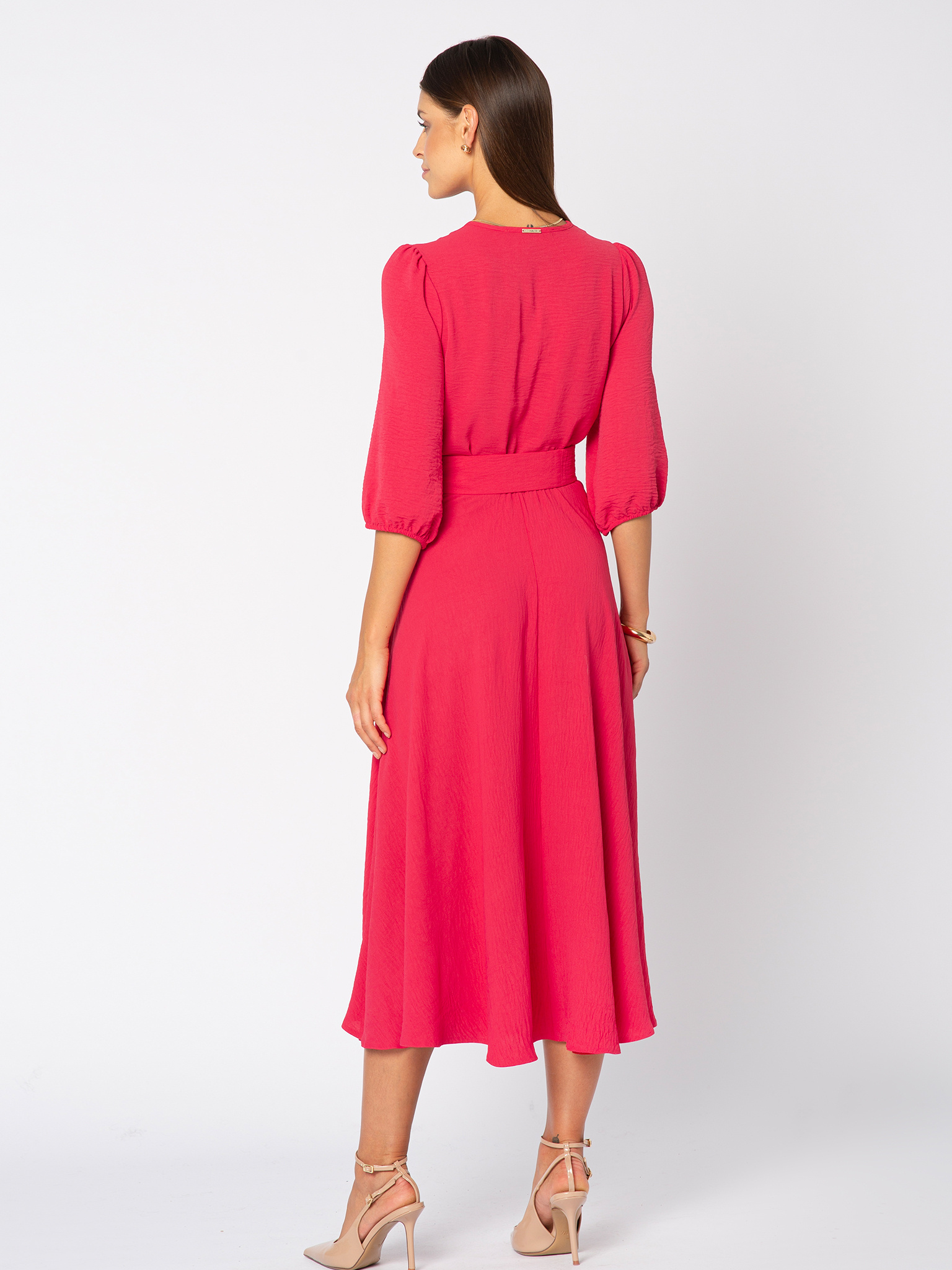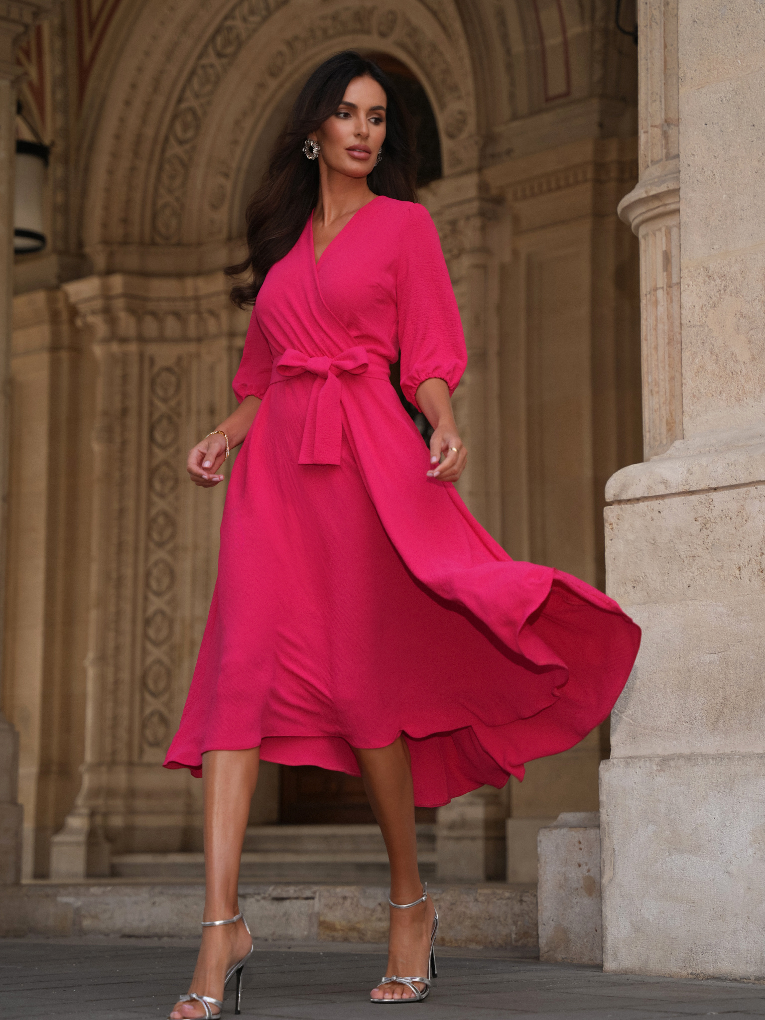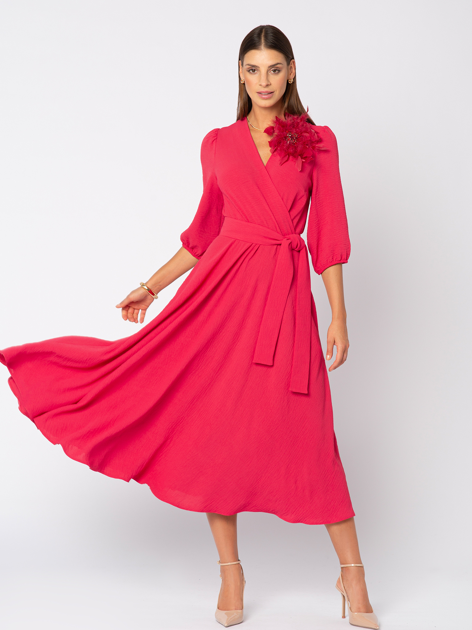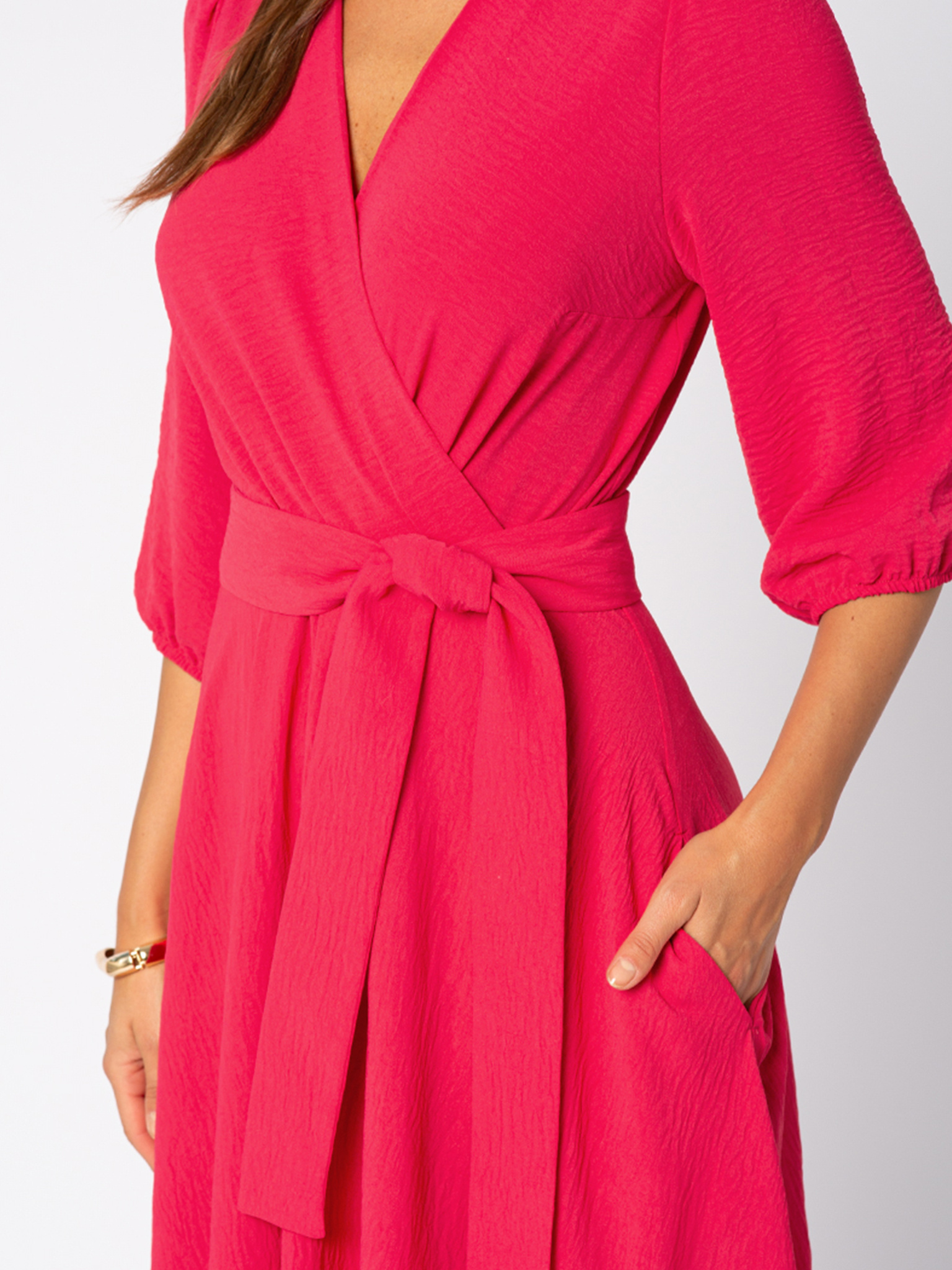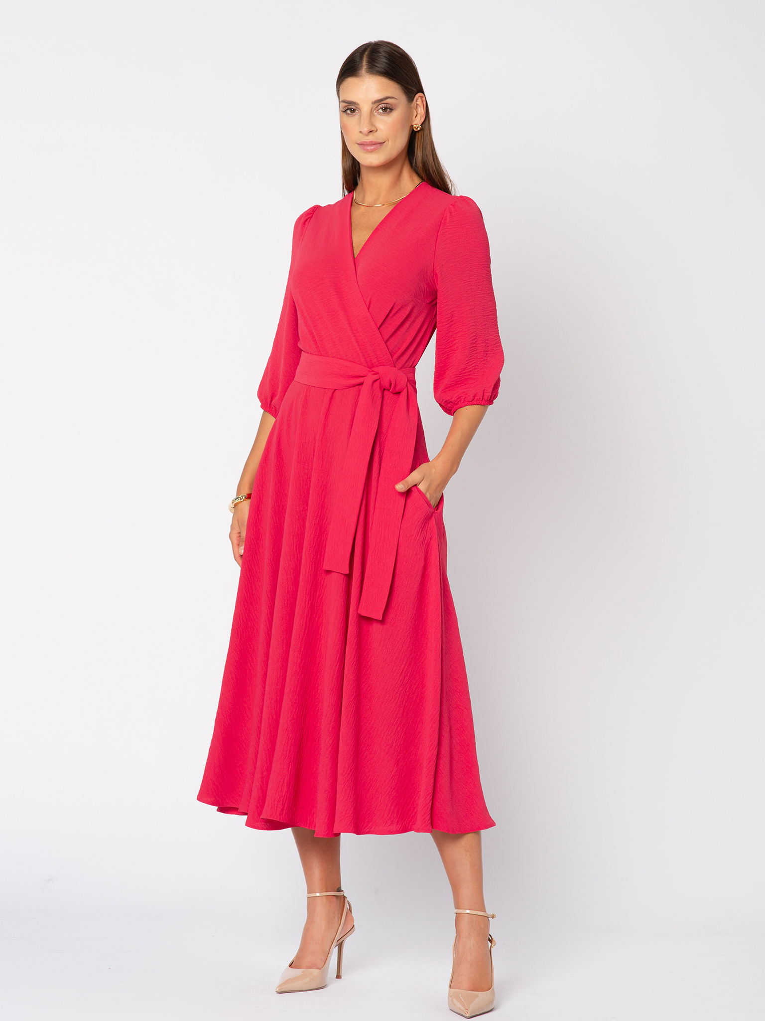 Malinowa Ophélie to radosny akcent jesieni — soczysty, energetyczny kolor, który dodaje świeżości klasycznemu fasonowi. Idealna, gdy chcesz rozświetlić jesienne dni i poczuć się jak bohaterka filmu rozgrywającego się na ulicach Montmartre. Sukienka Ophélie to kwintesencja paryskiej elegancji w jesiennym wydaniu. Ponadczasowy kopertowy dekolt, rozkloszowana spódnica pięknie układająca się w ruchu oraz przewiązywany w talii pasek podkreślający kobiecą sylwetkę sprawiają, że to sukienka, która nigdy nie wychodzi z mody. Dodatkowym atutem są praktyczne kieszenie, które nadają jej nowoczesnego charakteru i luzu à la Parisienne. Wykonana z lekkiej, delikatnej dla skóry tkaniny o subtelnie pomarszczonej fakturze, nie gniecie się i zawsze wygląda perfekcyjnie. Wystarczy zmienić dodatki, by w jednej chwili stała się kreacją na wieczór, do pracy czy na spotkanie z przyjaciółmi.