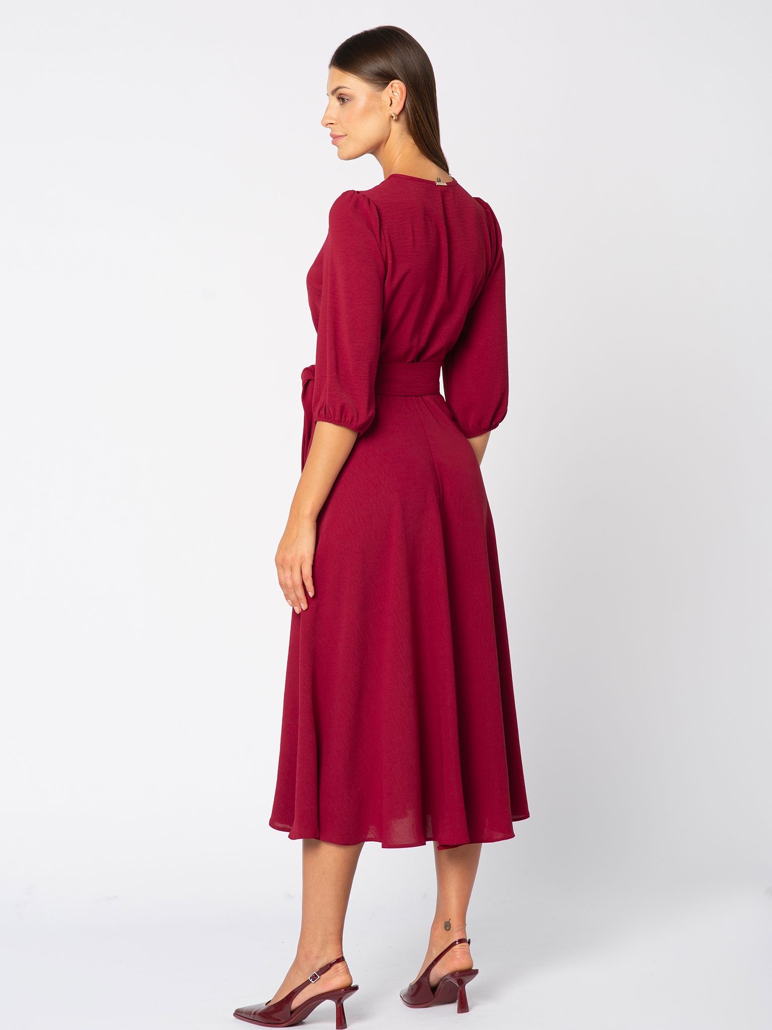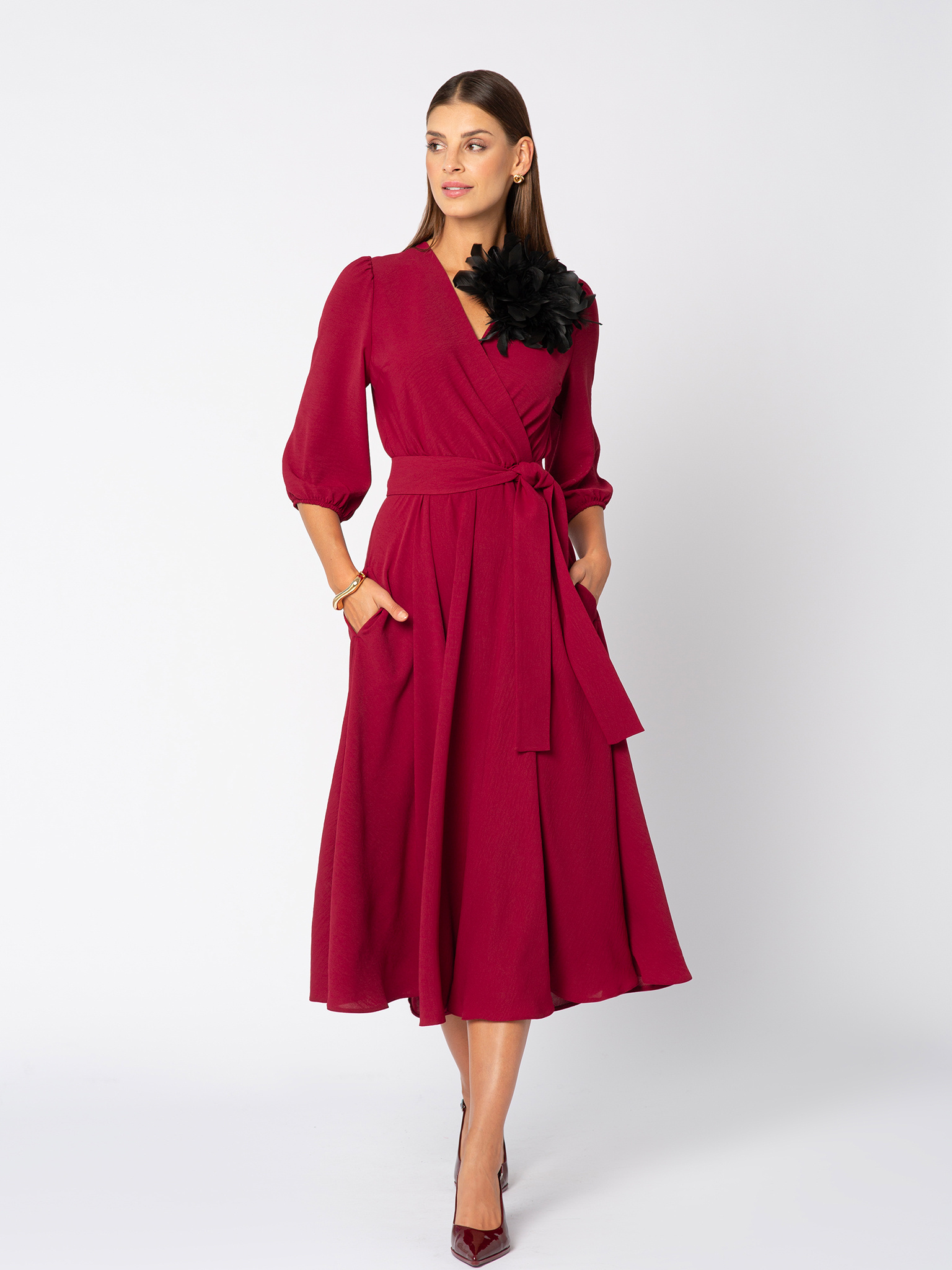 • Nasycona i elegancka, niczym kieliszek Bordeaux degustowany w paryskiej restauracji. Ten odcień podkreśla wyrafinowany charakter sukienki, czyniąc ją idealnym wyborem na wieczorne wyjścia i wyjątkowe okazje. Broszka sprzedawana jest oddzielnie.