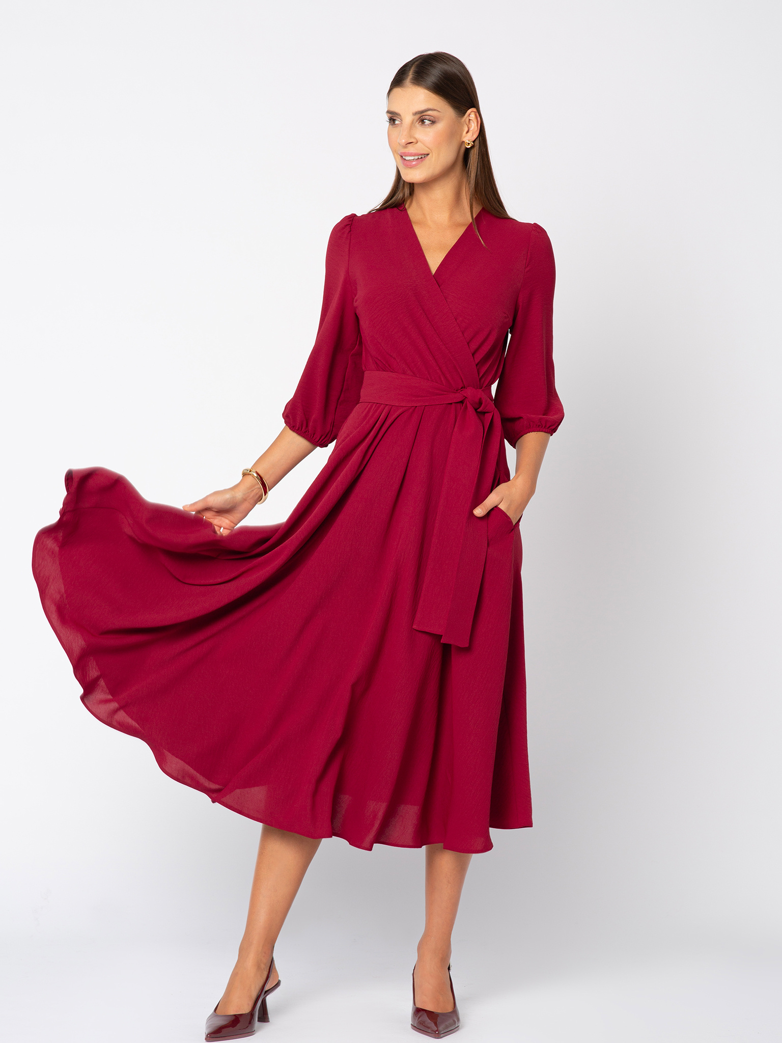Nasycona i elegancka, niczym kieliszek Bordeaux degustowany w paryskiej restauracji. Ten odcień podkreśla wyrafinowany charakter sukienki, czyniąc ją idealnym wyborem na wieczorne wyjścia i wyjątkowe okazje. Sukienka Ophélie to kwintesencja paryskiej elegancji w jesiennym wydaniu. Ponadczasowy kopertowy dekolt, rozkloszowana spódnica pięknie układająca się w ruchu oraz przewiązywany w talii pasek podkreślający kobiecą sylwetkę sprawiają, że to sukienka, która nigdy nie wychodzi z mody. Dodatkowym atutem są praktyczne kieszenie, które nadają jej nowoczesnego charakteru i luzu à la Parisienne. Wykonana z lekkiej, delikatnej dla skóry tkaniny o subtelnie pomarszczonej fakturze, nie gniecie się i zawsze wygląda perfekcyjnie. Wystarczy zmienić dodatki, by w jednej chwili stała się kreacją na wieczór, do pracy czy na spotkanie z przyjaciółmi.