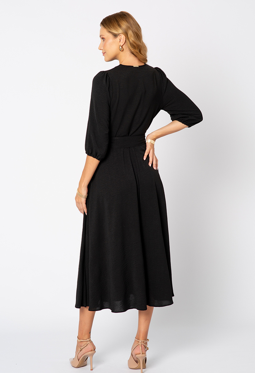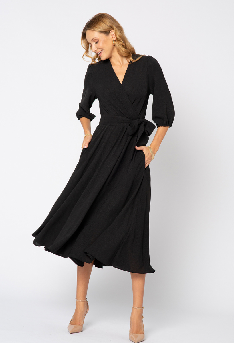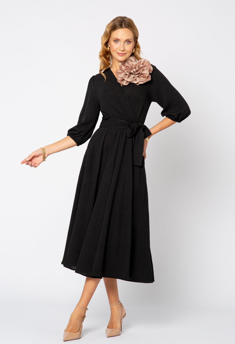 Czerń w wersji paryskiej to zawsze symbol absolutnej elegancji. Kwintesencja stylu — sukienka, która sprawdzi się w każdej sytuacji, od biura po wieczorną kolację, zawsze nadając lookowi klasy i paryskiego szyku. Ponadczasowy kopertowy dekolt, rozkloszowana spódnica pięknie układająca się w ruchu oraz przewiązywany w talii pasek podkreślający kobiecą sylwetkę sprawiają, że to sukienka, która nigdy nie wychodzi z mody. Dodatkowym atutem są praktyczne kieszenie, które nadają jej nowoczesnego charakteru i luzu à la Parisienne. Wykonana z lekkiej, delikatnej dla skóry tkaniny o subtelnie pomarszczonej fakturze, nie gniecie się i zawsze wygląda perfekcyjnie. Wystarczy zmienić dodatki, by w jednej chwili stała się kreacją na wieczór, do pracy czy na spotkanie z przyjaciółmi.