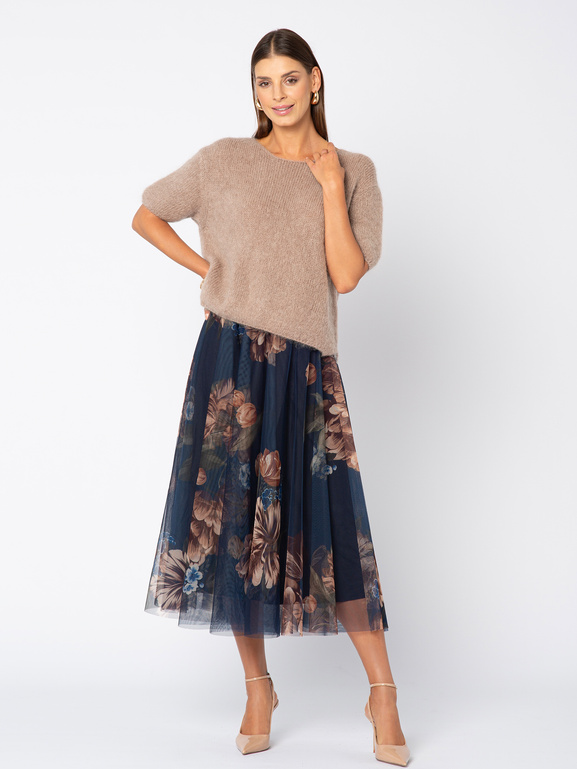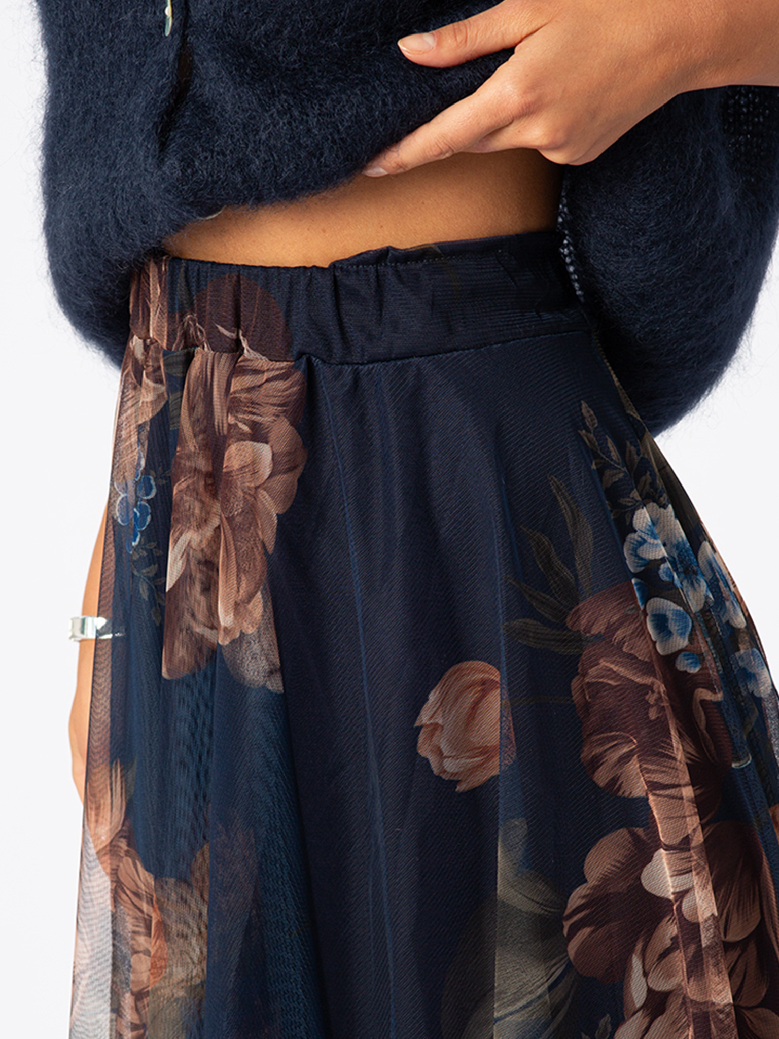 Tiulowa spódnica w kwiaty otula lekkością i kobiecym wdziękiem. Gumka w talii subtelnie modeluje sylwetkę, a rozkloszowany krój i idealnie dopasowana podszewka tworzą efekt trójwymiarowości przy każdym ruchu. Długość za kolano dodaje elegancji. Rozmiar one size sprawia, że pasuje na sylwetki od S do L.