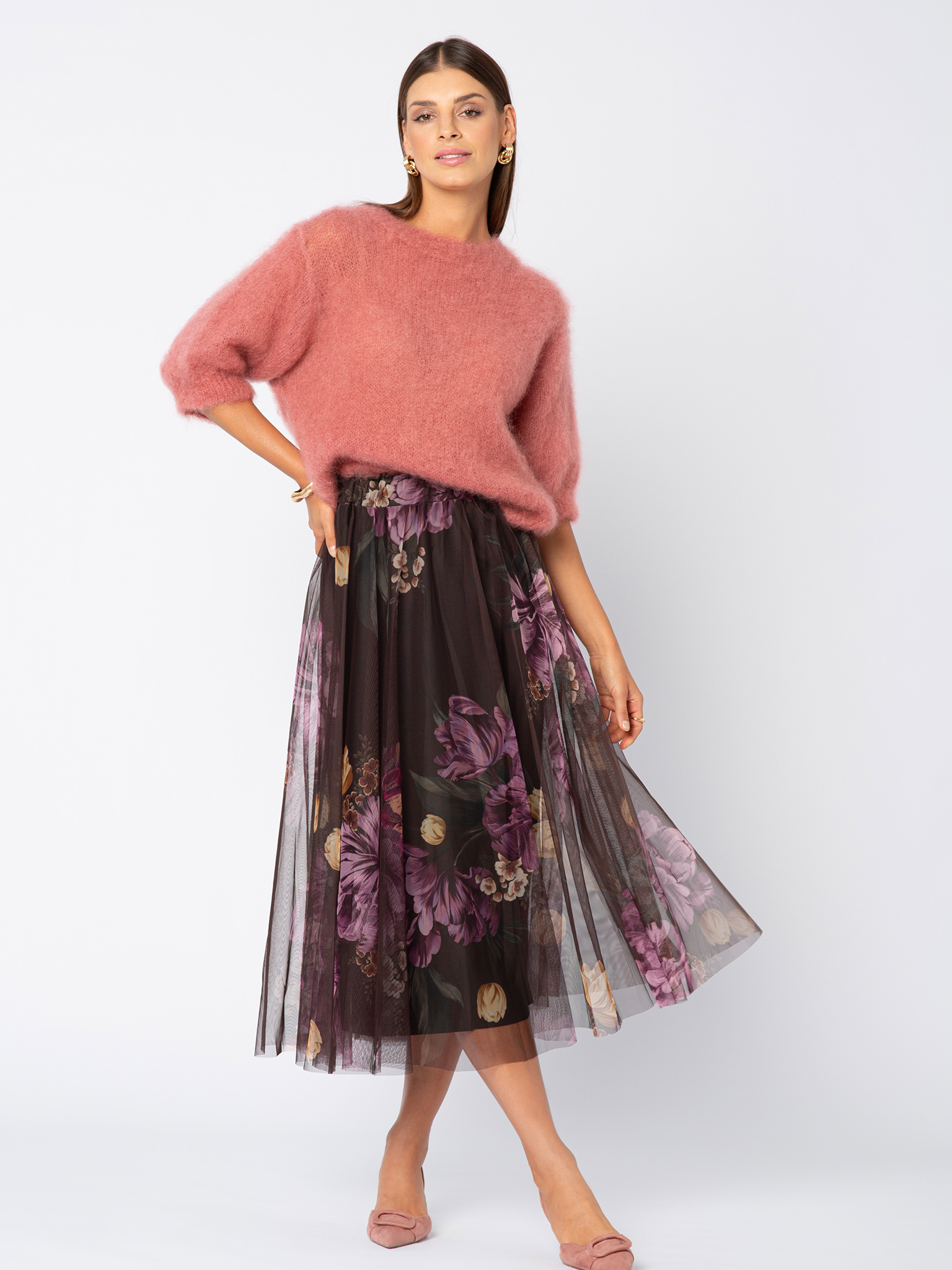 Tiulowa spódnica w kwiaty otula lekkością i kobiecym wdziękiem. Gumka w talii subtelnie modeluje sylwetkę, a rozkloszowany krój i idealnie dopasowana podszewka tworzą efekt trójwymiarowości przy każdym ruchu. Długość za kolano dodaje elegancji. Rozmiar one size sprawia, że pasuje na sylwetki od S do L.