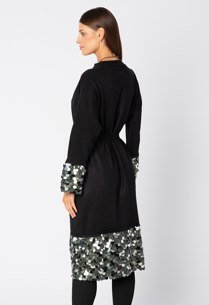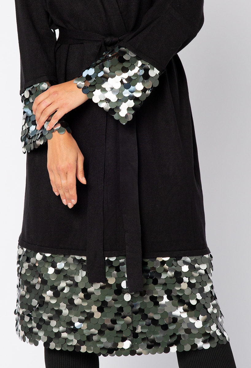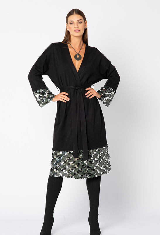 Zmysłowy i pełen blasku — długi kardigan w kimonowym kroju to nieoczywiste połączenie komfortu z nutą glamour. Wstawki z dużych cekinów tworzą efektowny pas na dole i na zakończeniu rozkloszowanych rękawów, sprawiając, że każdy ruch przyciąga spojrzenia. Przewiązywany w talii paskiem, pięknie podkreśla sylwetkę, pozostając jednocześnie lekki i otulający. To model, który sprawdzi się zarówno podczas wieczornego wyjścia, jak i wtedy, gdy w domowym zaciszu chcesz poczuć się wyjątkowo i pełna blasku.