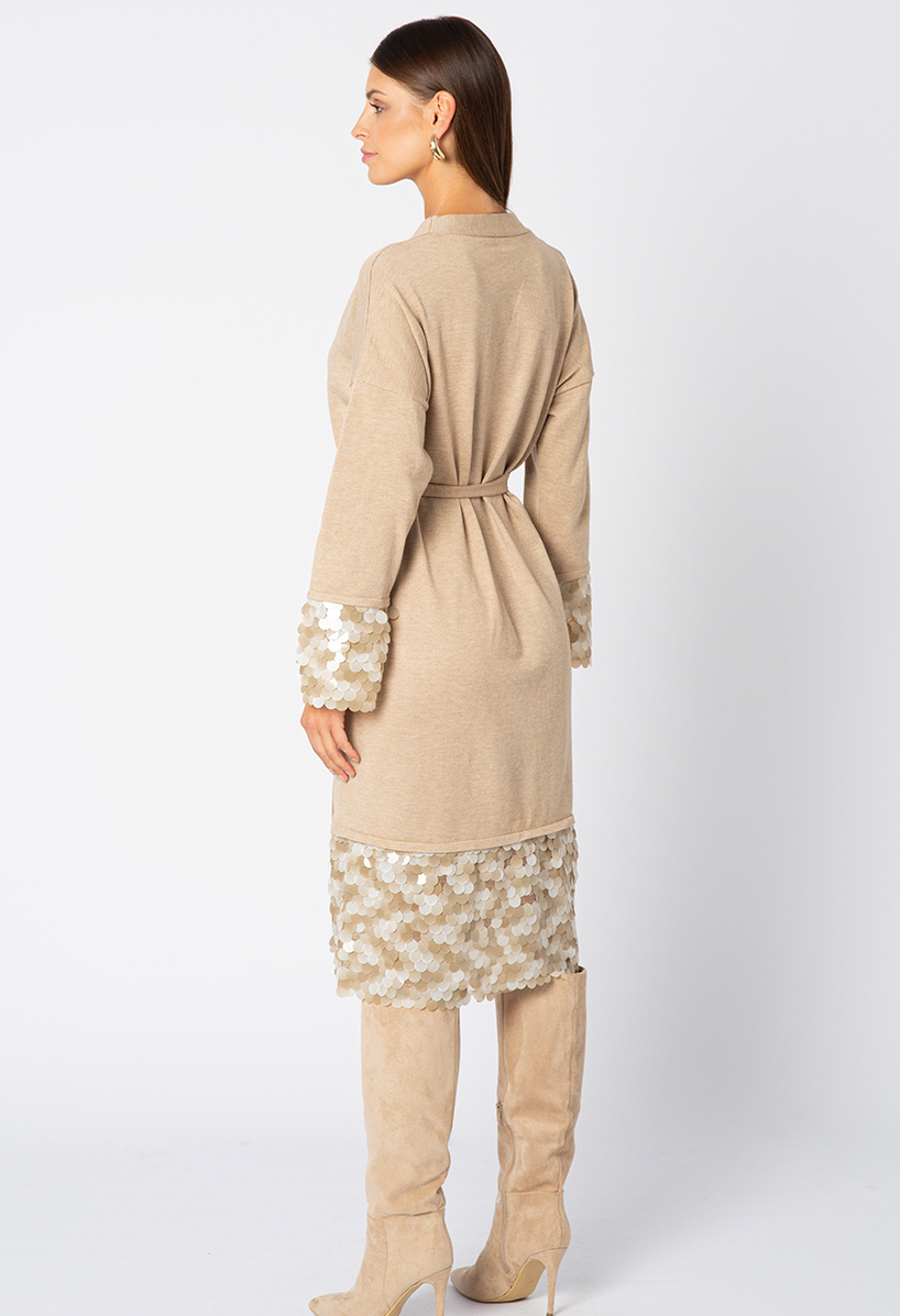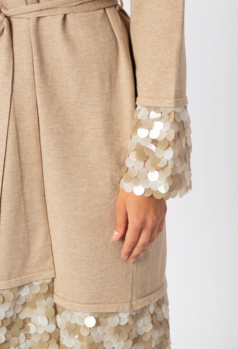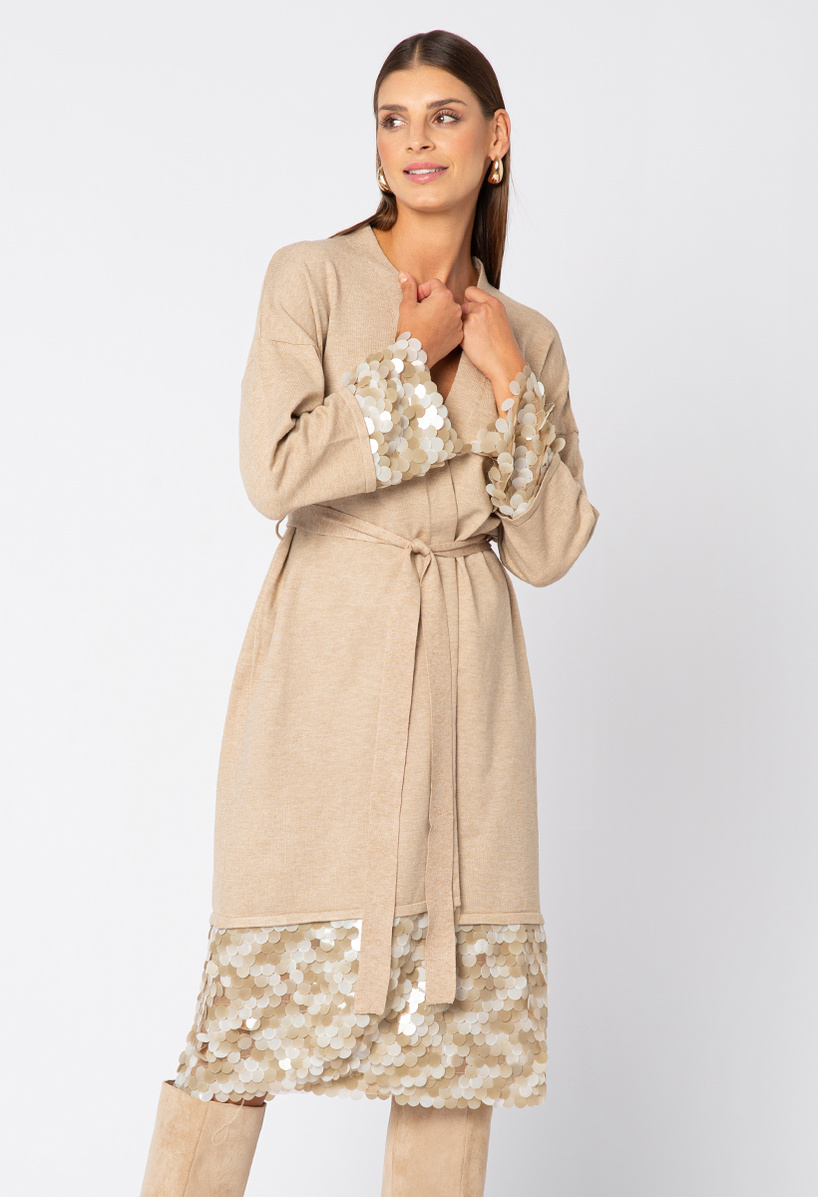 Zmysłowy i pełen blasku — długi kardigan w kimonowym kroju to nieoczywiste połączenie komfortu z nutą glamour. Wstawki z dużych cekinów tworzą efektowny pas na dole i na zakończeniu rozkloszowanych rękawów, sprawiając, że każdy ruch przyciąga spojrzenia. Przewiązywany w talii paskiem, pięknie podkreśla sylwetkę, pozostając jednocześnie lekki i otulający. To model, który sprawdzi się zarówno podczas wieczornego wyjścia, jak i wtedy, gdy w domowym zaciszu chcesz poczuć się wyjątkowo i pełna blasku.