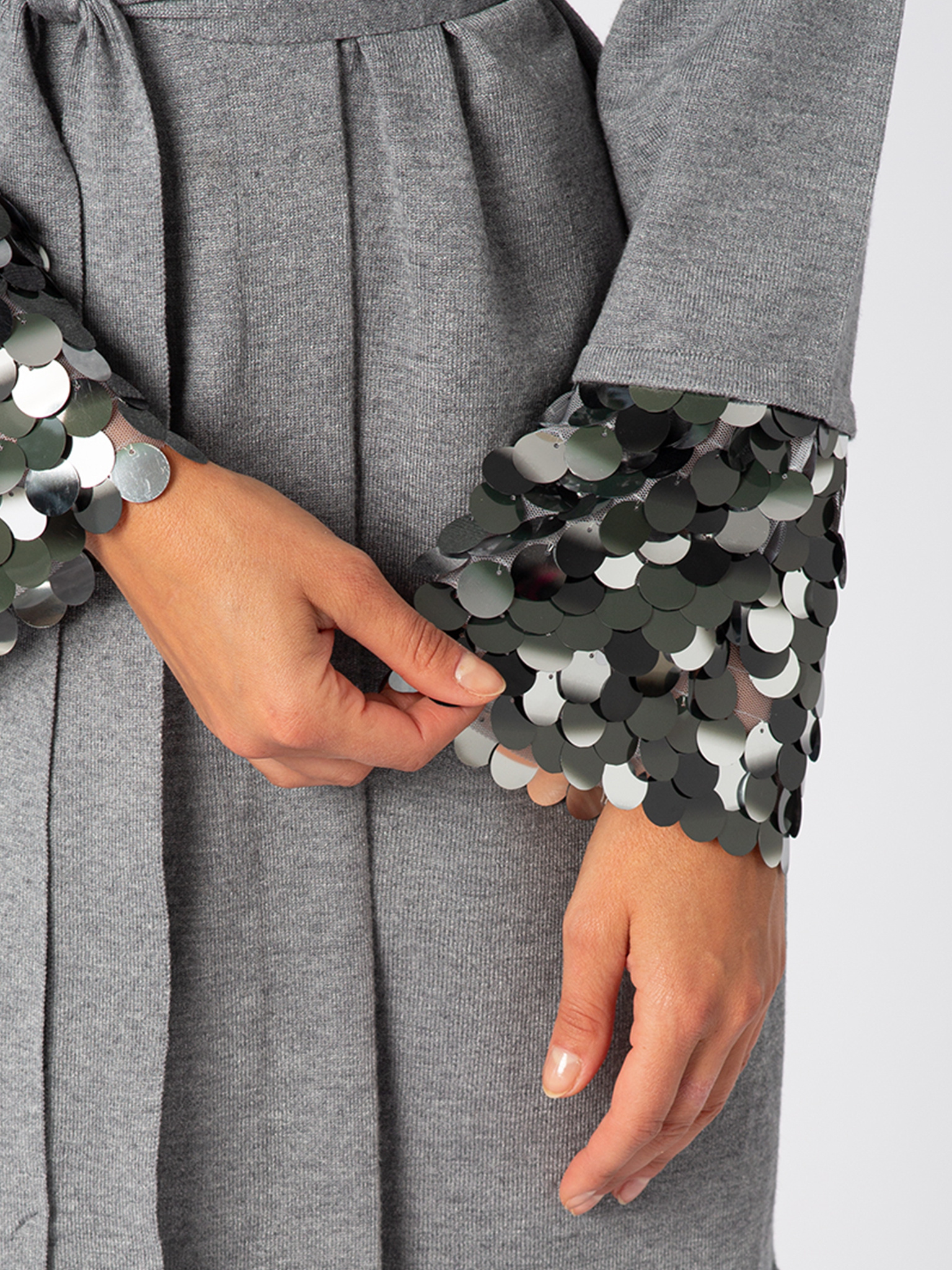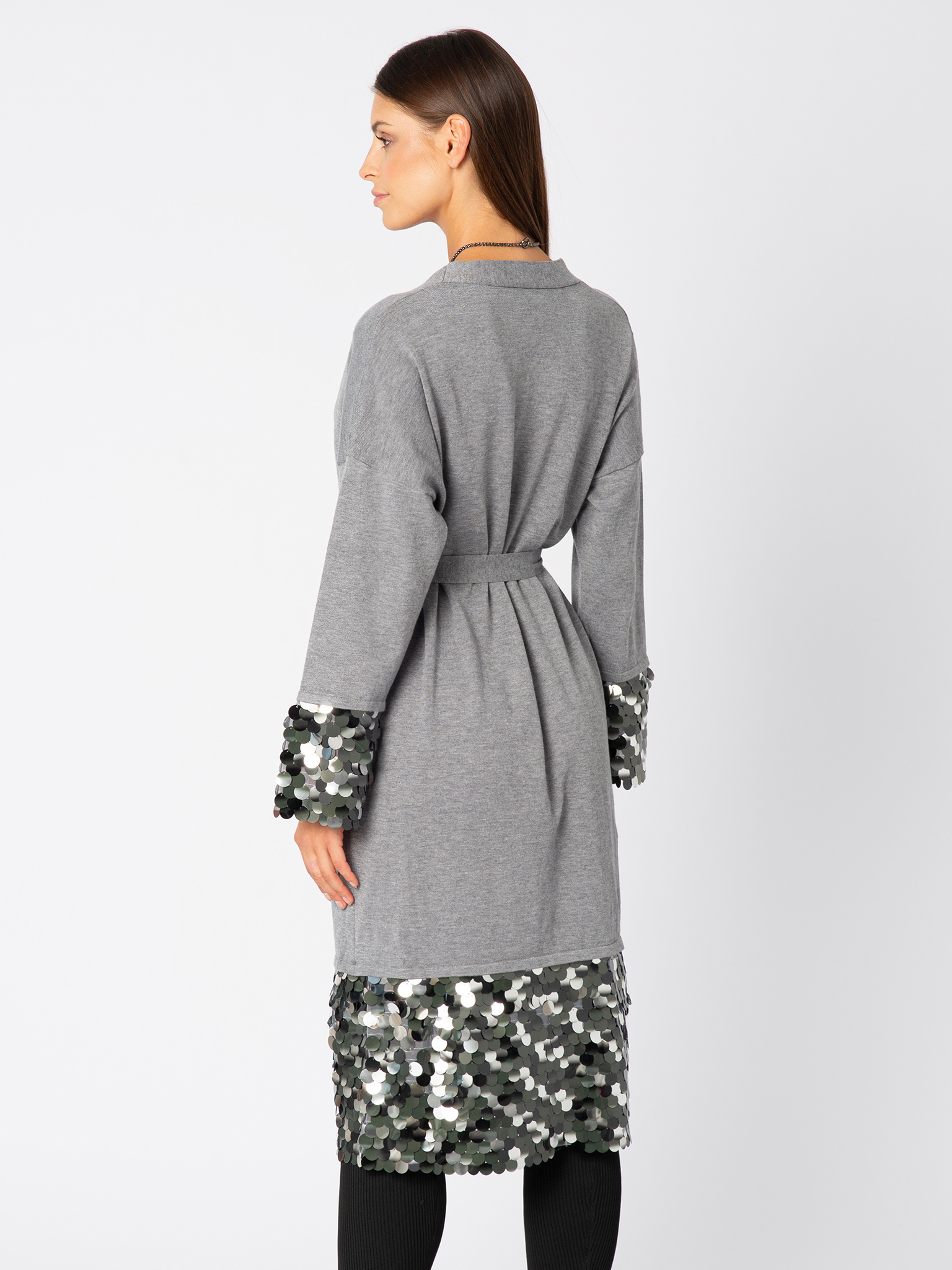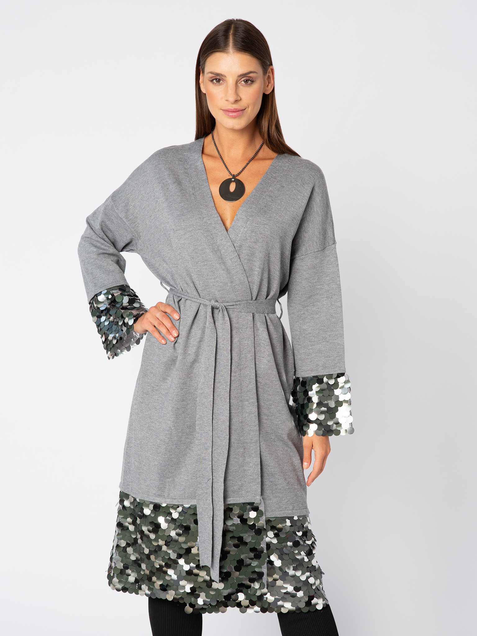Zmysłowy i pełen blasku — długi kardigan w kimonowym kroju to nieoczywiste połączenie komfortu z nutą glamour. Wstawki z dużych cekinów tworzą efektowny pas na dole i na zakończeniu rozkloszowanych rękawów, sprawiając, że każdy ruch przyciąga spojrzenia. Przewiązywany w talii paskiem, pięknie podkreśla sylwetkę, pozostając jednocześnie lekki i otulający. To model, który sprawdzi się zarówno podczas wieczornego wyjścia, jak i wtedy, gdy w domowym zaciszu chcesz poczuć się wyjątkowo i pełna blasku.